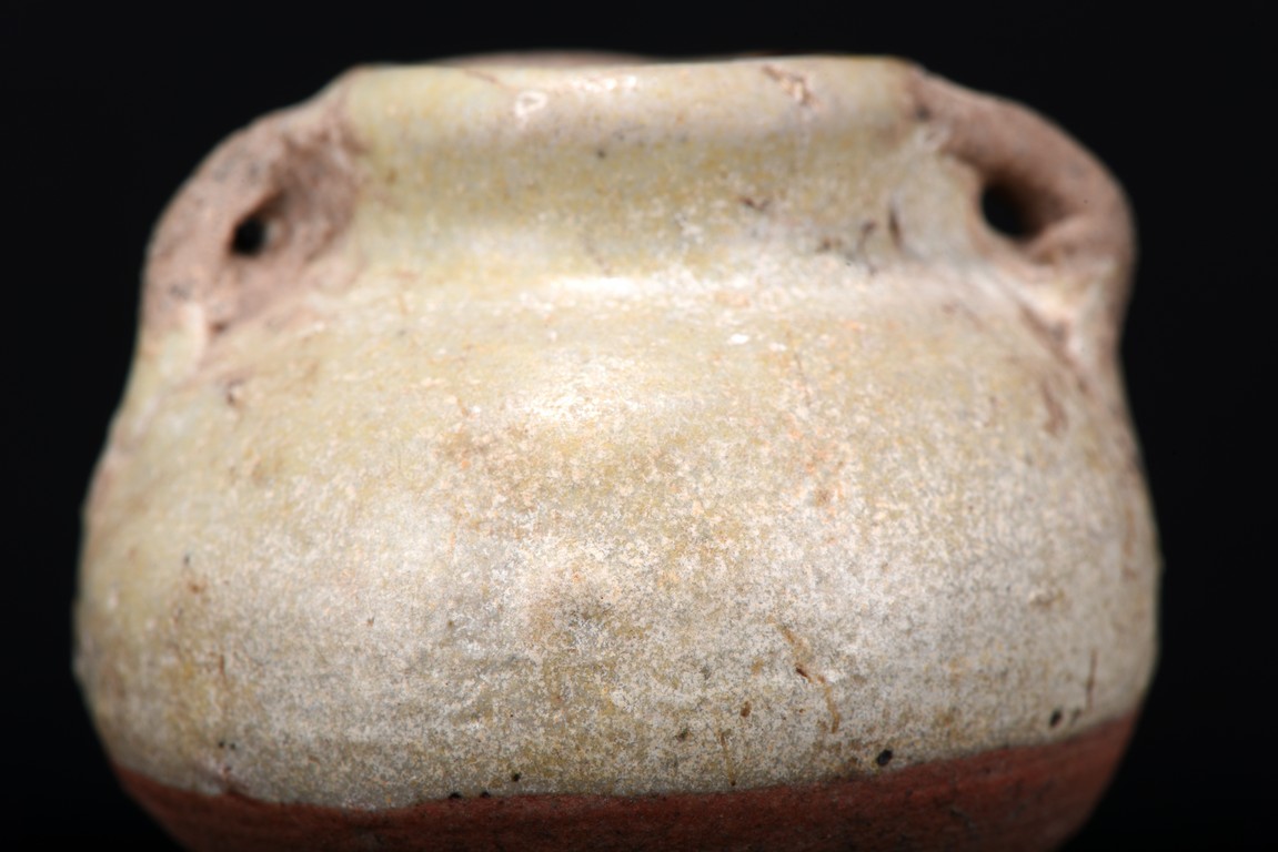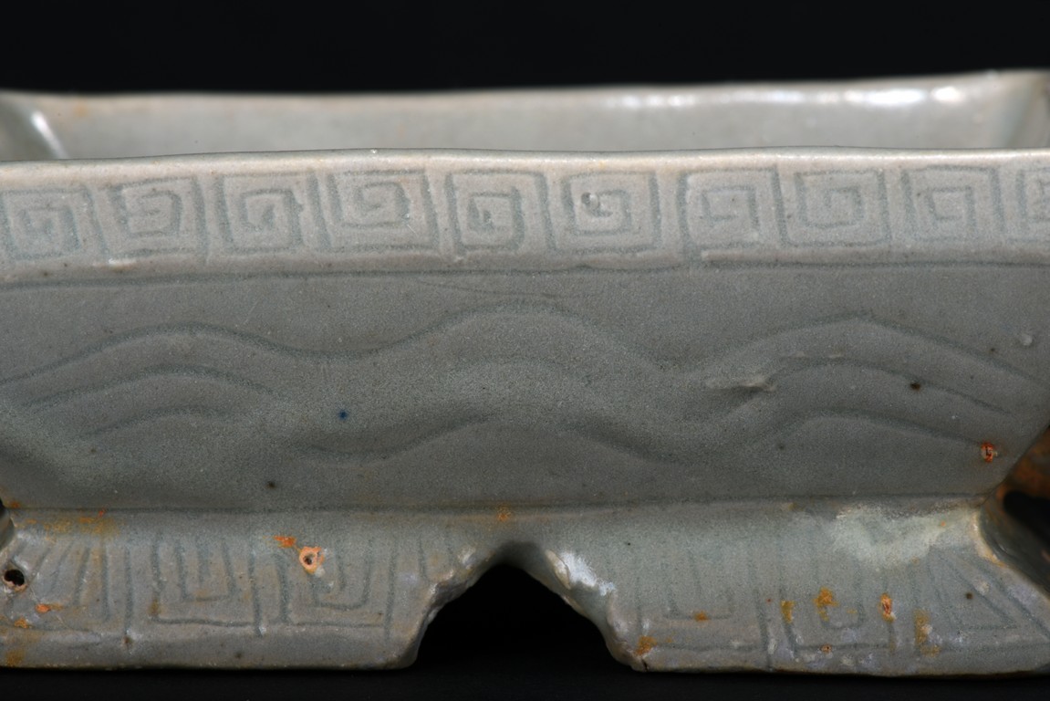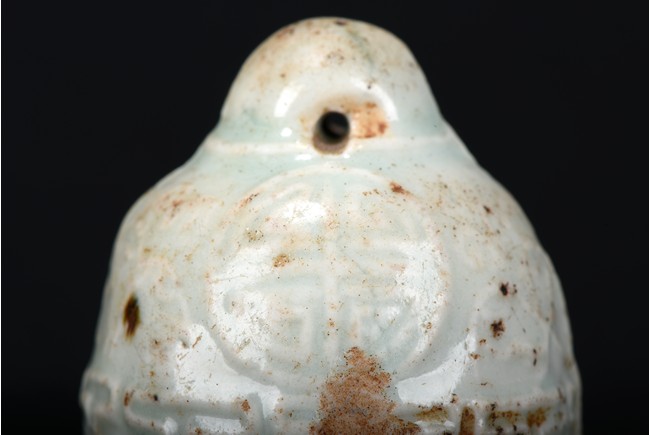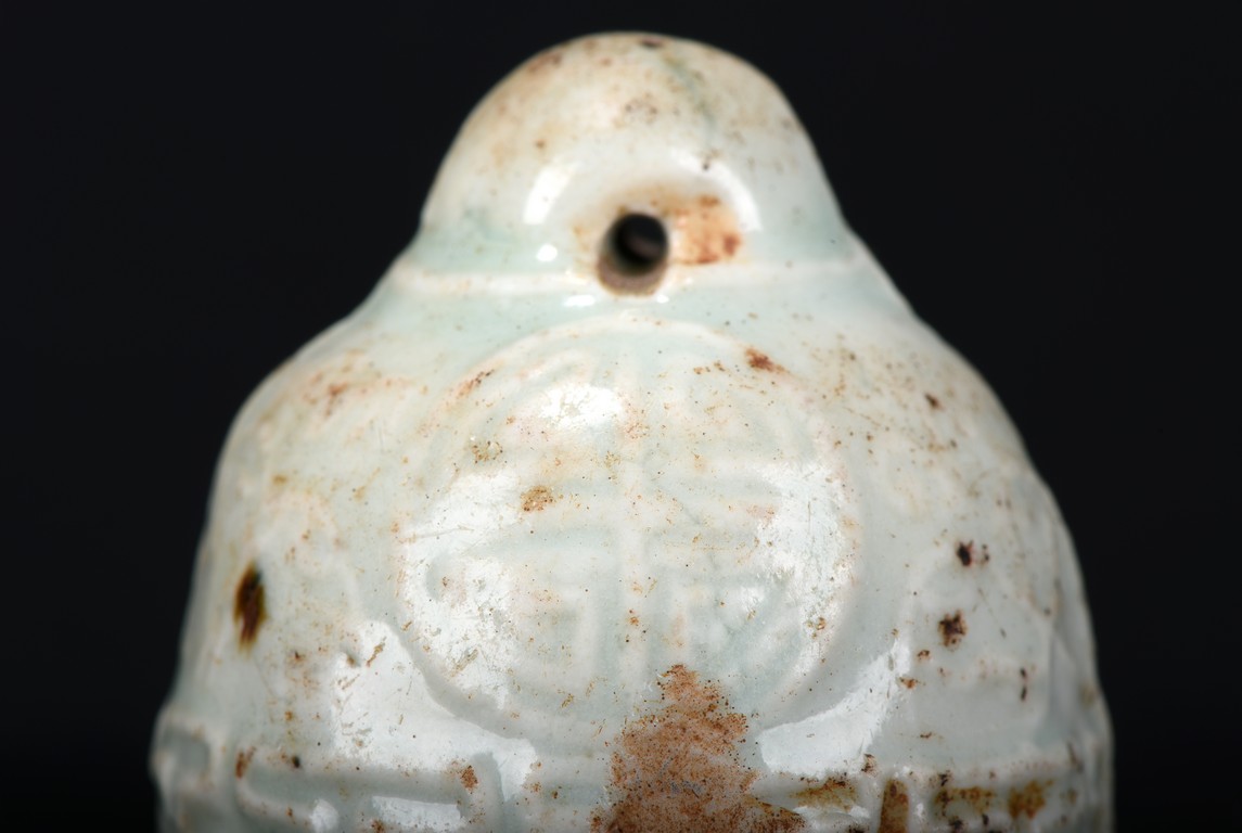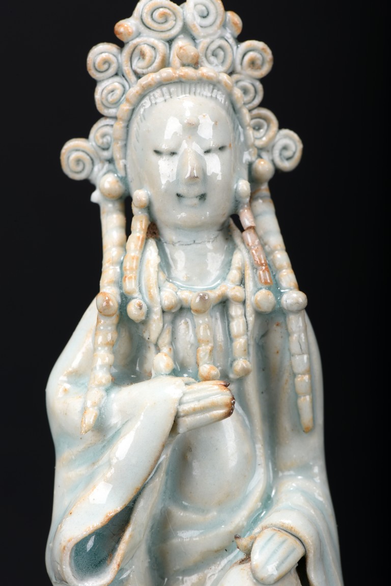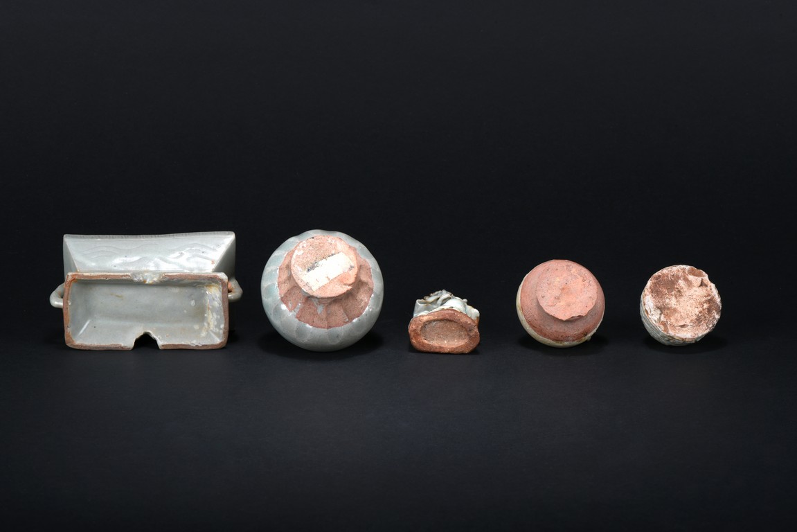 Consisting of an blanc-de-chine guanyin figure, an archaistic celadon vessel, two glazed two-ear jars, and an celadon weight. Ming Dynasty period.