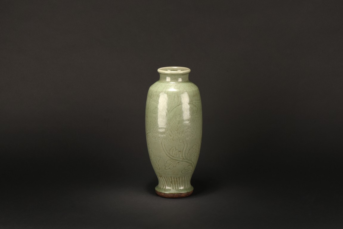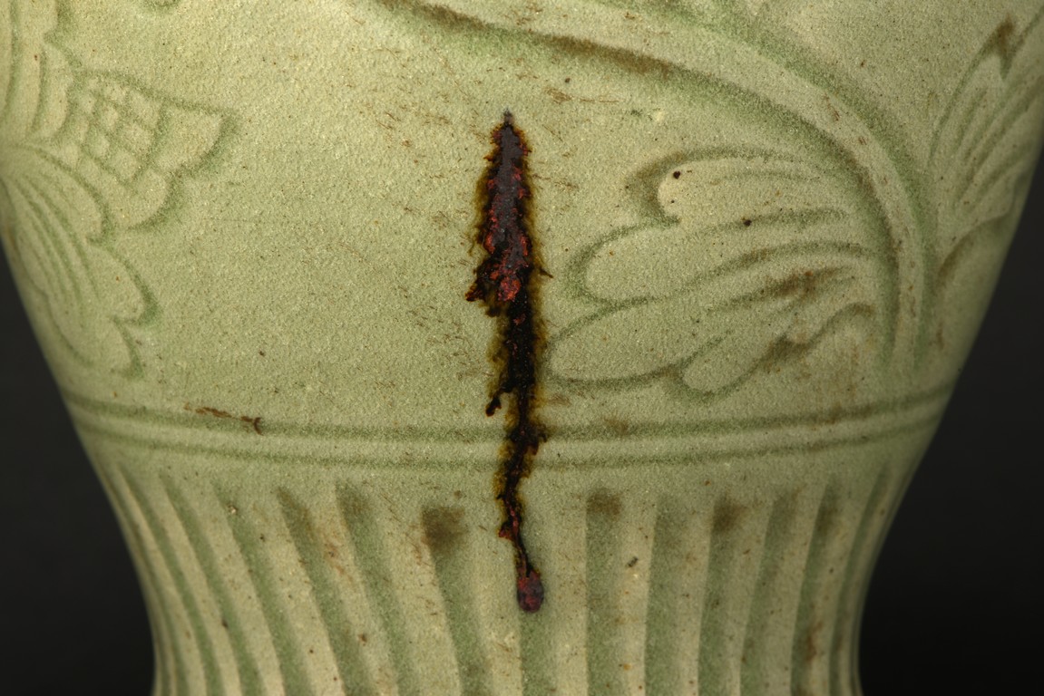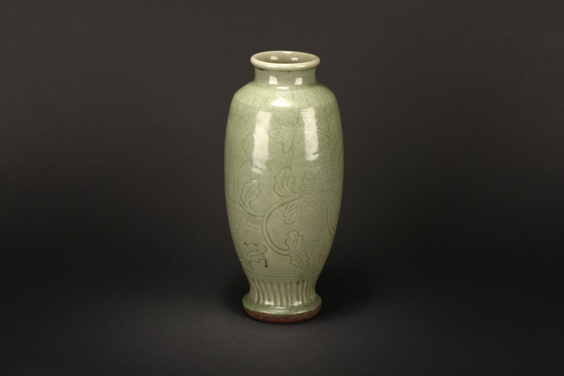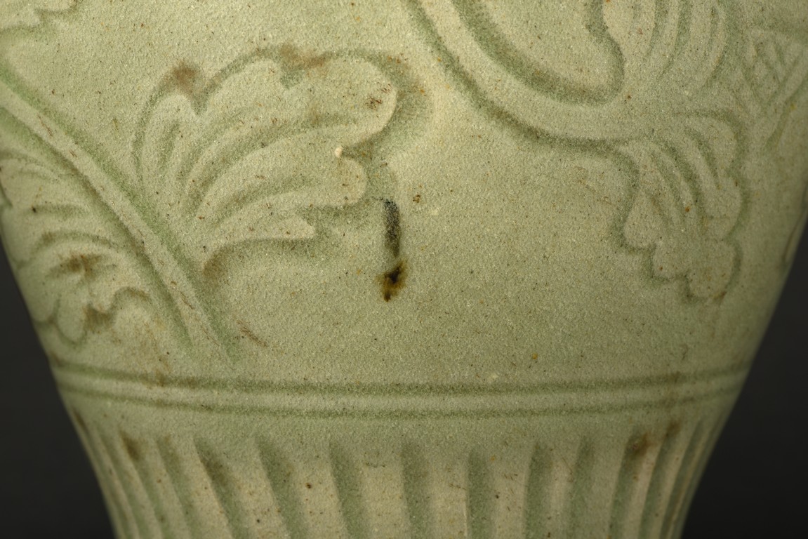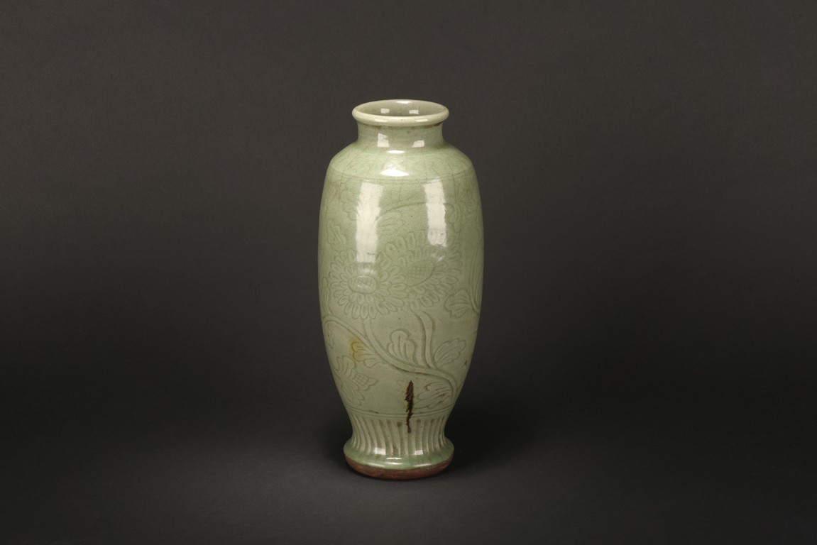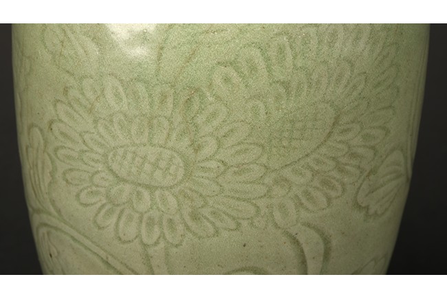 Of cylindrical from, the vase raised on spreading foot, covered overall with in celadon glaze with russet crackle patterns and moulded with floral design. Qing Dynasty period.