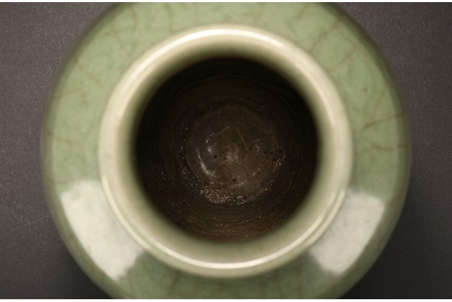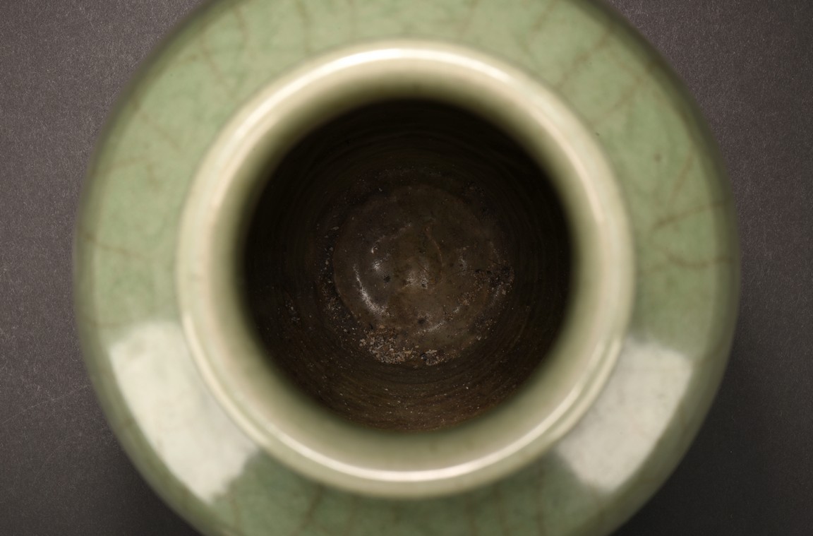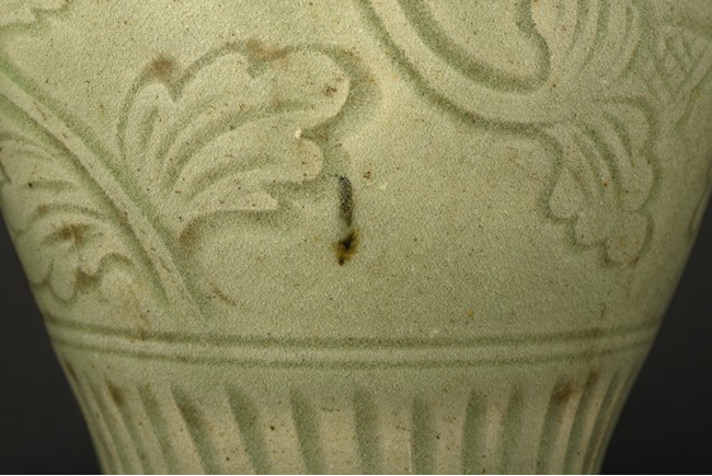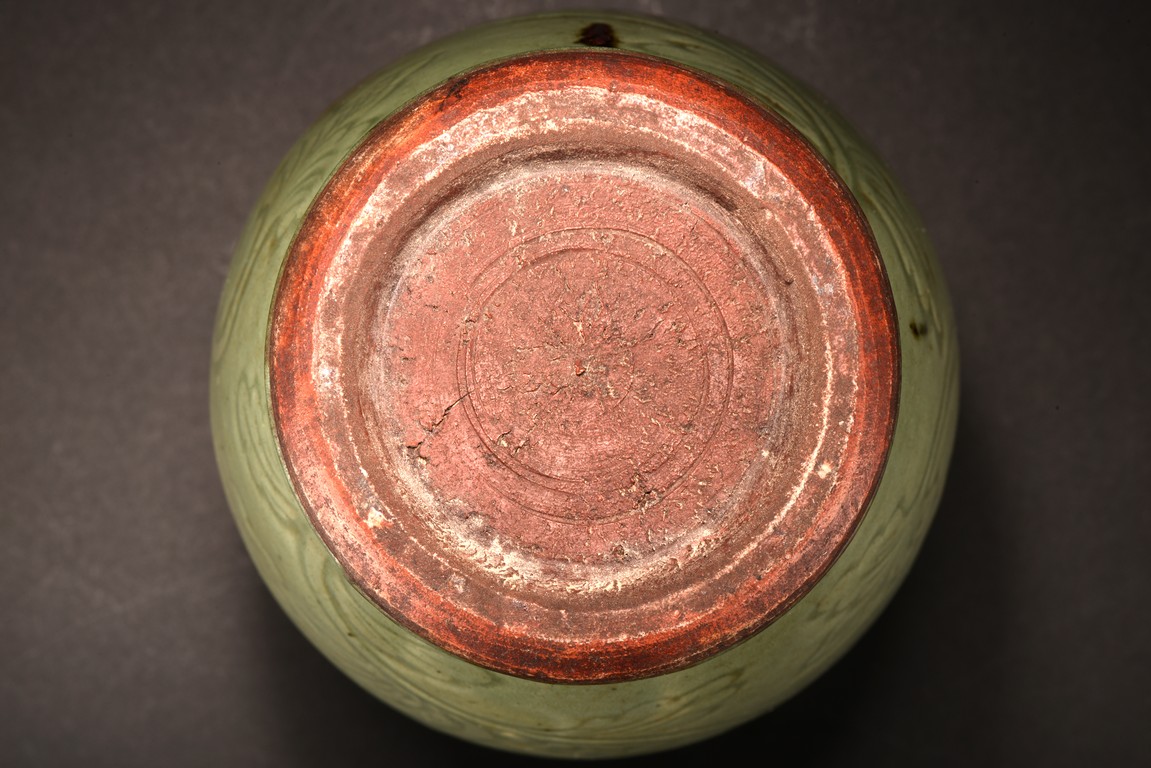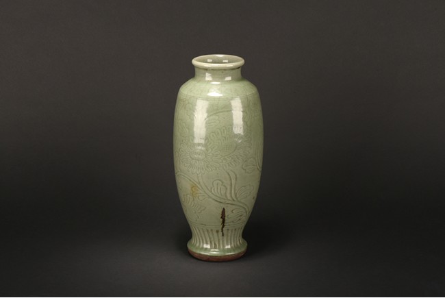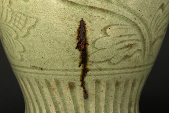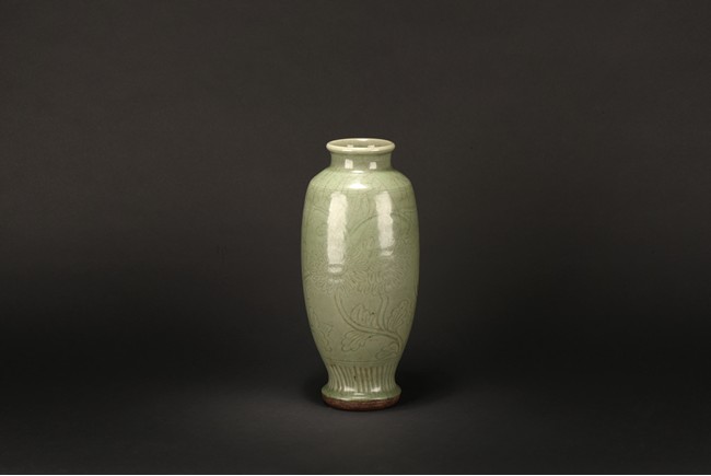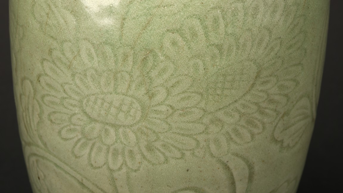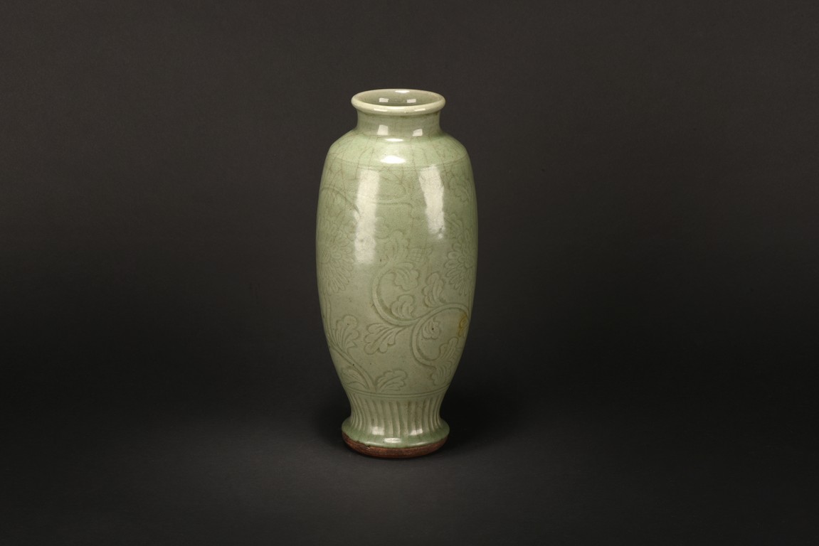 Of cylindrical from, the vase raised on spreading foot, covered overall with in celadon glaze with russet crackle patterns and moulded with floral design. Qing Dynasty period.