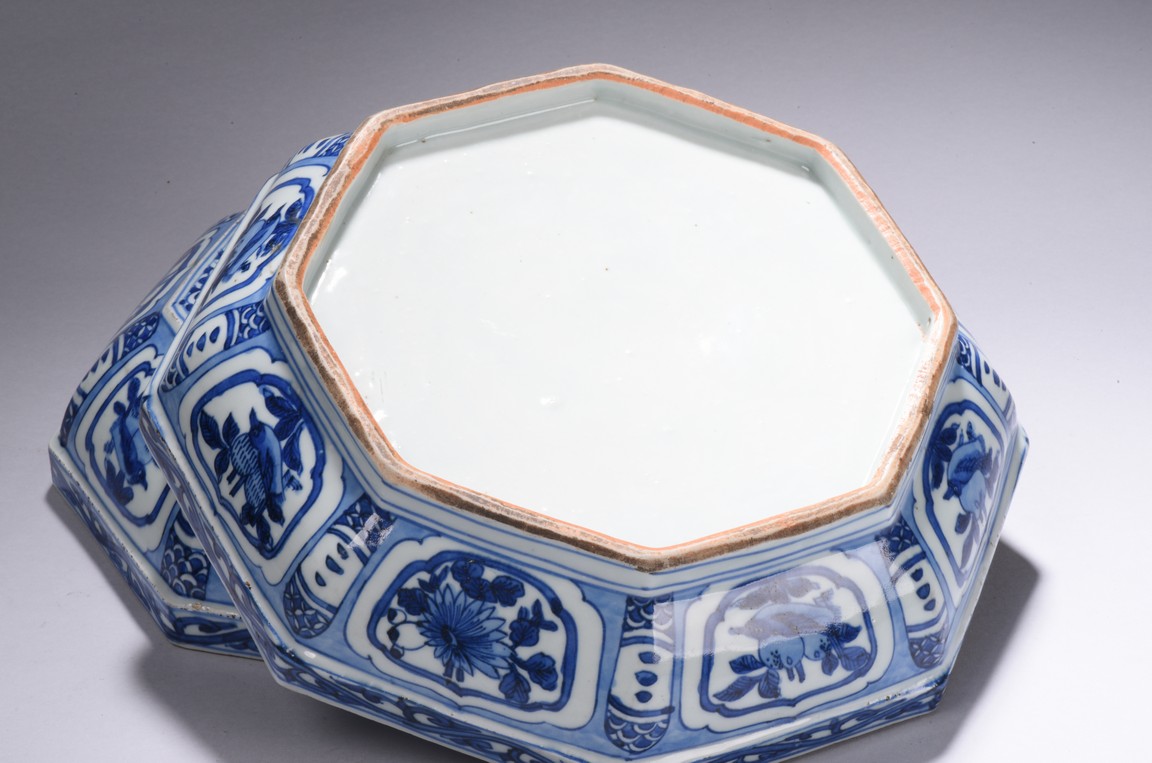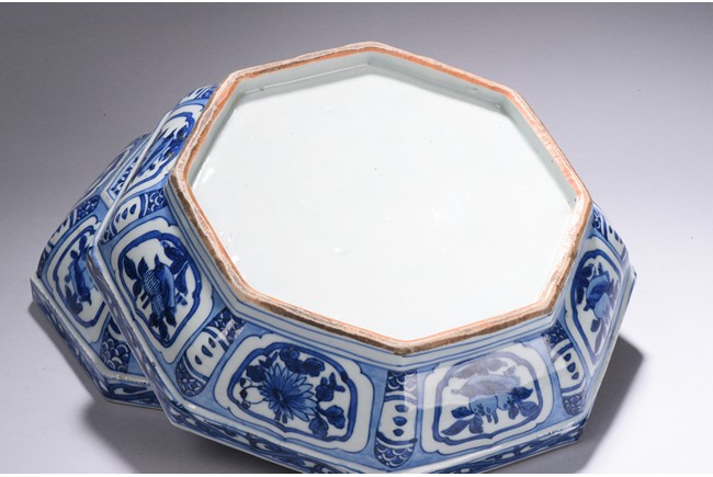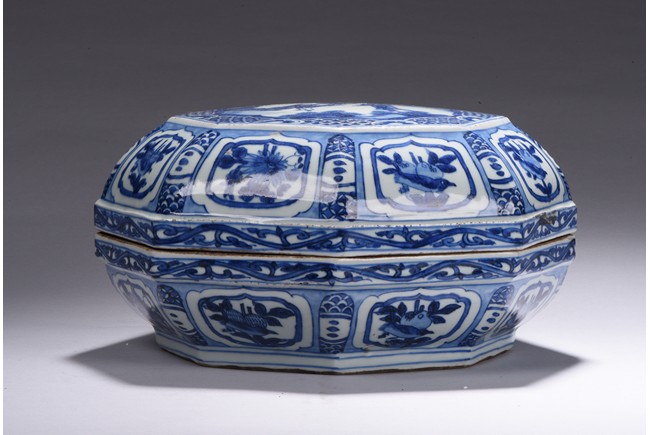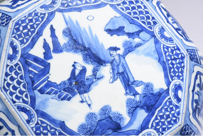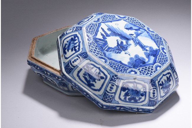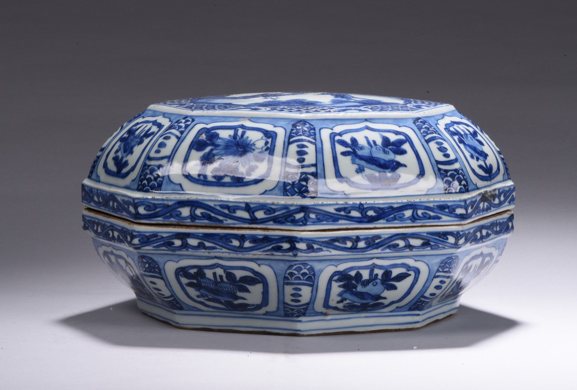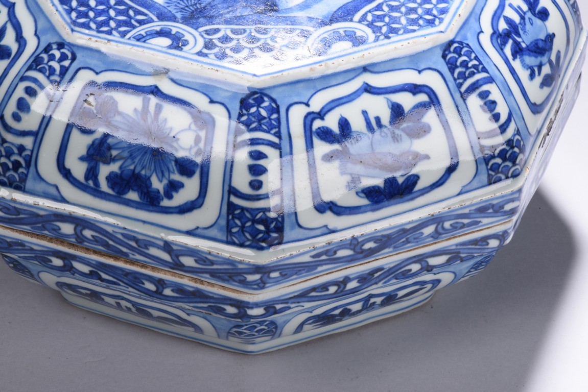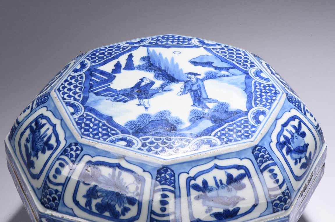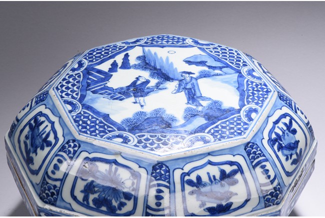 Modelled in curved octagonal form, the cover is finely glazed in cobalt blue with the scene of an gentleman in an conversation with an young boy, all within an deep mountain setting, enclosed by repetitive geometric motif filled octagonal frame, the sides of box and cover painted with alternating cartouches of birds and fruits, separate by geometric patterns, the rims further decorated with floral scrolls. Ming Dynasty period.