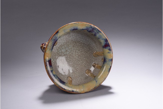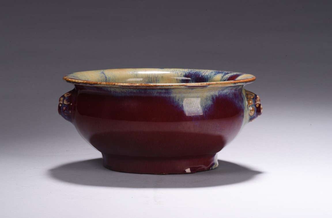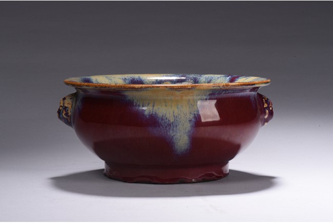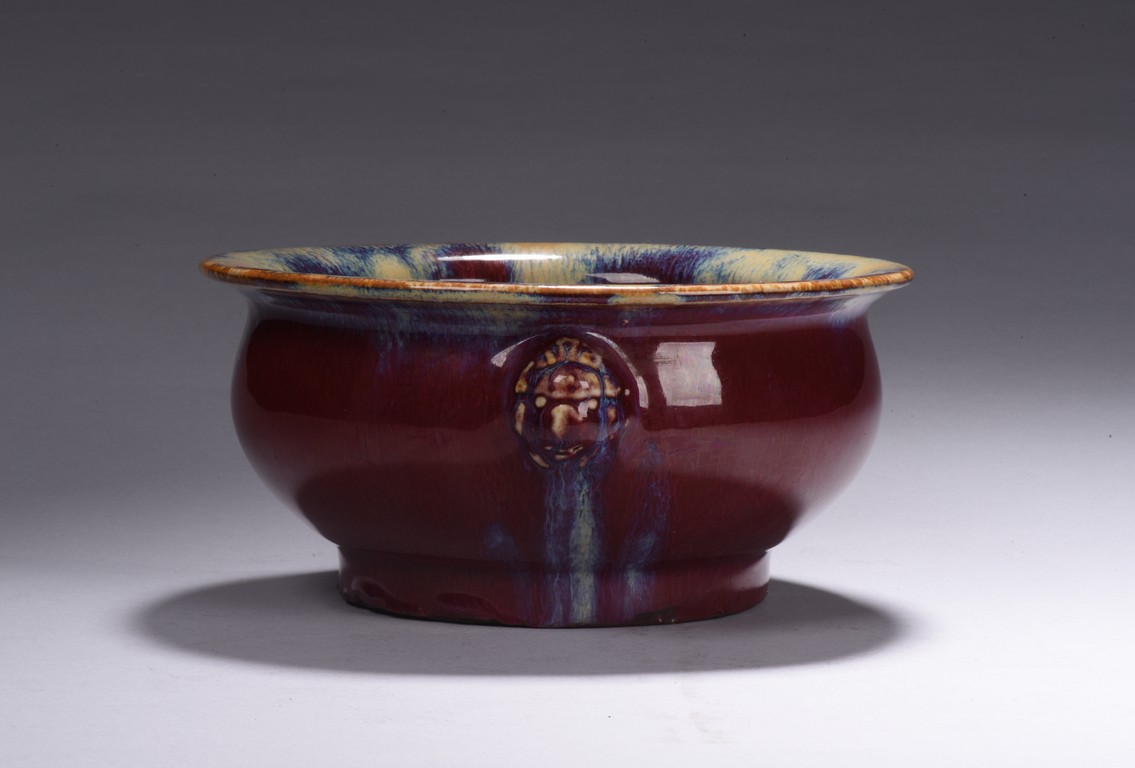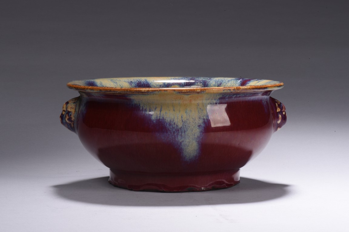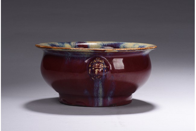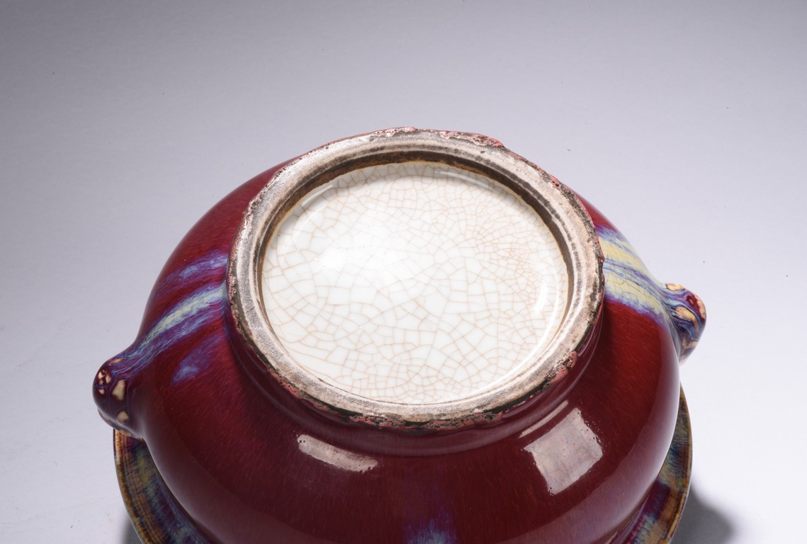 The censer is overall suffused with the attractive cherry red glaze, flanked by two mythical beast head handles on left and right sides, around the flared everted rim streaked with lavender, sky blue and russet glaze, the interior and the base are covered with irregular russet and brown crackle pattern reserved on pale ash-grey tone.