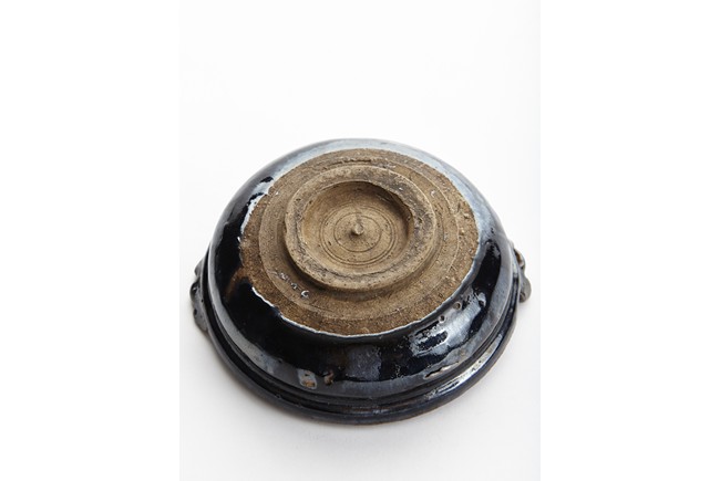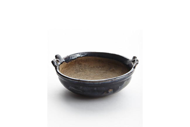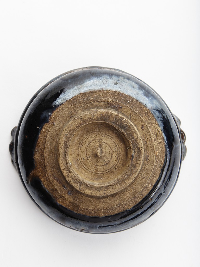 The bowl covered with brownish black glaze halfway towards feet, the side flanked by two handles. The interior and base unglazed. Song Dynasty period.