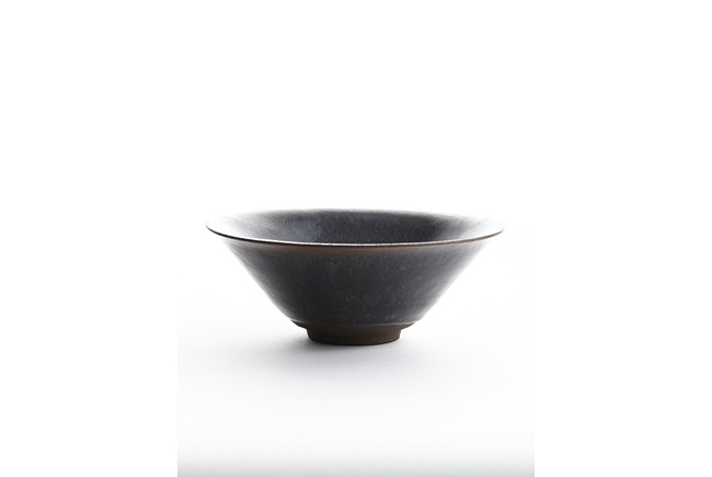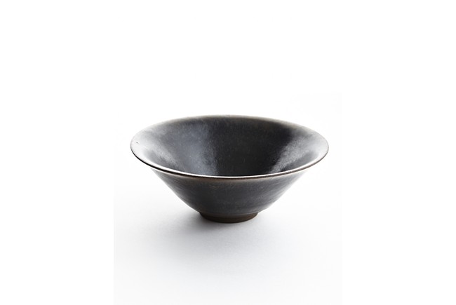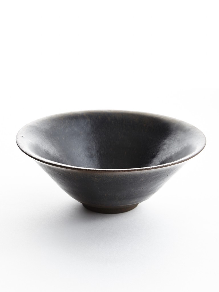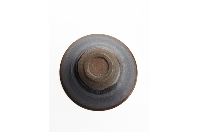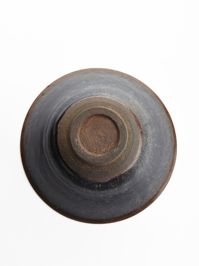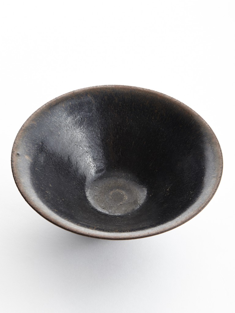 Of deep conical from, the finely potted bowl rises from circular foot ring, covered with an attractive lustrous black glaze with russet markings as 'hare's fur', continuing down above the foot exposing the coarse brown ware. Song Dynasty period.