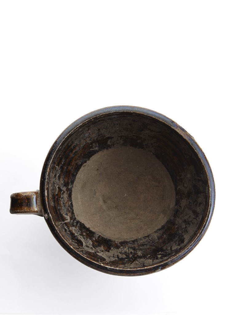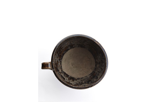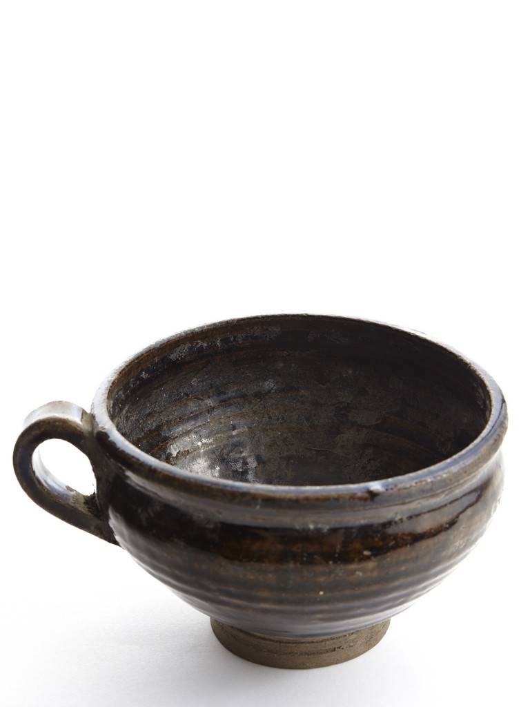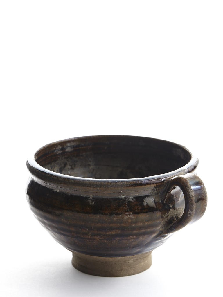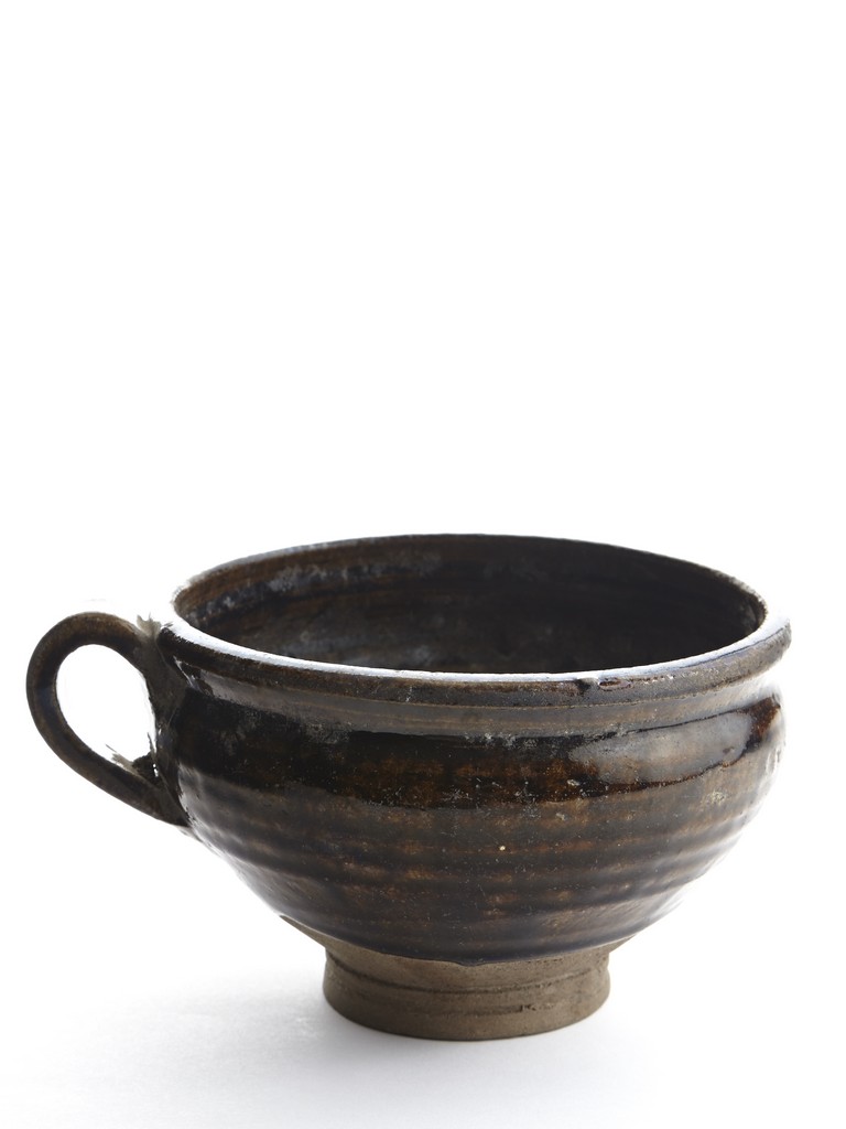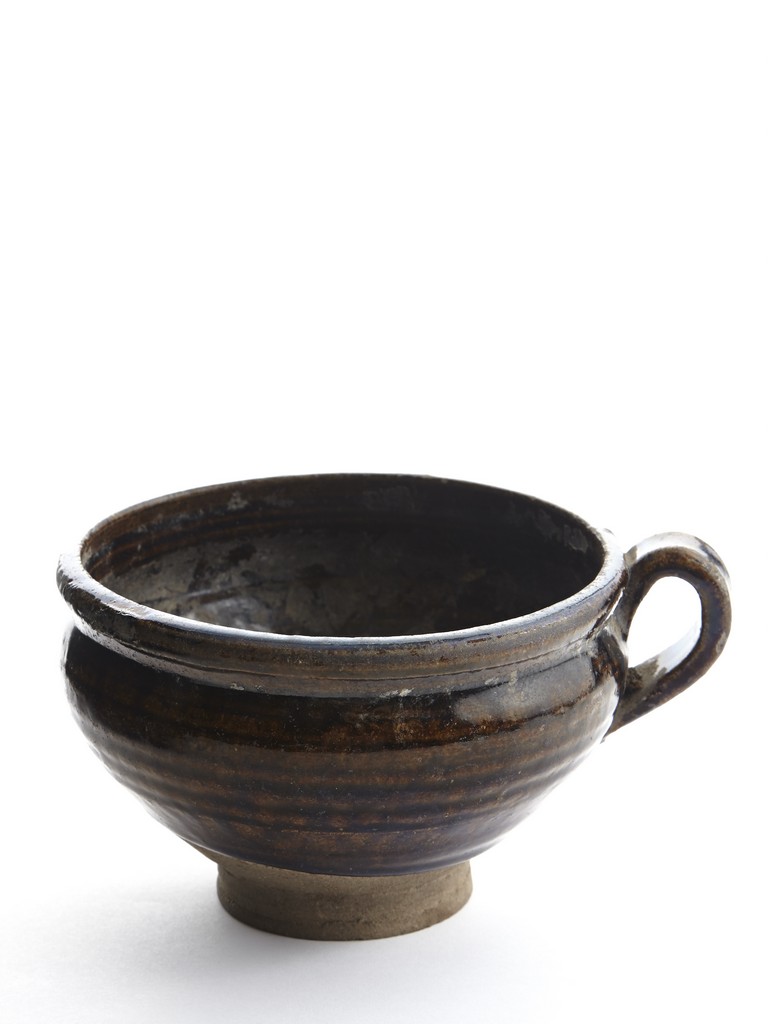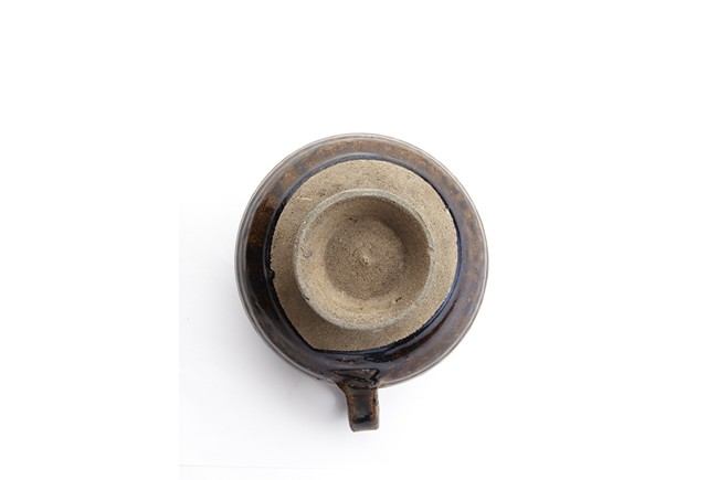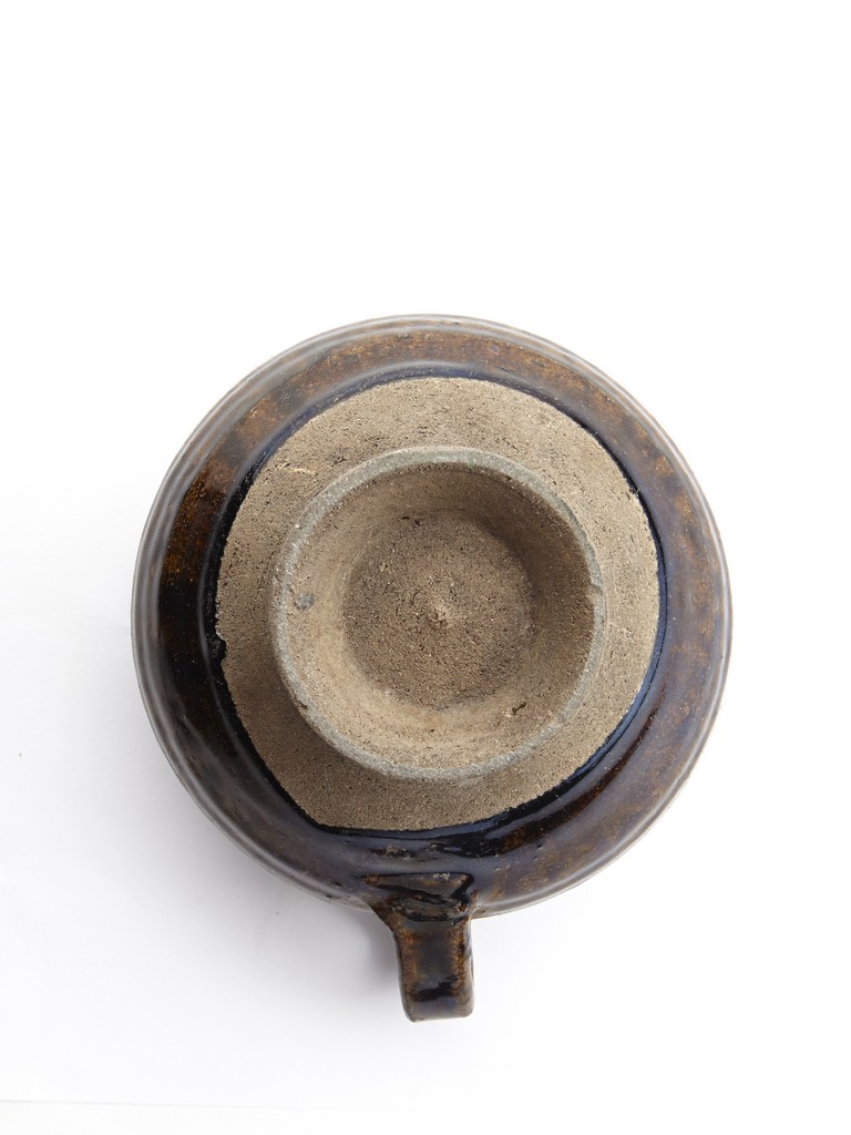 Raised from an circular foot ring, the exterior overall suffused with brownish black glaze and stopped above the feet, the side set with an ear-shaped handle.