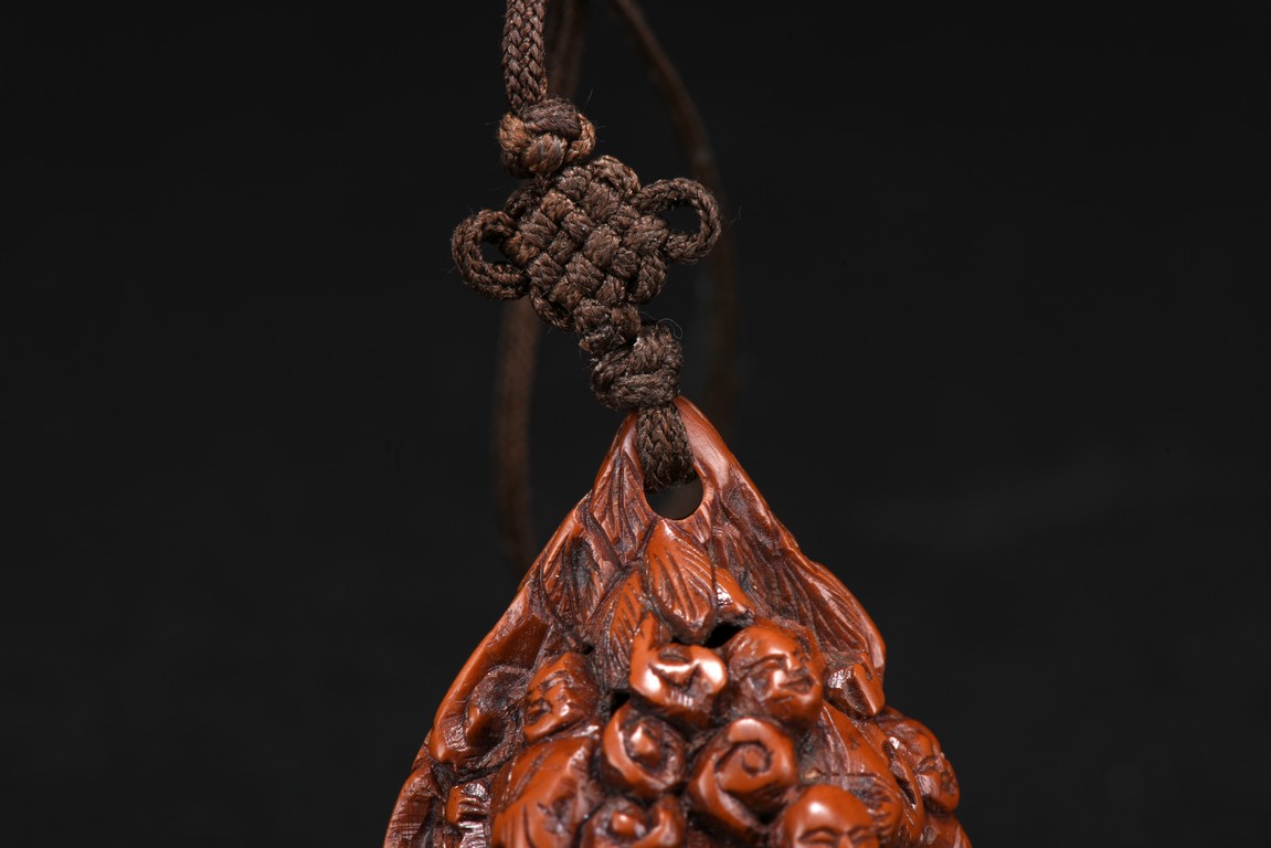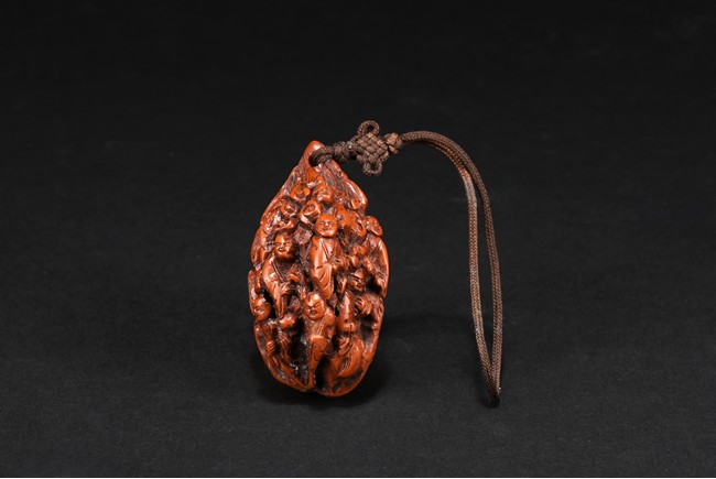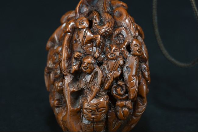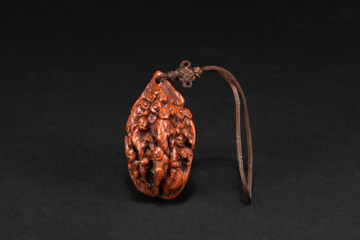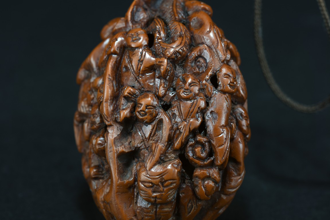 Both sides of walnut finely carved with several luohan figures wearing robes in relief. Republic period.