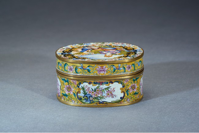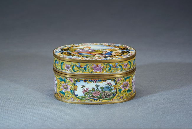 The cover delicately enamelled with scene of two European ladies and an child relaxing in an countryside setting, the vignettes encircled by an multicolor meander with mixed flowers, the side of cover continued with scrolling floral decoration, and the lower side with panels of floral sprays all reserved on floral scroll yellow-ground. The base enamelled with an four character QIANLONG mark. Qing Dynasty period.