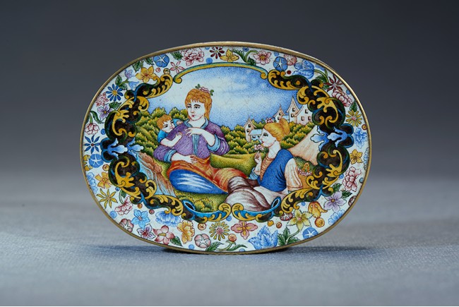 可參考一較小方形銅胎畫琺瑯盒,於2011年5月倫敦佳士得成交,拍品號166 Compare with a smaller square beijing enamel box, painted with chinese scholars instead of western figures, sold in Christie's' London, on May 11 2011, Lot 166