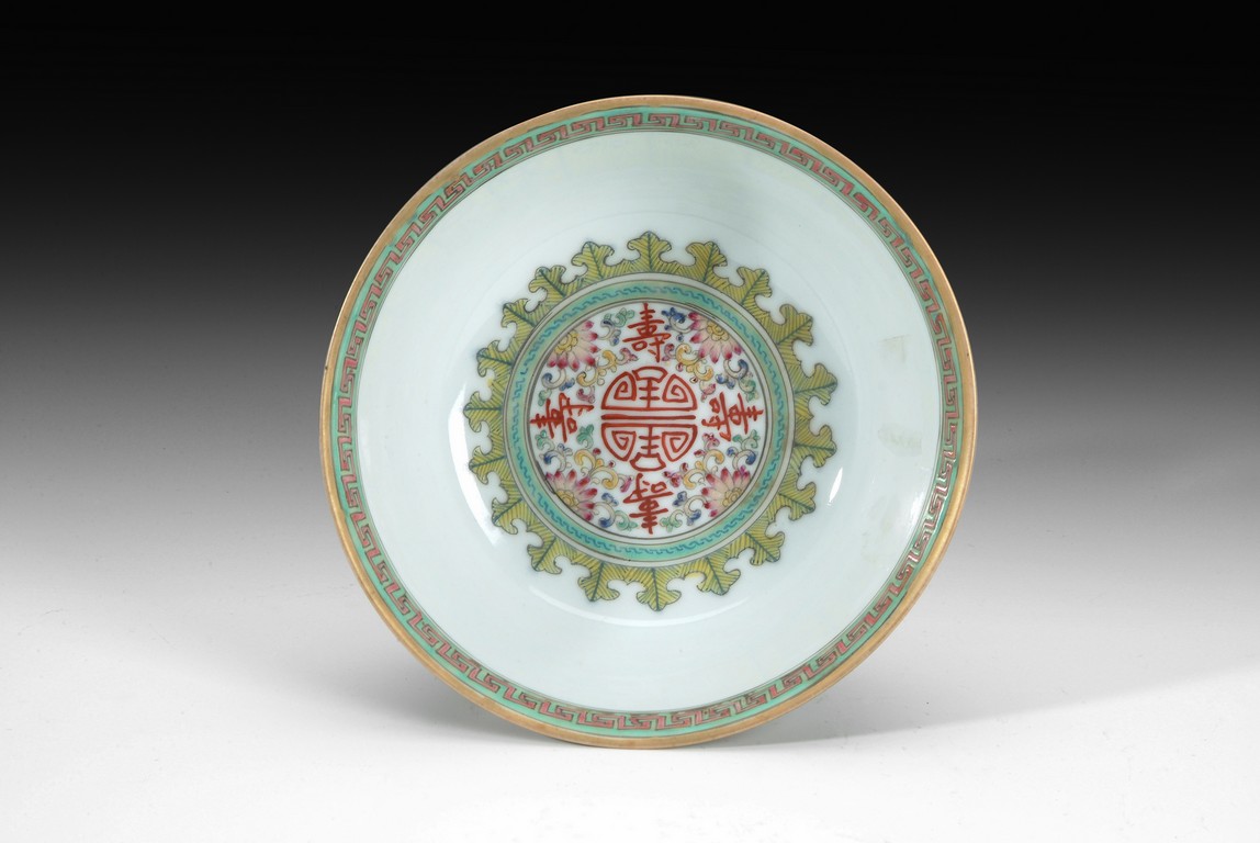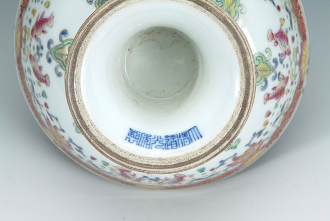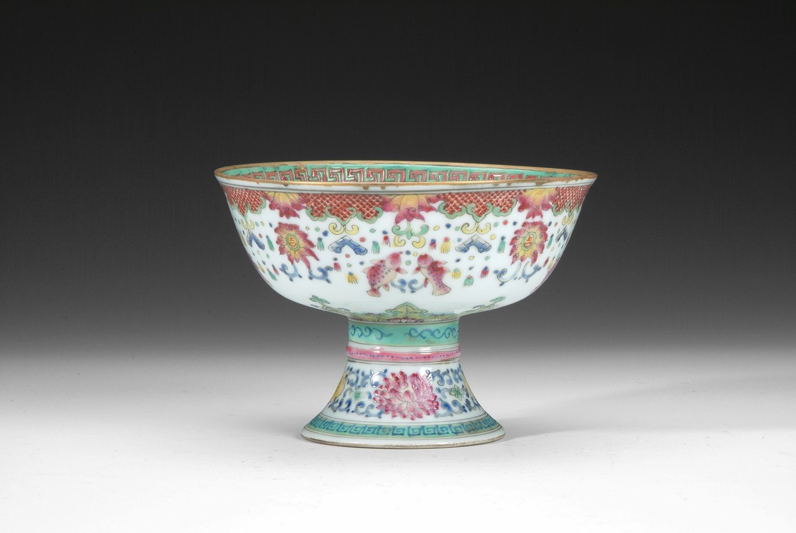 The stem cup decorated with Buddhist emblems. The base bears an six character Daoguang mark. Qing Dynasty period.