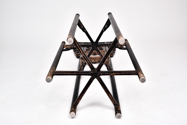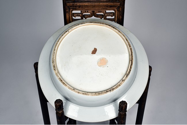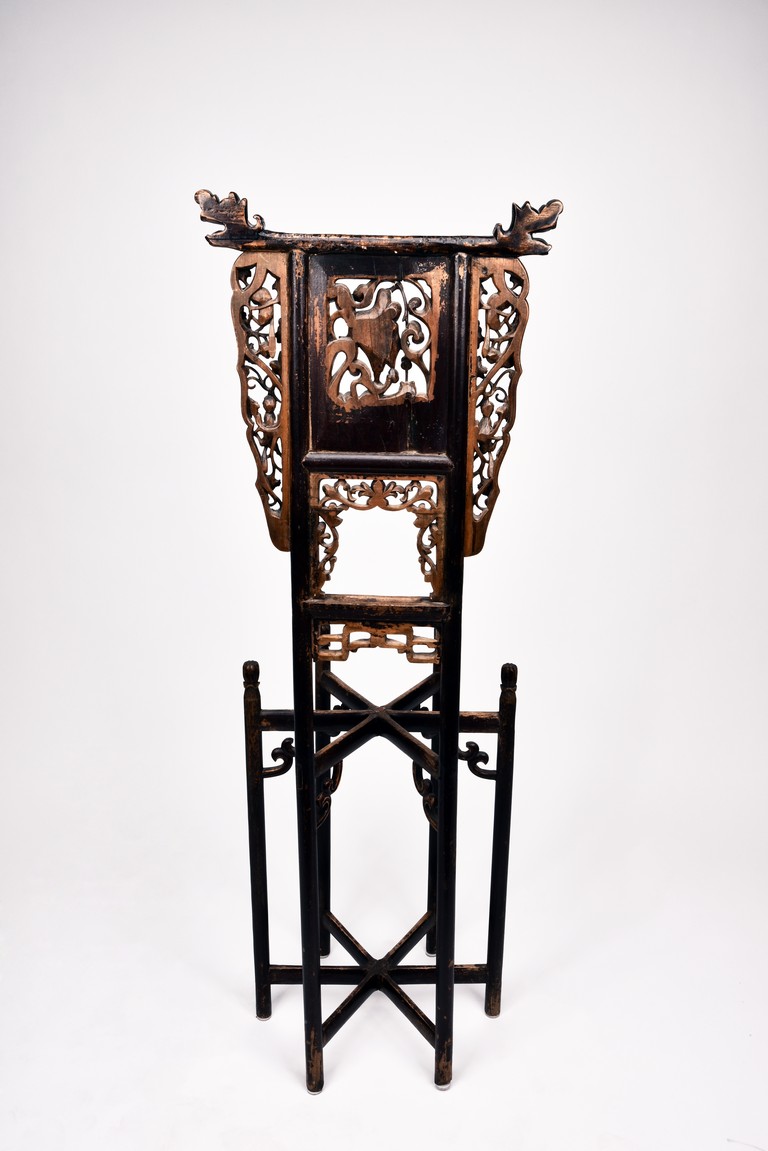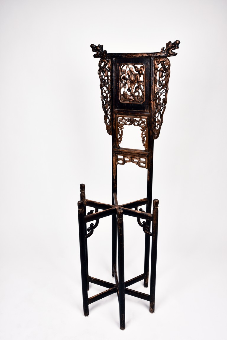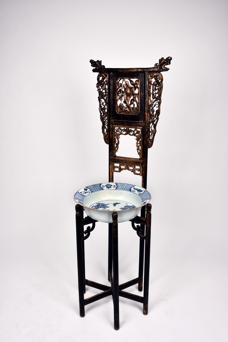 The top rail terminating in chilong heads, supported on two tall posts, flanked at top by reticulated design of squirrels among floral scrolls and fruits, and framing an rectangular reticulated panel of liuhai and golden toad, above an floral scroll design apron, connected to the basin stand formed by wheel-shaped stretchers comprised of six spokes, the top of legs terminating in lotus bud finials; the interior of the basin is finely painted with the scene of leafy peony blossoms issuing from the rockbase below two flying butterflies encircled by double-line. The everted rim is further decorated with alternating auspicious emblem enclosed by shaped border spaced by repeated geometric motif. Qing Dynasty period.