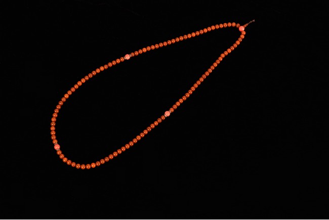 A strand of prayers bead with a total of 108 beads, composed of coral and amber beads of similar size. Qing Dynasty period.