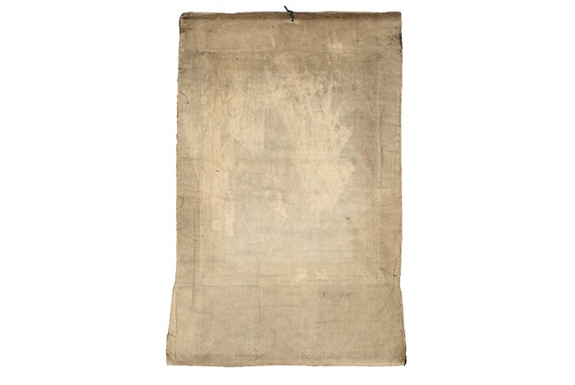 This piece of Tangka finely embroidered with a missionary man seated on blanks with serious expression and wearing red loose robe draped from his left shoulder.