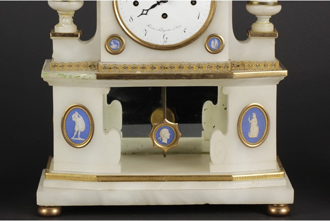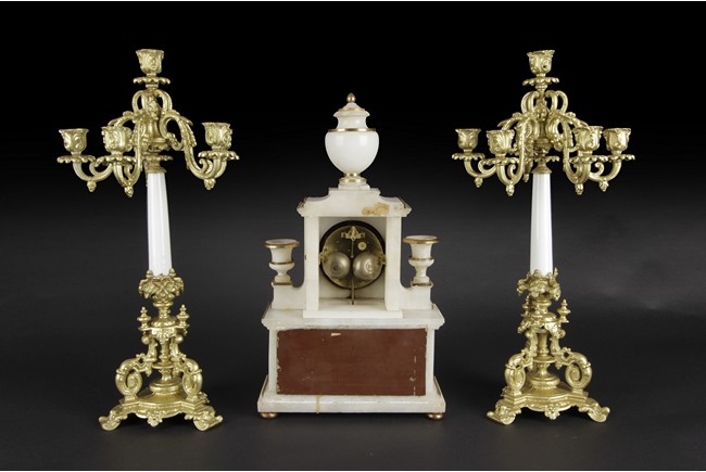 Comprising a pair of en-suite five-stick candelabra, the clock shaped similar to clock tower, with two candle holders on the side.