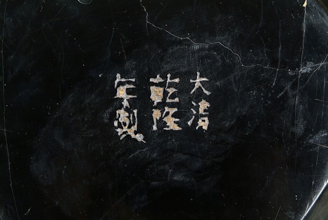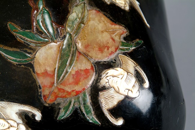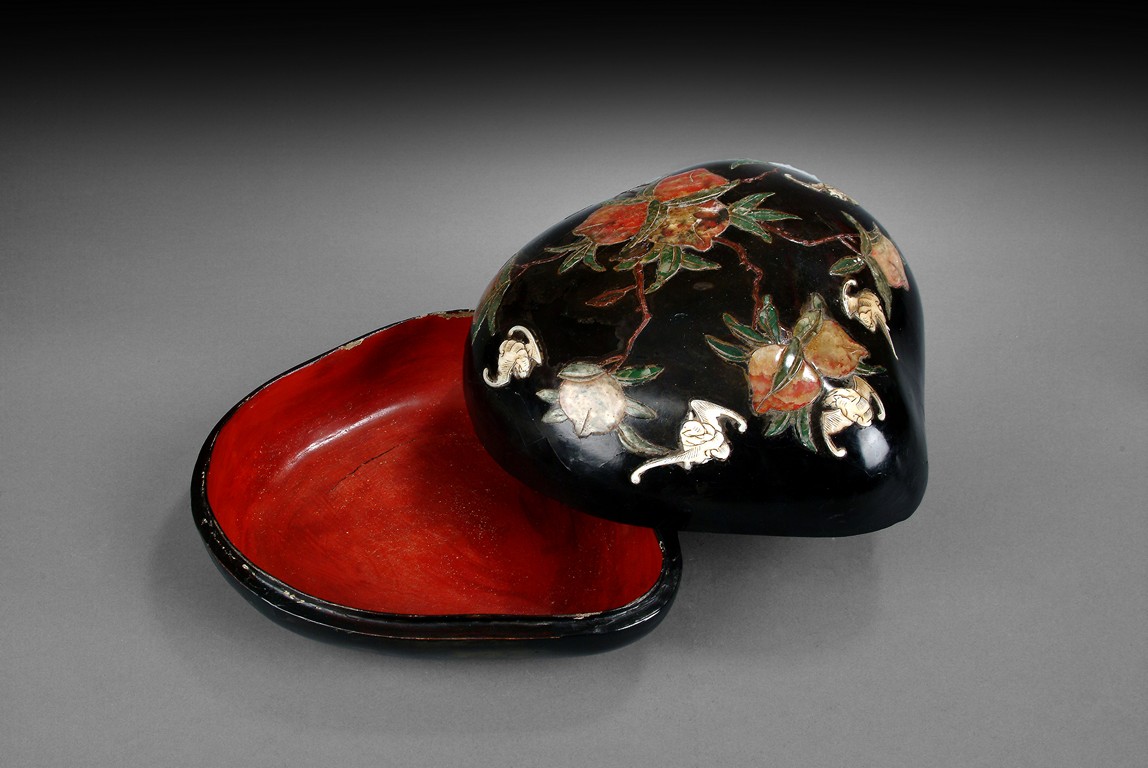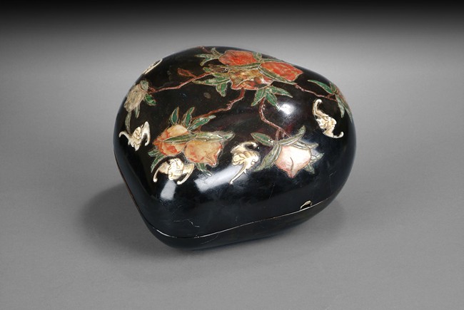 Of peach form, the applique lacquer box is decorated with mother of pearl, Shoushan soapstone, chicken blood stone, and jasper, to form bats flying next to peaches. Bottom bears six character 'QIANLONG' mark. Qing Dynasty period.