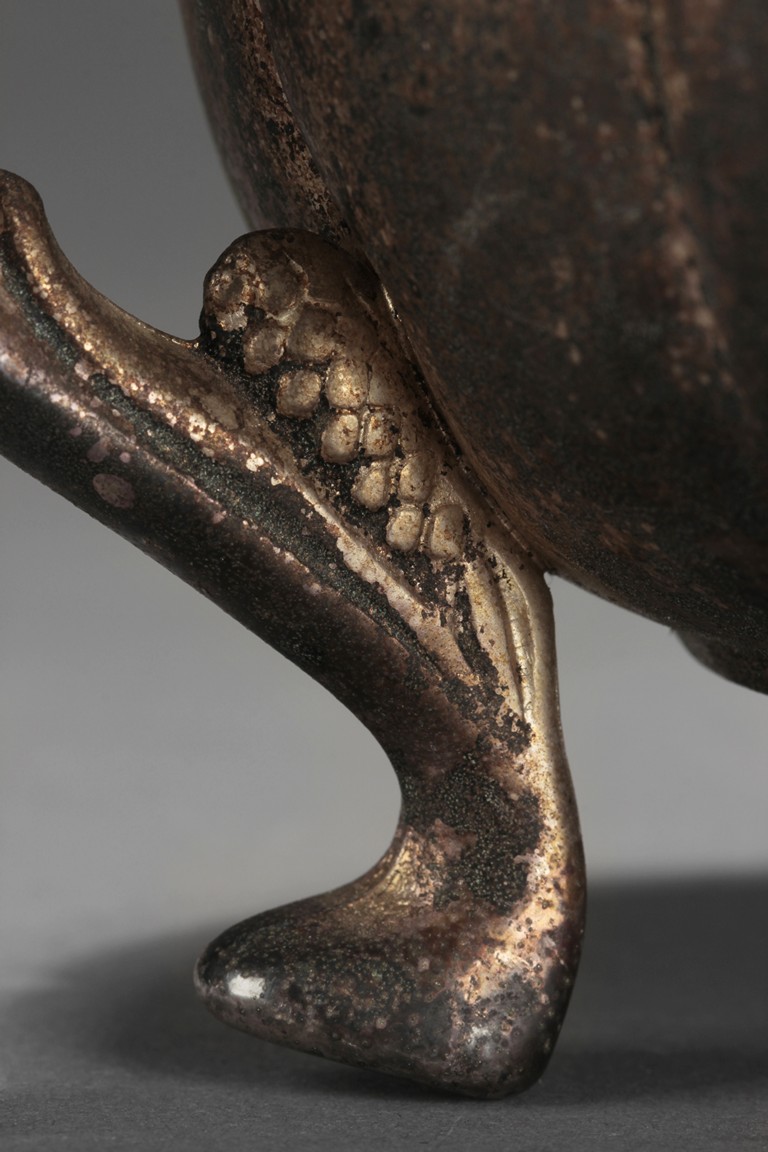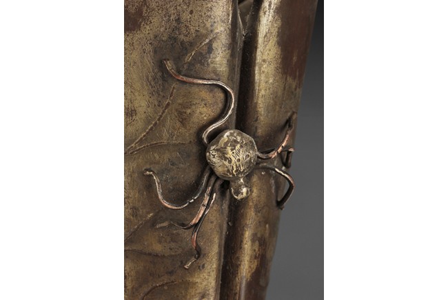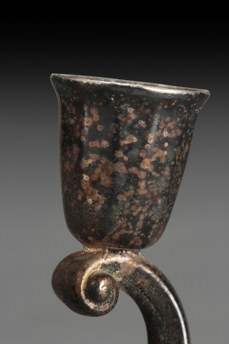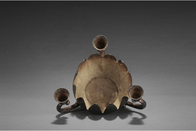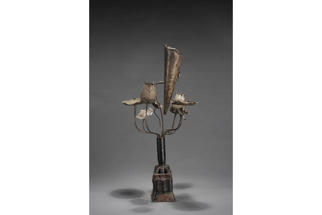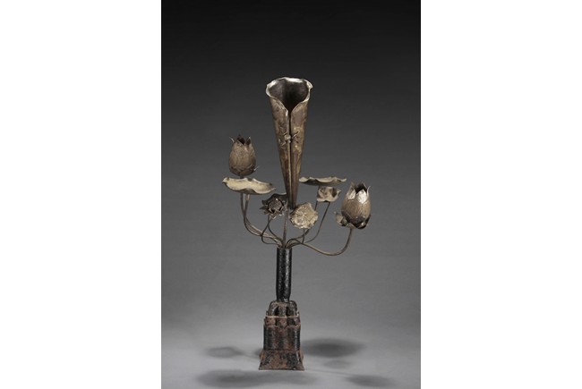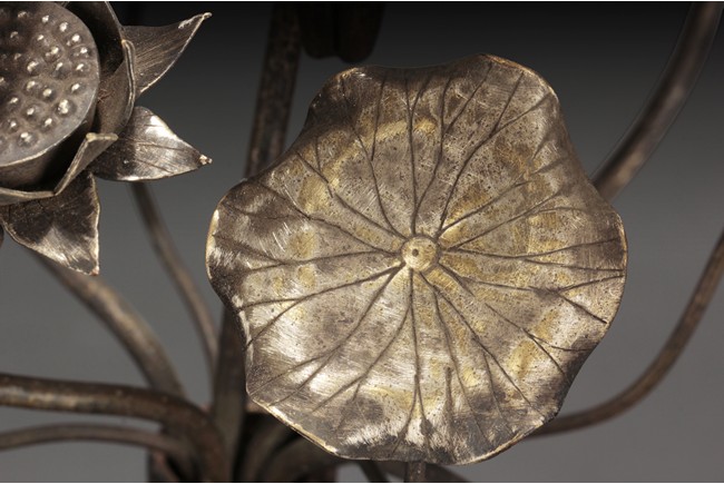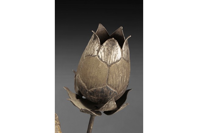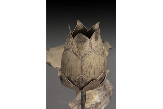 One candle holder in blossoming lotus flower form, supported by three legs extending to handles with bulb-shaped candle holders on top. The other candle holder is composed of multiple flowers, leaves, and bulbs, with the two bulbs on the side and the large bulb in the center acting as candle holder, the base made of iron and was not original. 18th century.