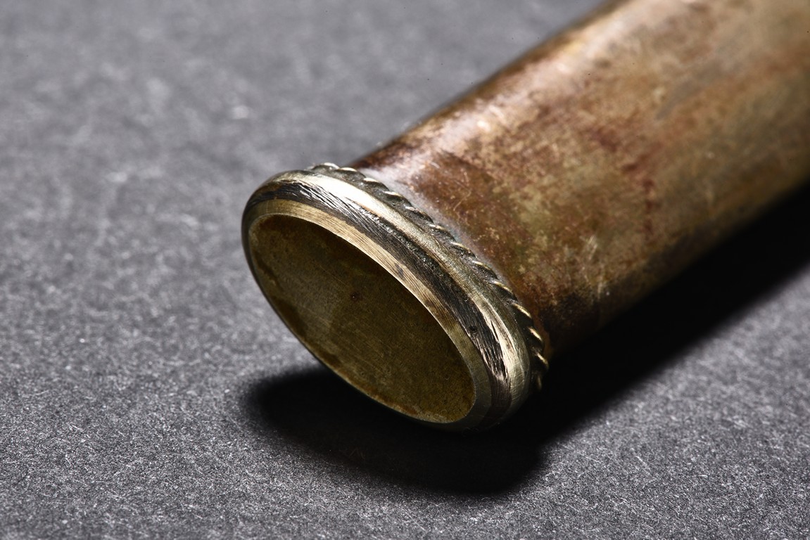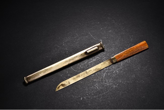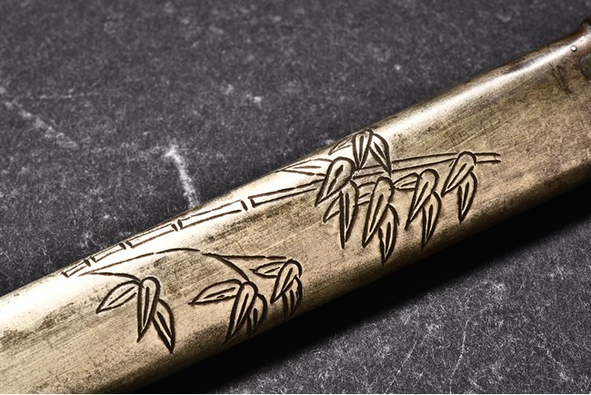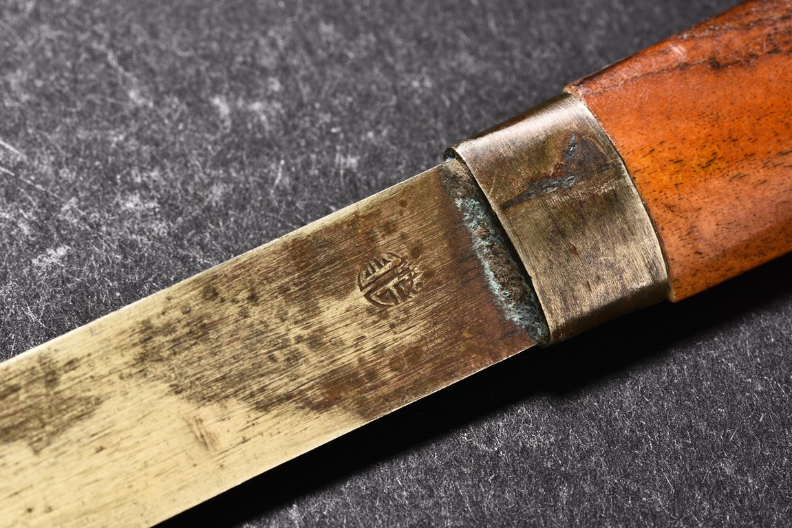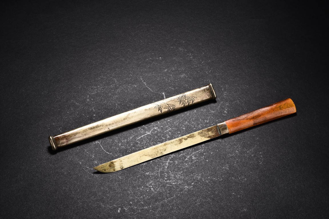 The knife with wooden handle, the bronze lid incised with bamboo decoration.