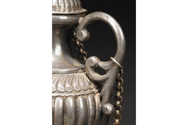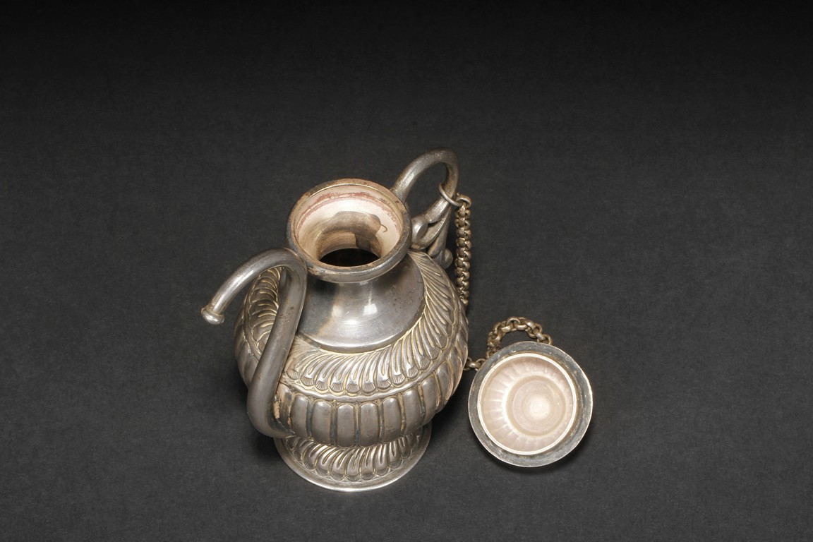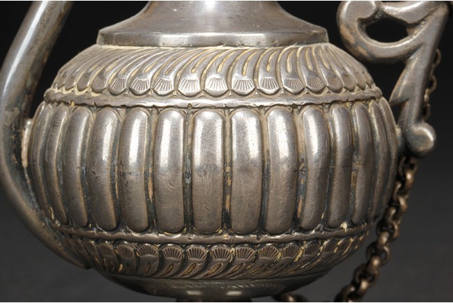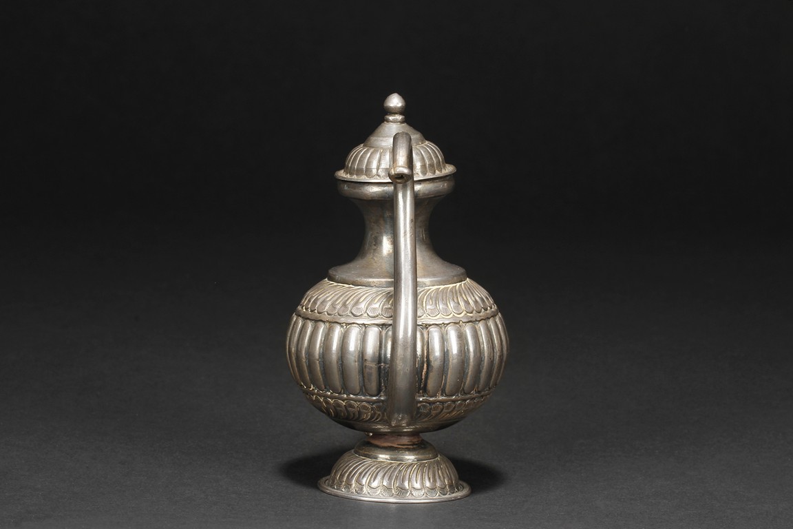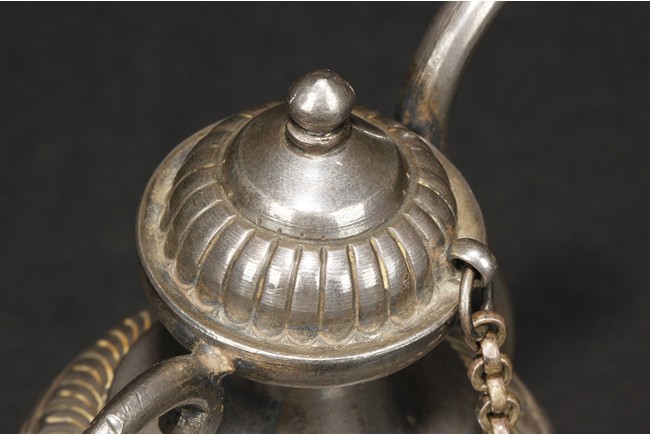 Of elegant curved shape with a globular body, the ewer stands on a round feet, with thin neck and flared rim, the spout attached to body and the rim, the body with delicate patterns, the handle attached to the body and rim as well, along with a chain that connects to the cover. Bottom engraved '925'.