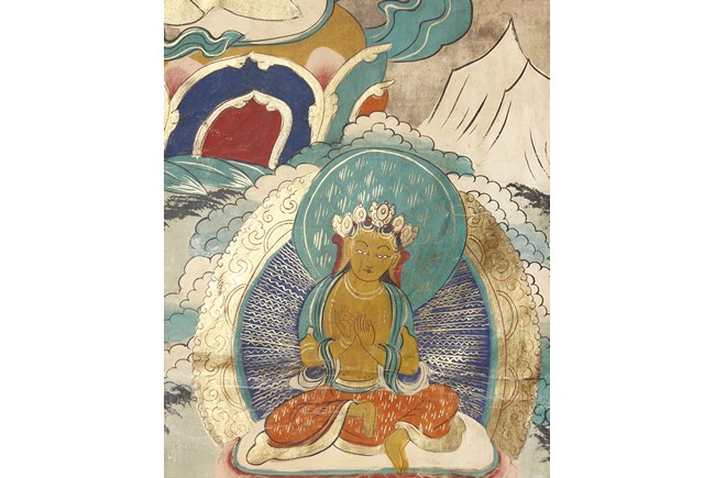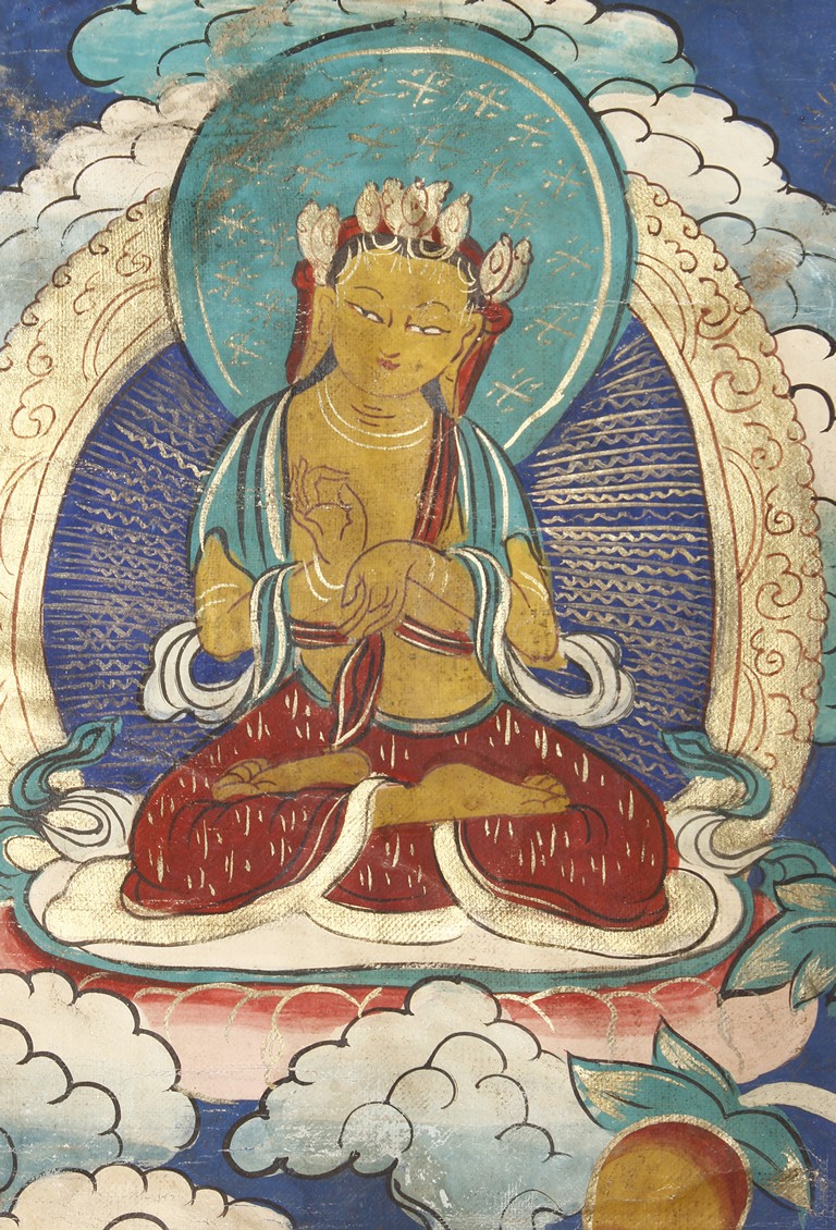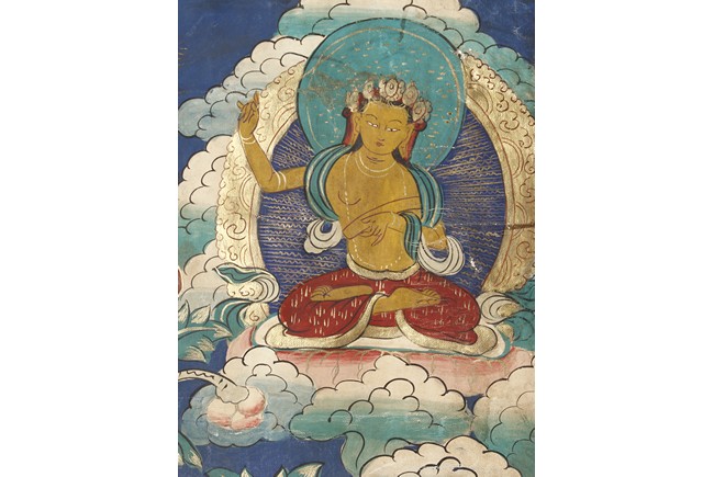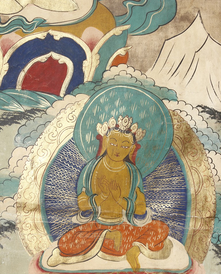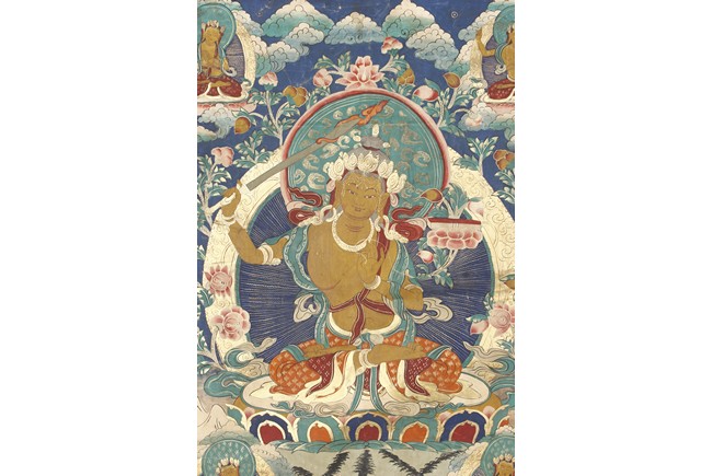 Painted on a cloth, this thangka features Manjusri raising up a sword on right hand and seated in dhyanasana against a blue and ivory colored mandorla. His face is vividly drew with benevolent and serene expression and hair tied in a topknot against a green roundel. He is surrounded by deities with similar blue mandorlas amidst clouds. Qing Dynasty period.