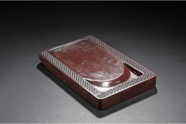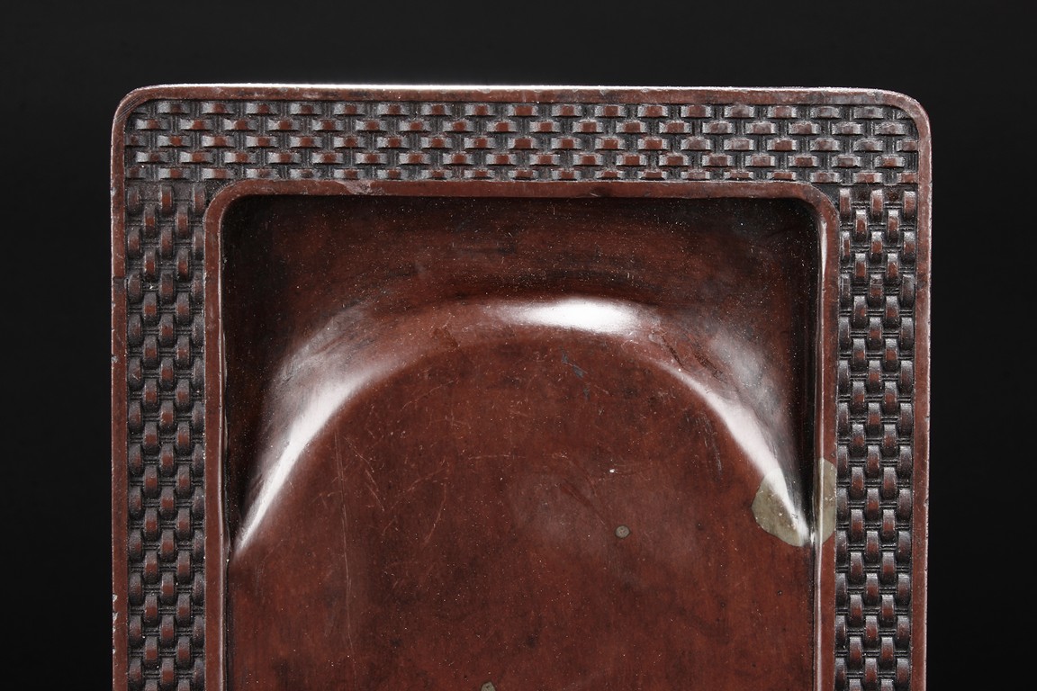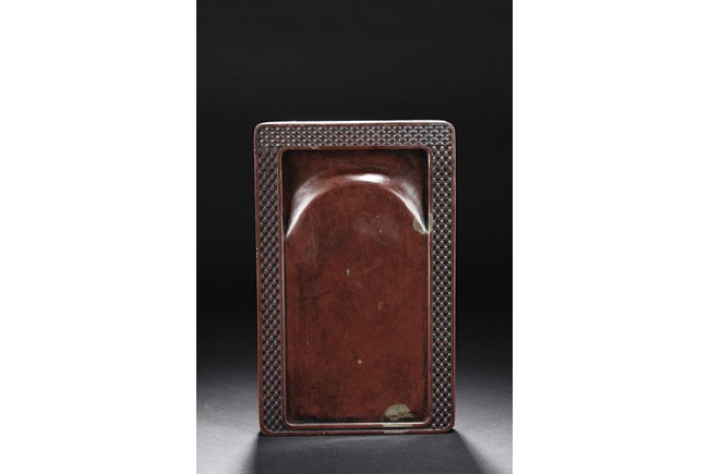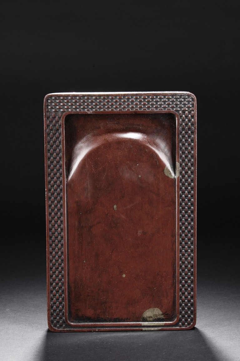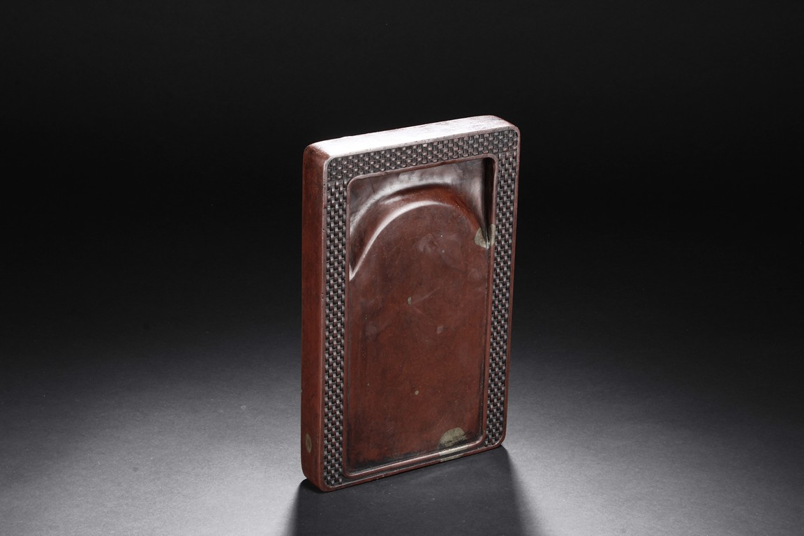 The ink stone is of deep red-orange color, the edges in chain link pattern, with inkwell on the one side, carved deeply with a curved pattern.