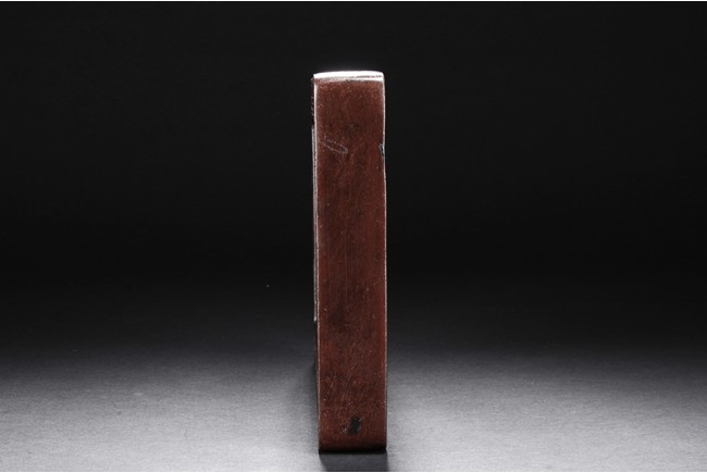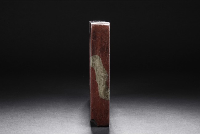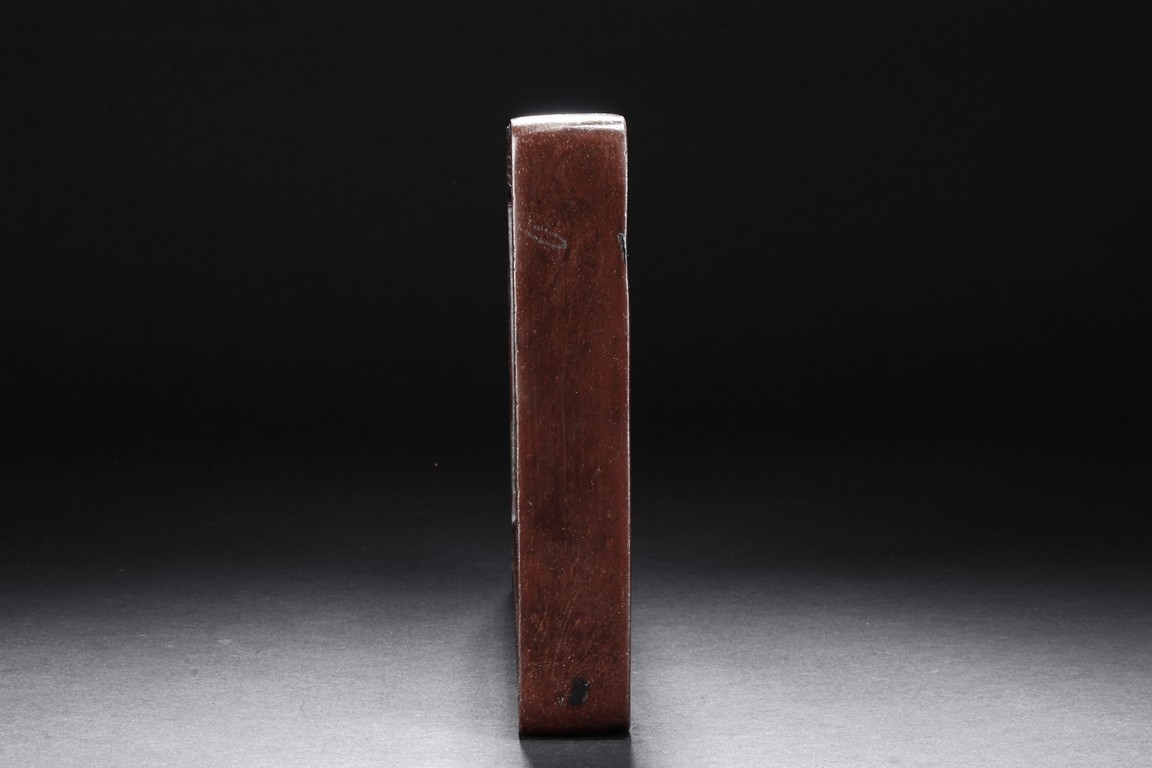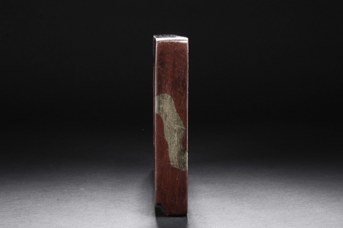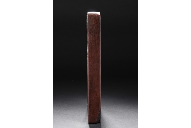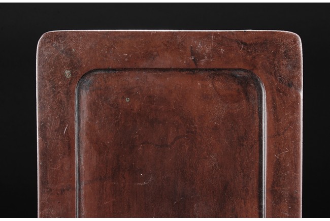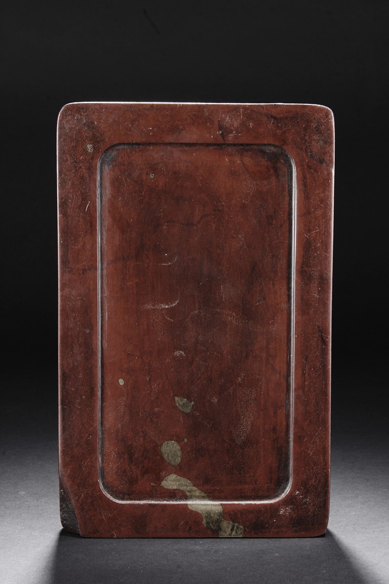 The ink stone is of deep red-orange color, the edges in chain link pattern, with inkwell on the one side, carved deeply with a curved pattern.