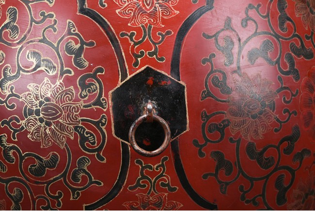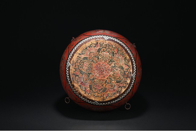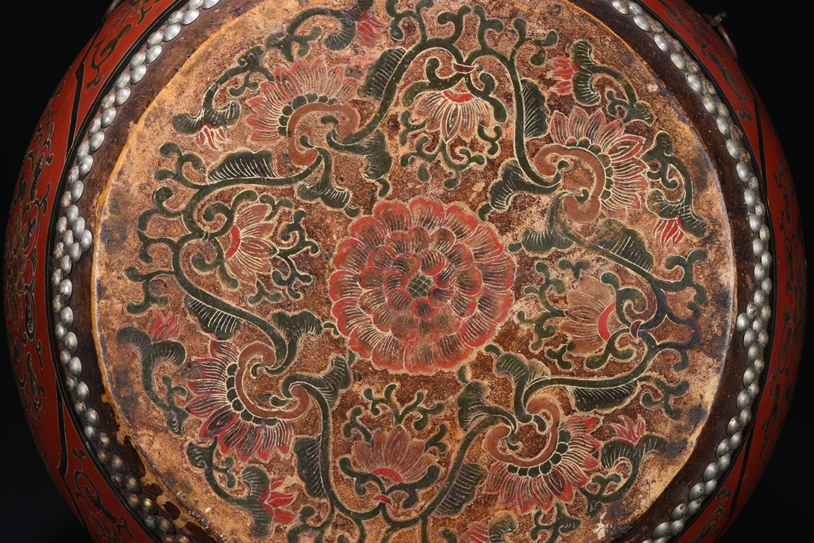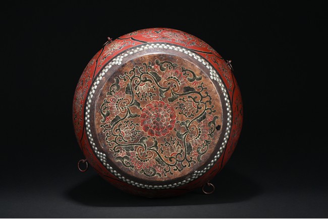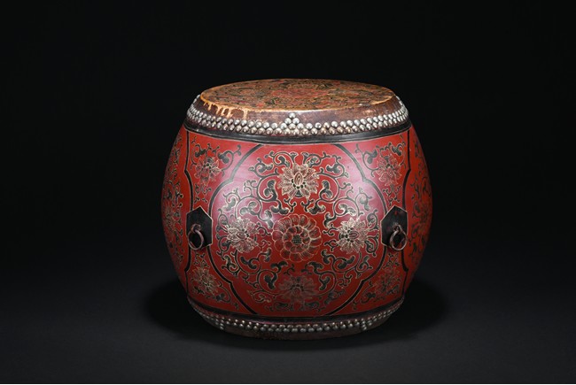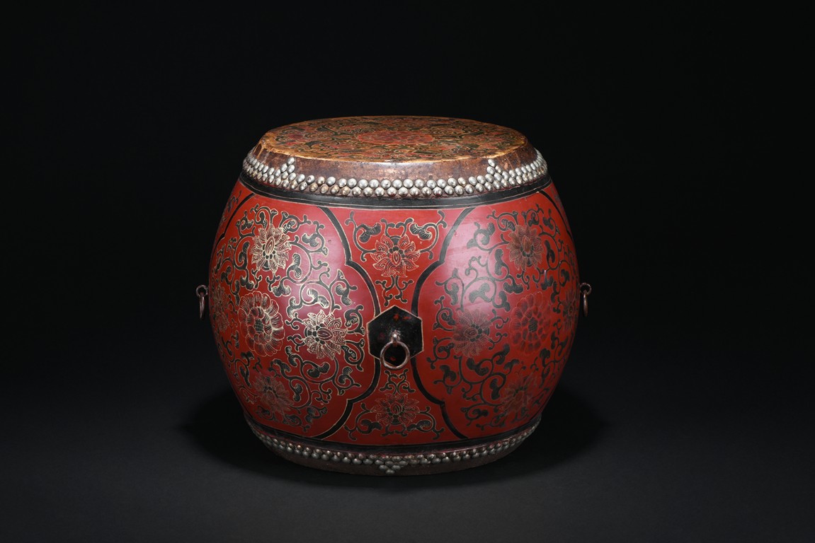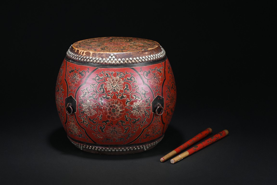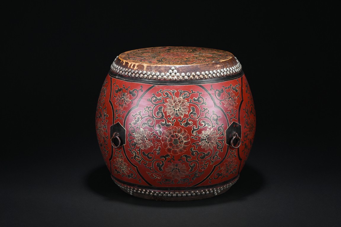 The rounded vessel set with metal bail handles, carved around the sides through layers of black lacquer to the red ground with scrolled foliate surrounded blooming chrysanthemum flanked by four flower enclosed in four-lobe pattern, all between the two decorated rivet knots bands. The drum is accompanied by a pair of red lacquer decorated in black flower patterned drumsticks.