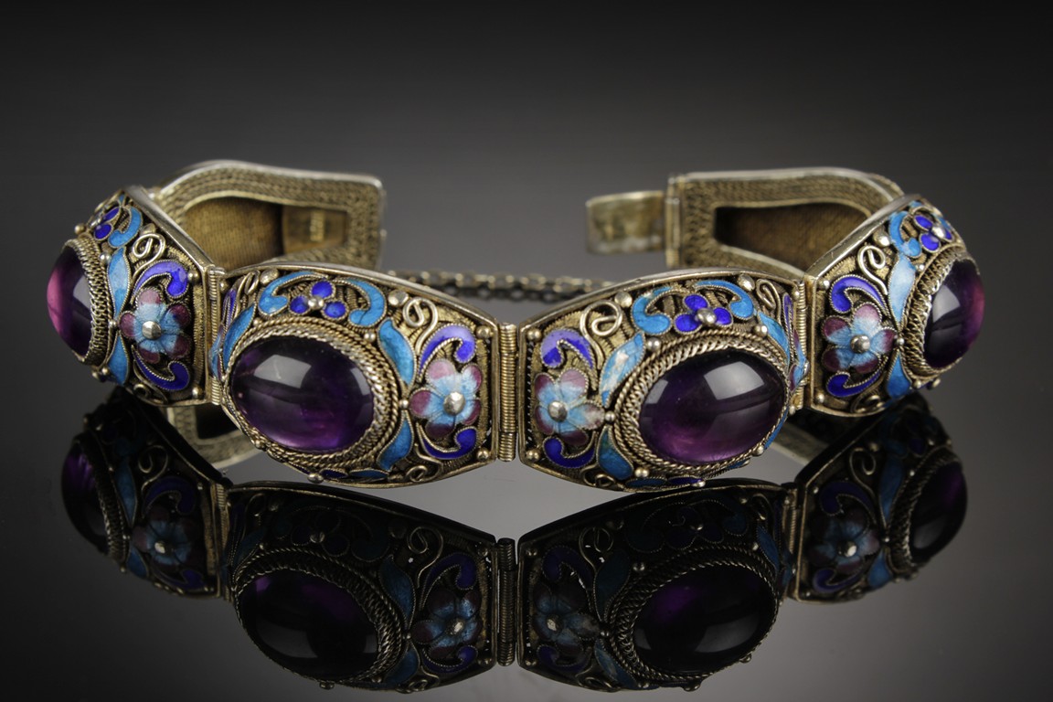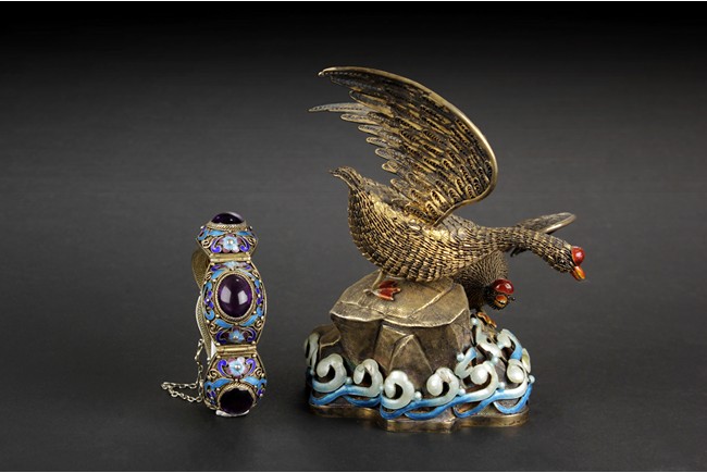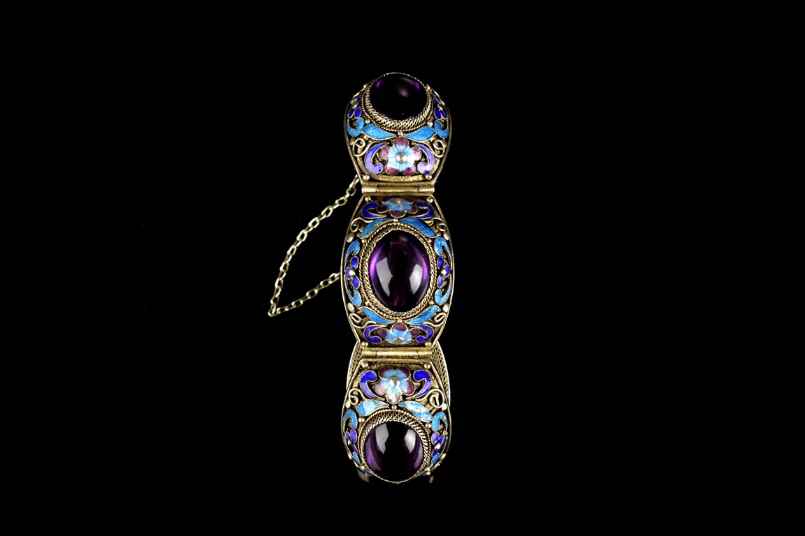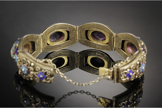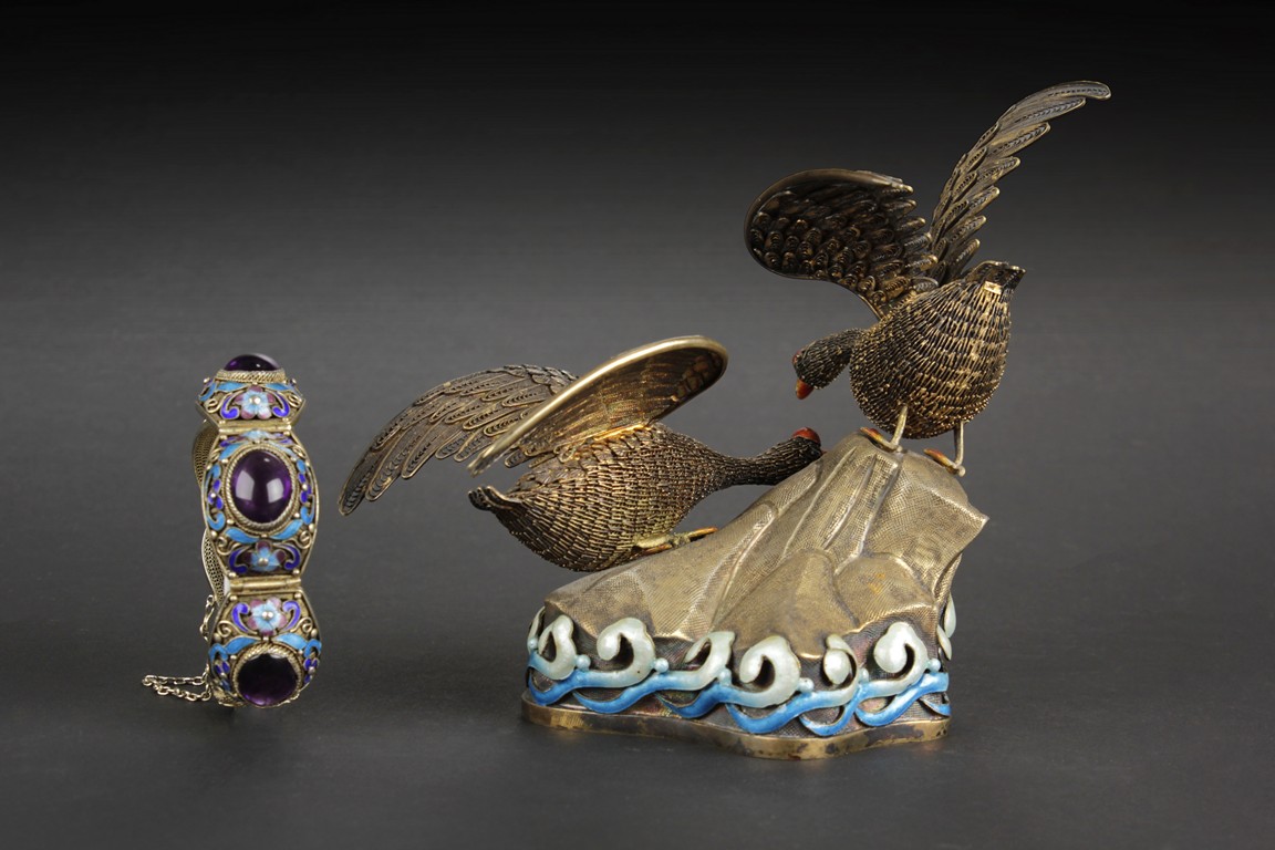 Beautifully made, the two swans standing on top of rocks within ocean waves, wings open and ready to fly. The bracelet made with six sections, four of which contain kyanite, linked with silver chain. Republic period.
