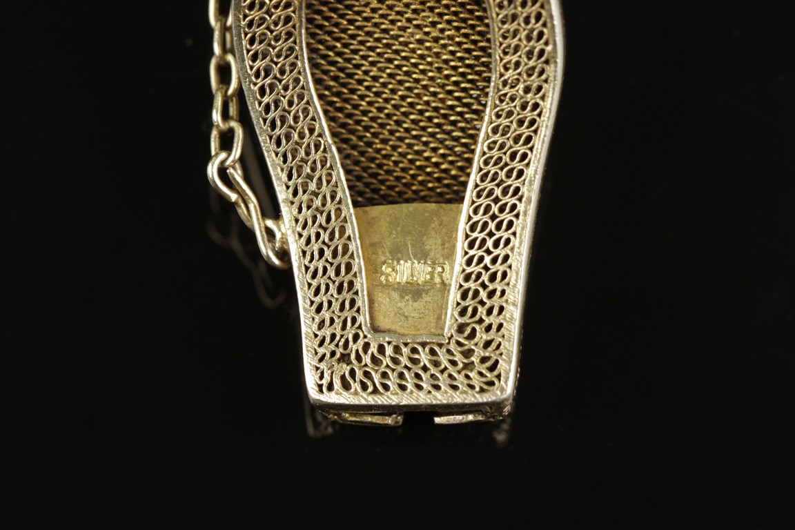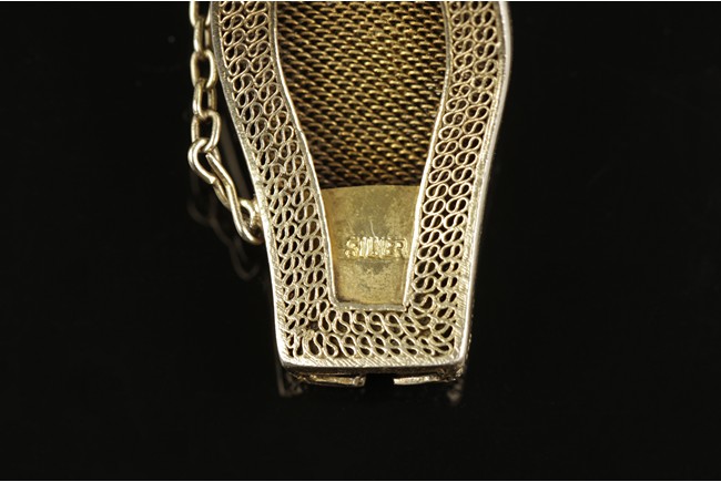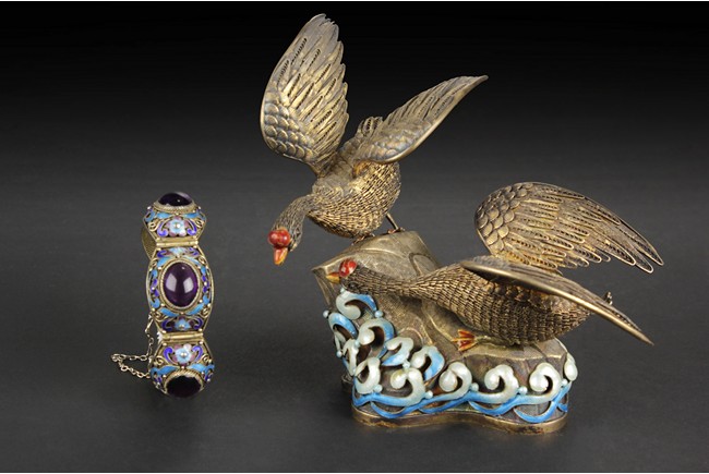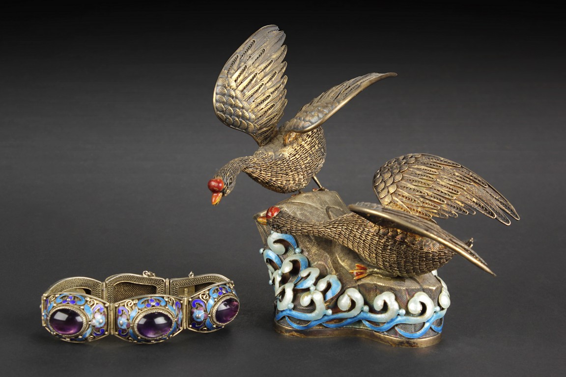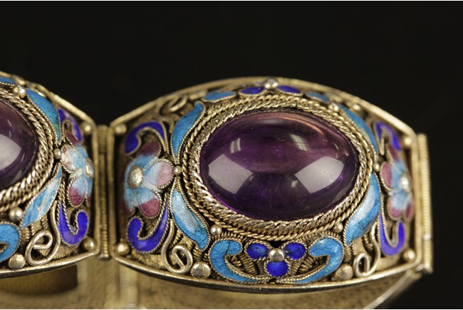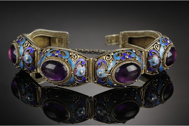 Beautifully made, the two swans standing on top of rocks within ocean waves, wings open and ready to fly. The bracelet made with six sections, four of which contain kyanite, linked with silver chain. Republic period.