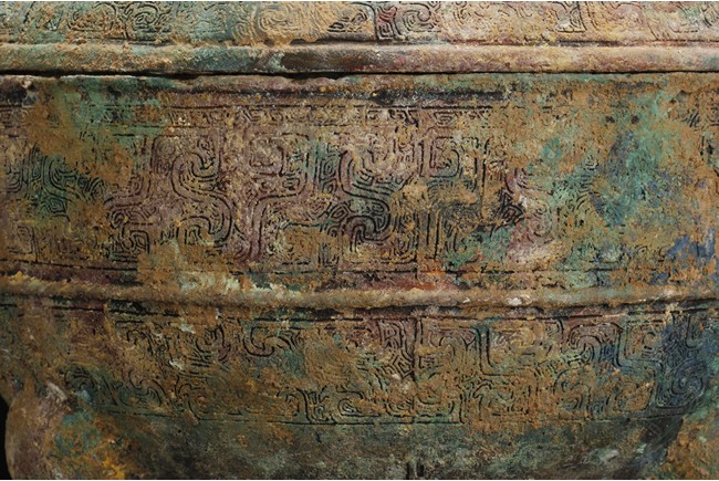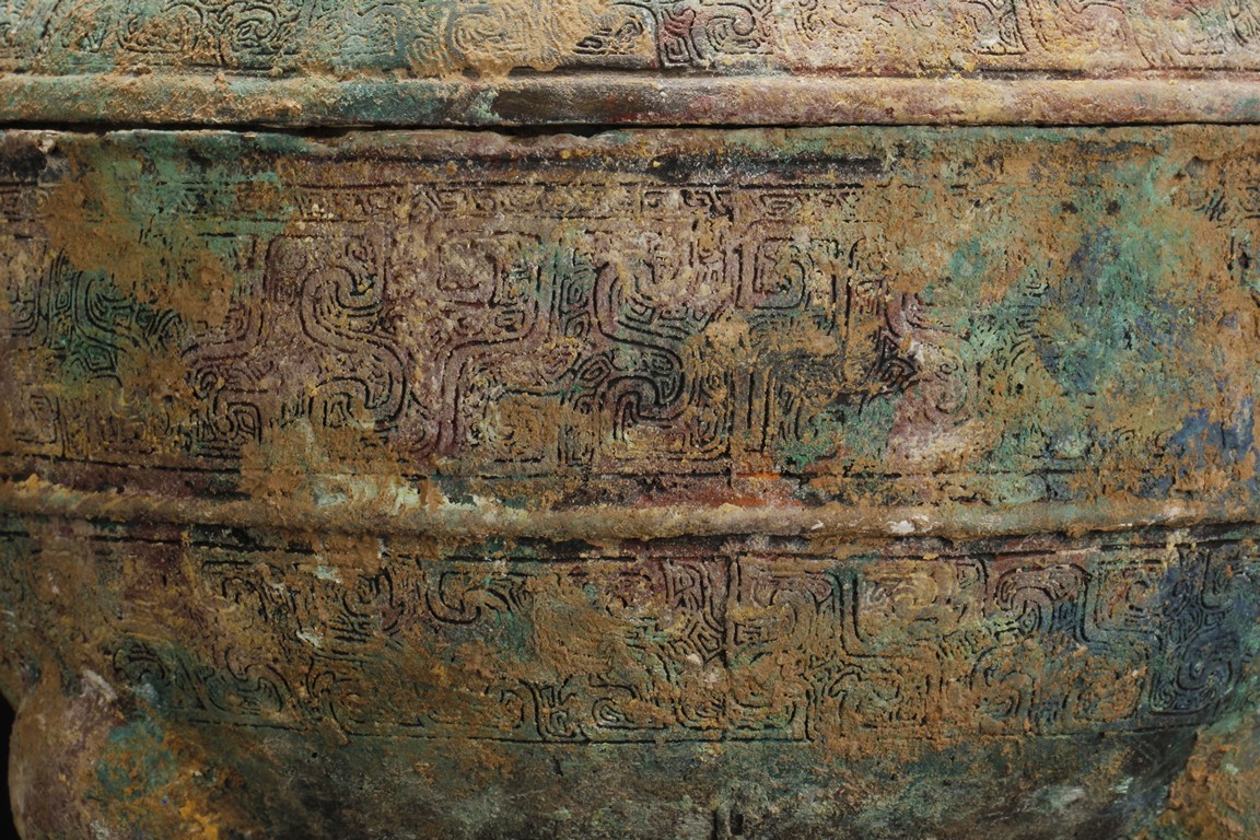 Of bulbous form, the body carved with delicate key-fret patterns, supported by three tapering legs, a pair of uprising handles applied to the sides, the cover with similar key-fret patterns and three rings attached. Age related oxidation and rust.