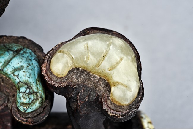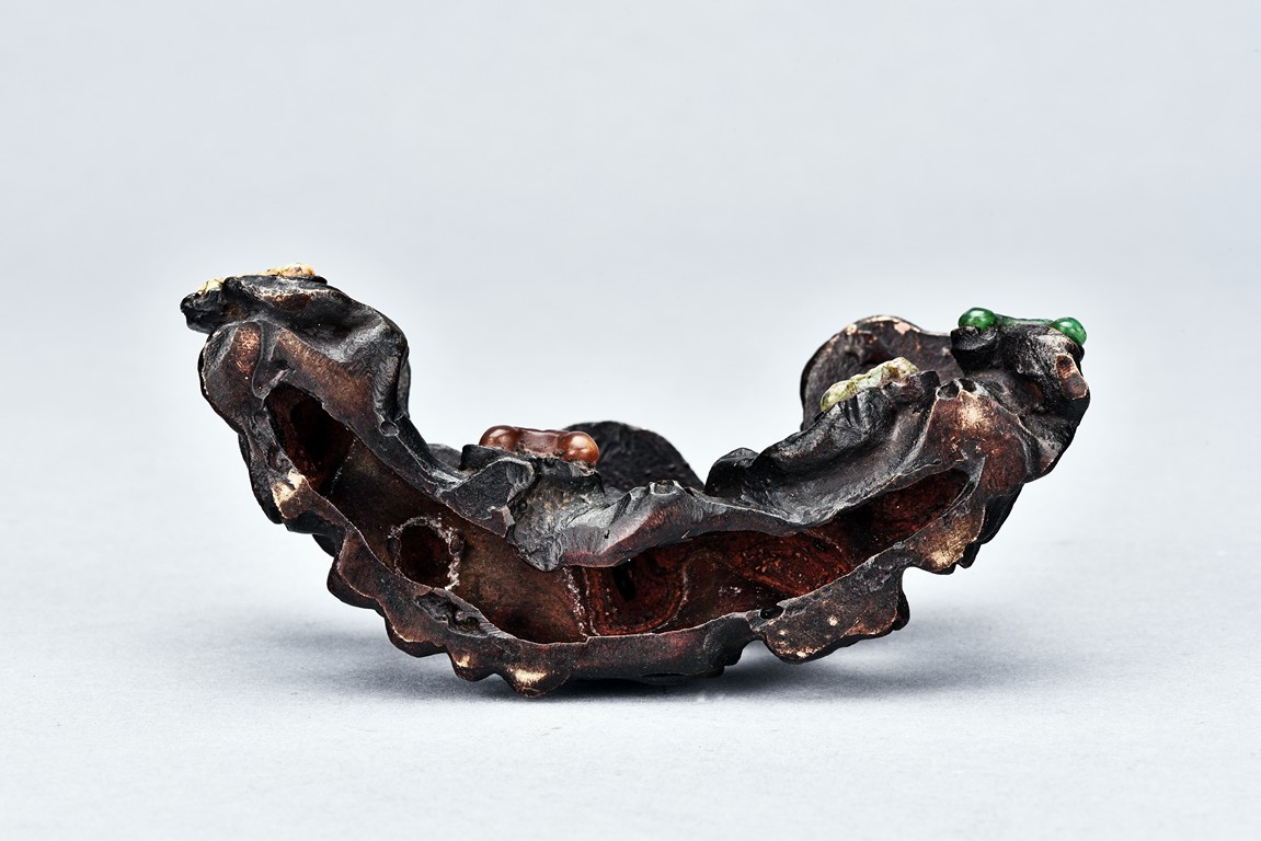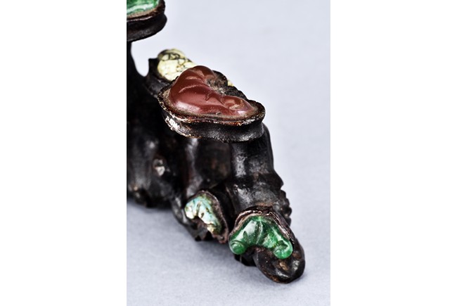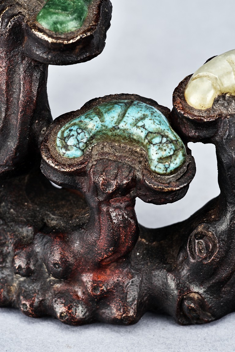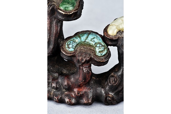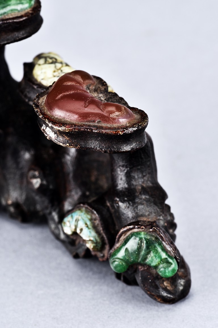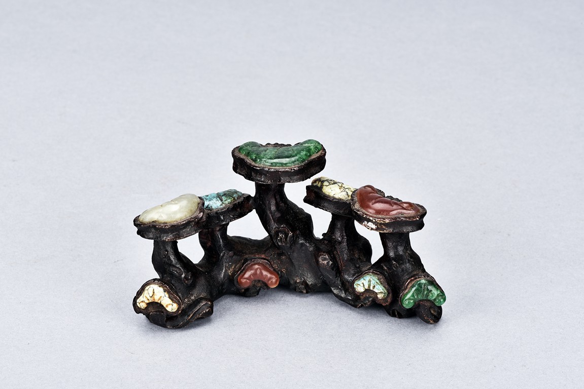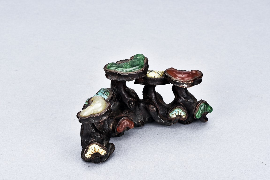 Modelled in the form of five irregular lingzhi head issuing from rocky outcrop bottom, each head is inlaid with semi-precious stone, including white jade, turquoise, agate, spinach jade. The bottom further embellished with four ruyi heads.