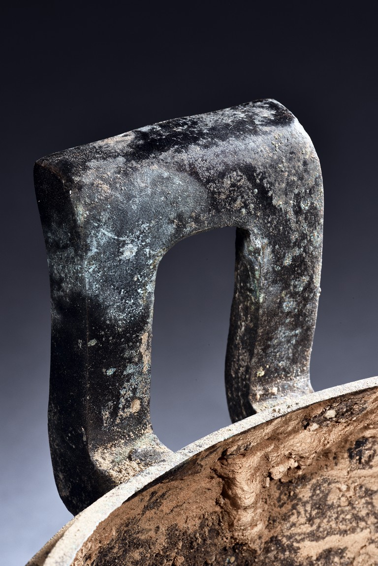 Standing on three tall curved legs, the domed cover and body decorated with repeated leiwen , flanked by projecting arched handles below the three small rings. Qing Dynasty period.