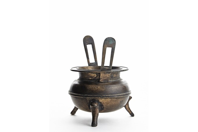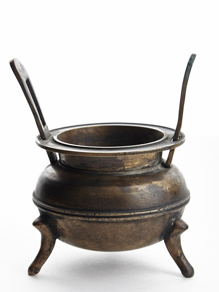 Of compressed globular form, the censer is supported on three splayed feet, the cylindrical neck rises to wide everted rim, flanked by two handles with rectangular opening through the rim. Qing Dynasty period.