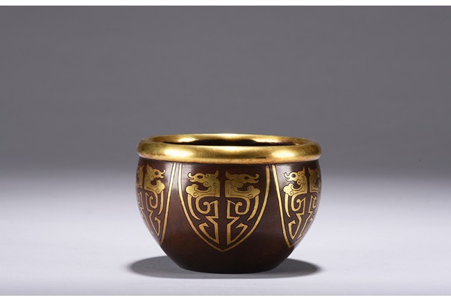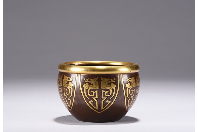 A GOLD-INLAID BRONZE 'DRAGON' BOWL    銅錯金仿古獸紋缽