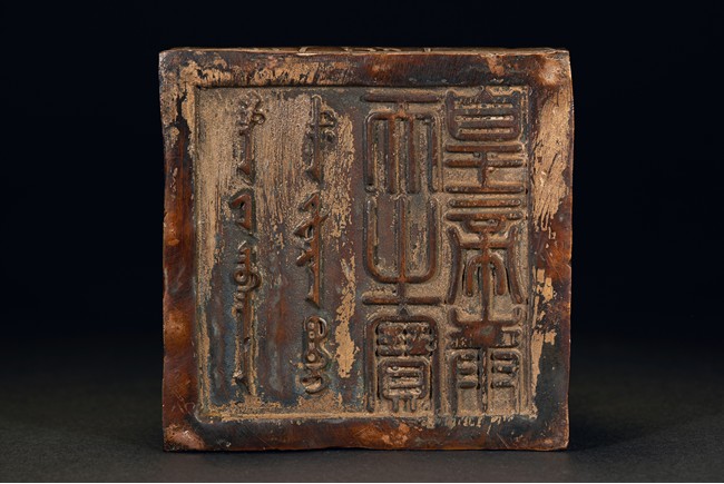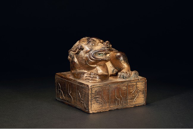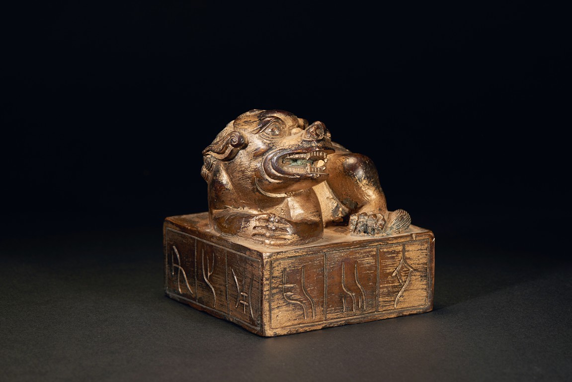 Of square section, the seal is surmounted by a finial in the form of a recumbent lion turned back its head, with bulging eyes, powerful nose, curly mane, the face with ferocious expression. Each side carved with three stylized characters in relief. The base with the sign and characters mark.