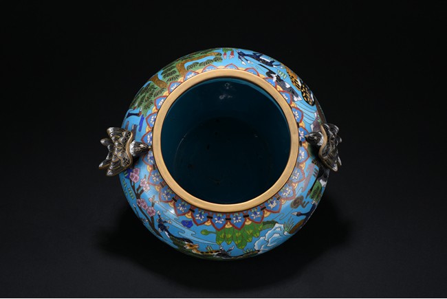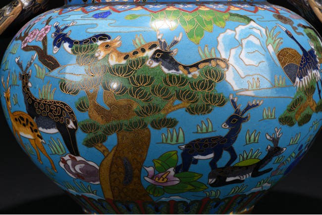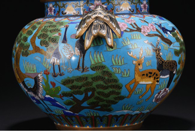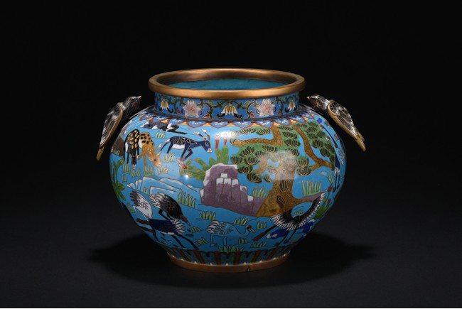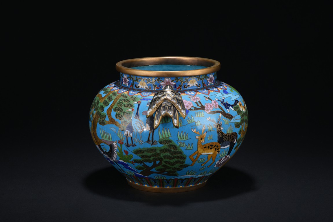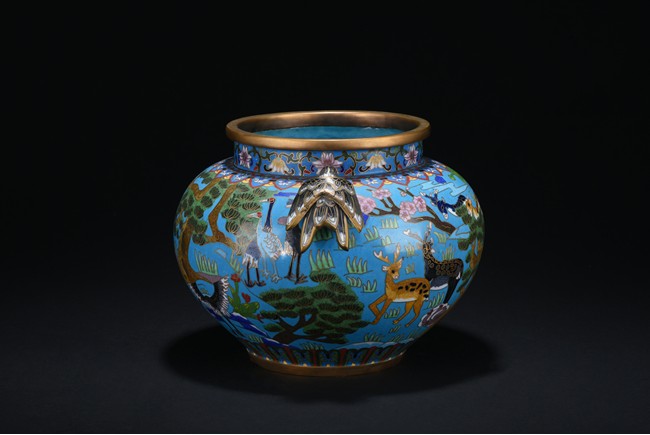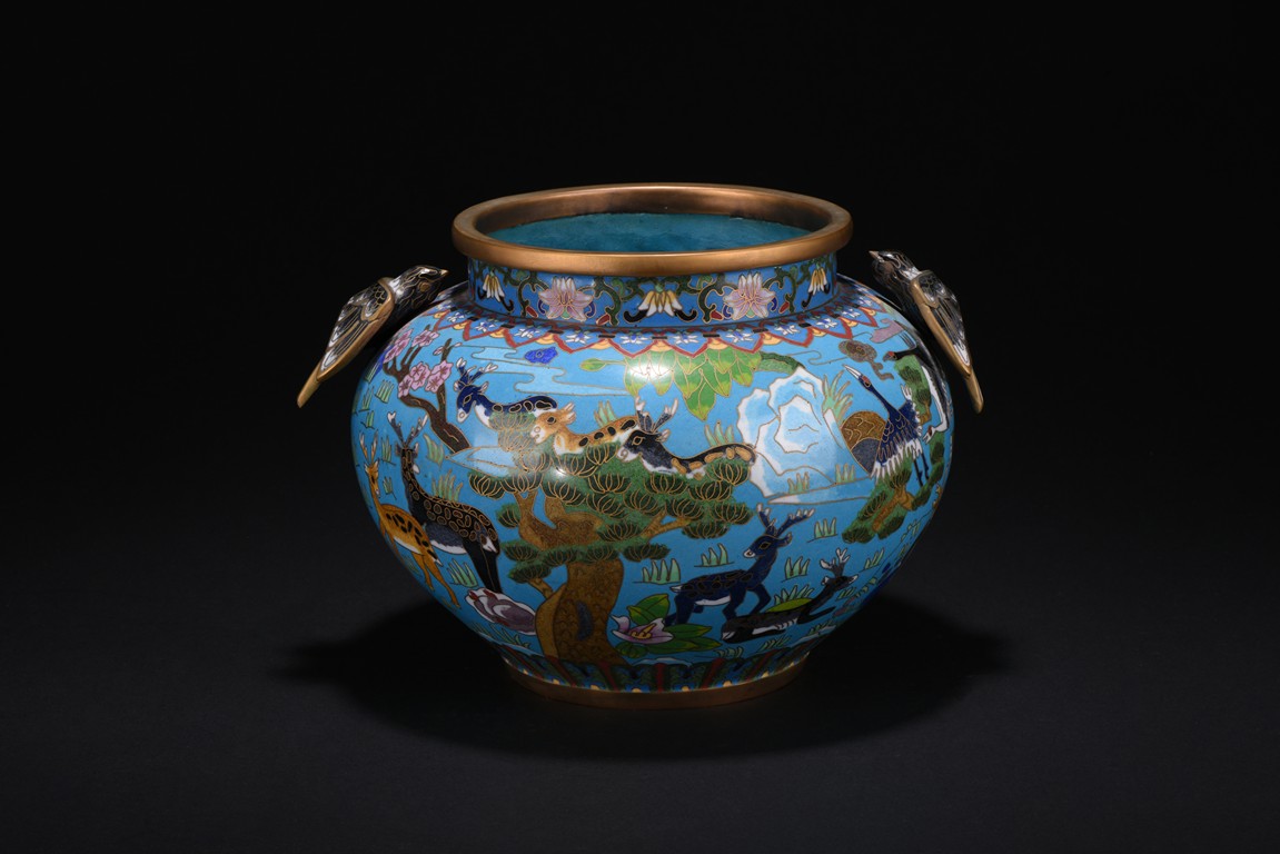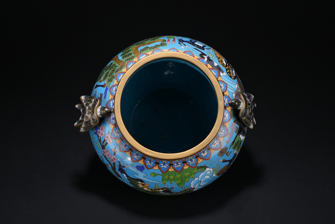 Of compressed globular form, raised on short circular foot and with short straight neck and slightly everted rim in gilt bronze, decorated around the exterior with continuous scene of various deers standing under the pine trees among the mountain settings, all against polished sky blue ground, the sides applied with two cleverly cast perching birds as handles.