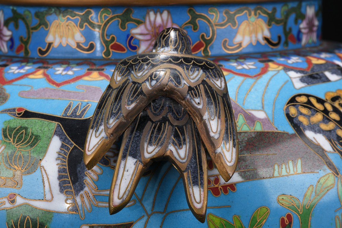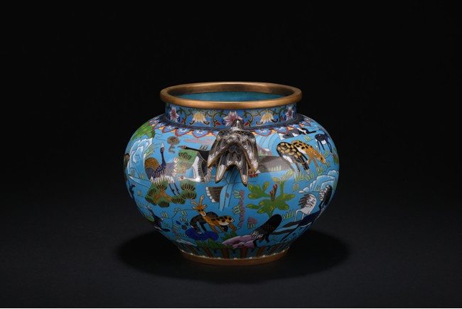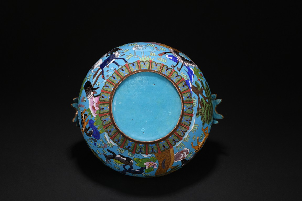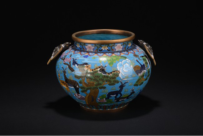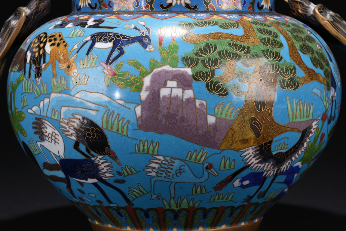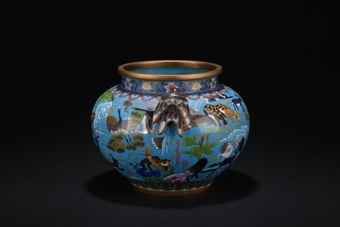 Of compressed globular form, raised on short circular foot and with short straight neck and slightly everted rim in gilt bronze, decorated around the exterior with continuous scene of various deers standing under the pine trees among the mountain settings, all against polished sky blue ground, the sides applied with two cleverly cast perching birds as handles.