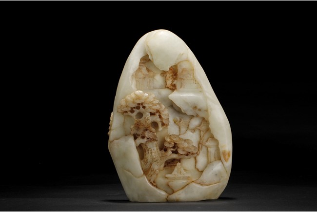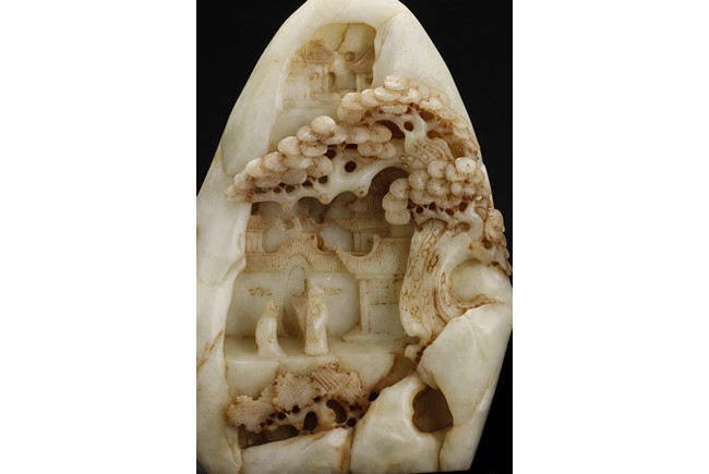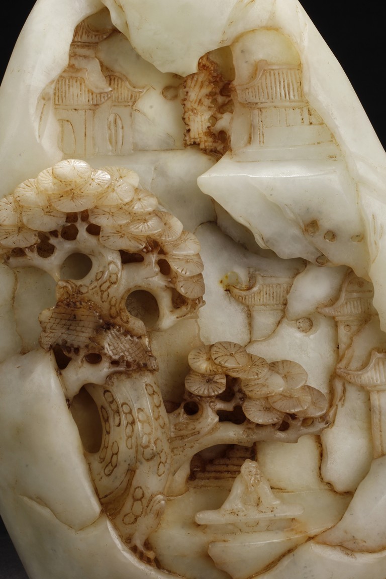Of irregular shape, high relief carved on both sides, one side with a monk and an elder meeting in front of a hidden temple beneath dense pine trees, the other side with an elder playing Chinese musical instrument under pine trees, with a path leading into the mountain behind him; the stone of pale white color with some russet. 19th century.