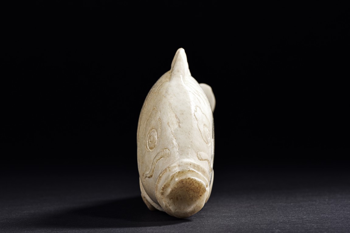 The jade is modelled as a fish flicking its tail slightly upwards, the body finely incised to represent scales.