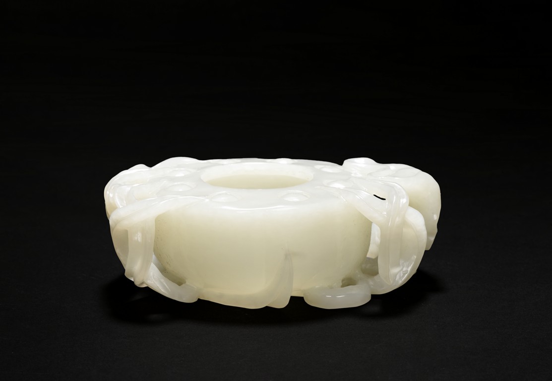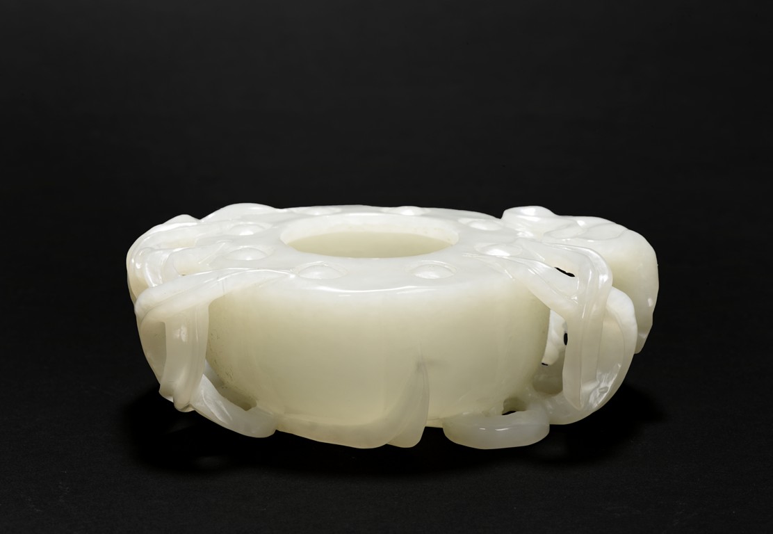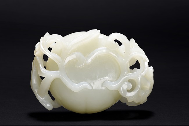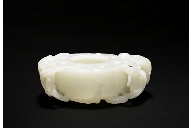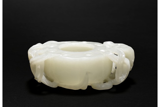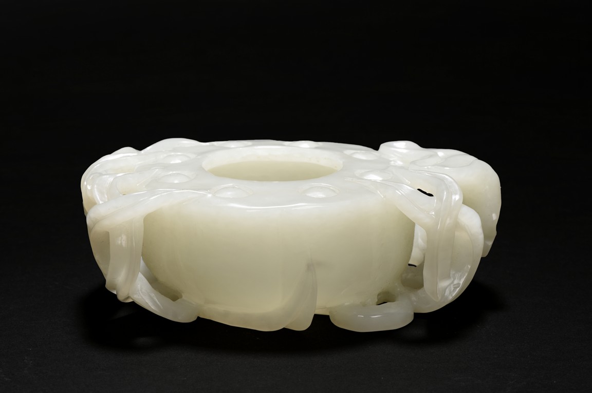 Carved in the round as a lotus pod with delicate lotus flowers and curly leaves on the sides issuing from the base. The stone is of softly polished even white tone.