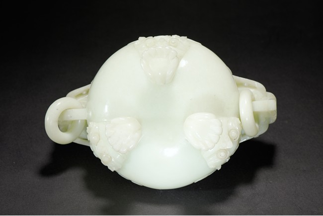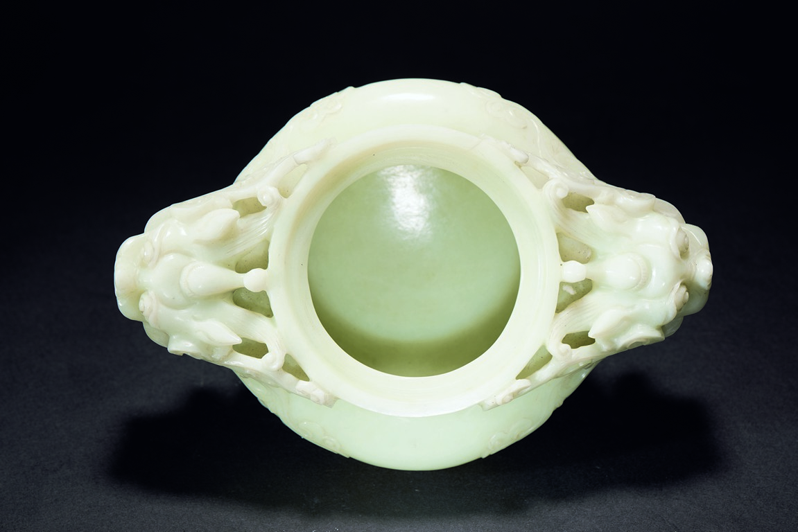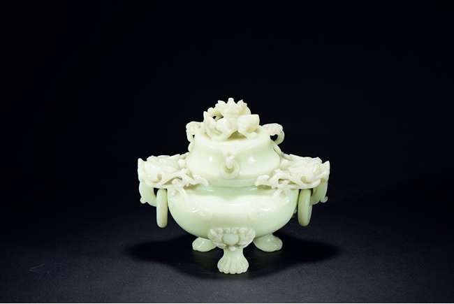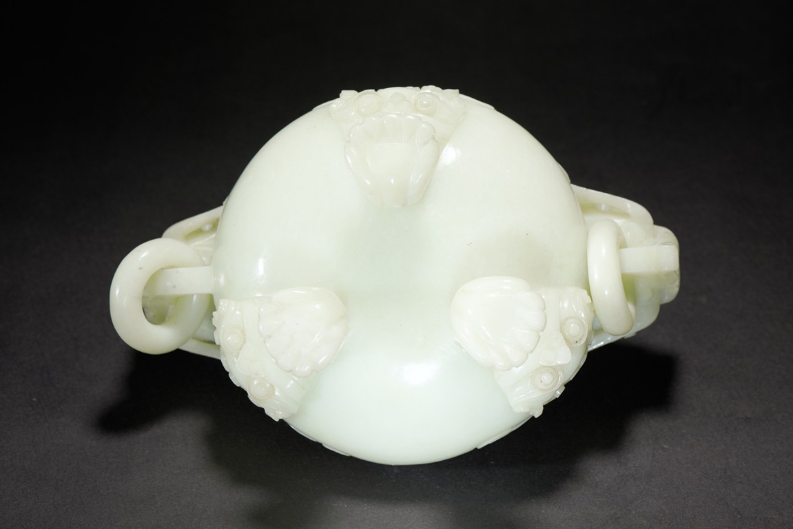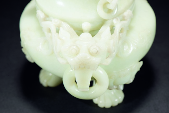 Supported on three beast feet, the body is of compressed globular form, flanked by two dragon heads suspended with loose ring, the cover further surmounted with a sinuous chilong.