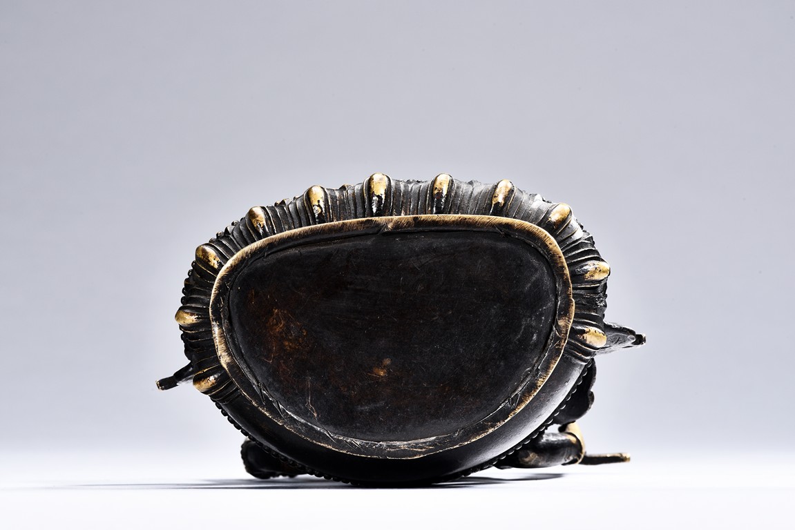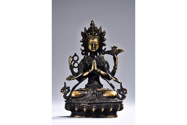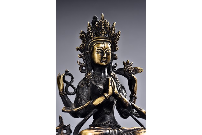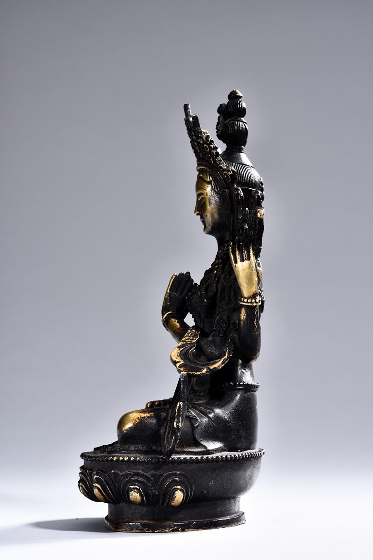 Shown seated on single lotus throne, hands clasped in one, face with serene expression and topped with pointed crown.