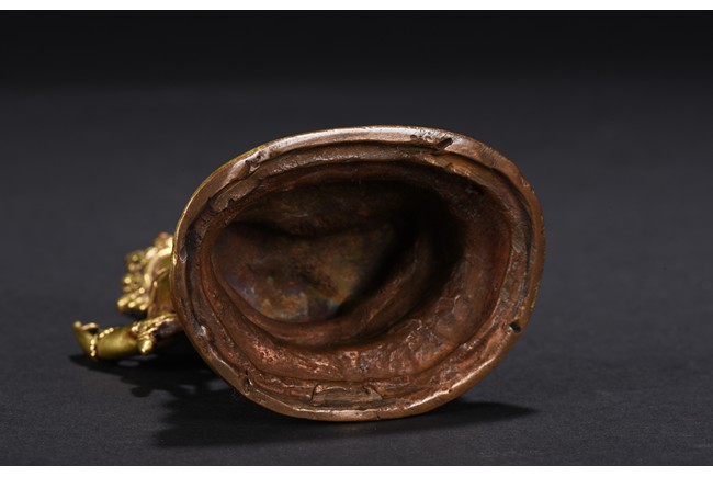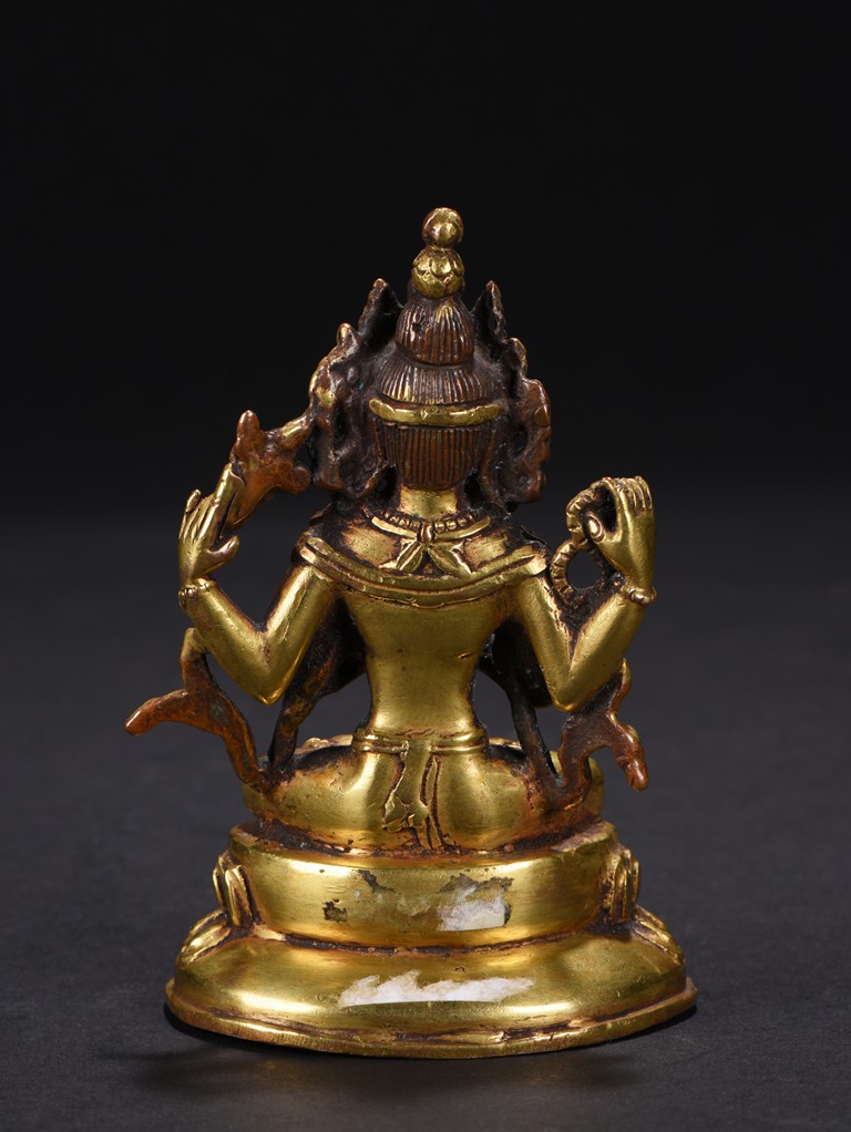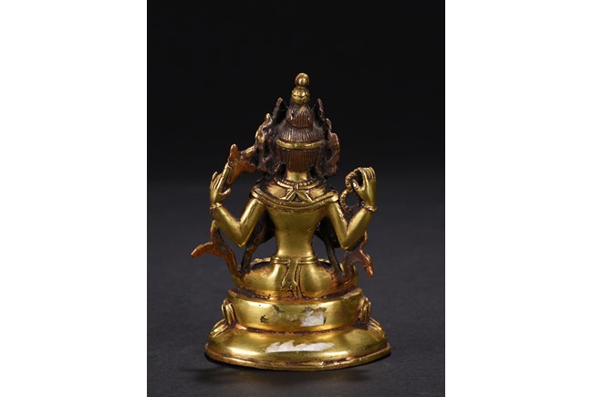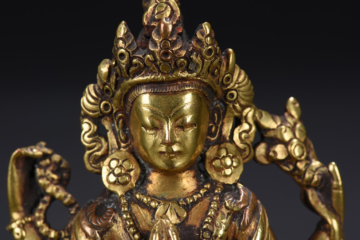 The figure is seated upon a double lotus throne, with primary hands in namaskar mudra and the secondary hands holding a lotus stem, chest adorned with beaded jewelry, the face with benign expression flanked by pendulous ears with circular earrings, topped with pointed crown.
