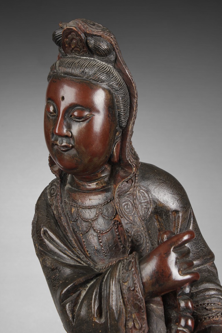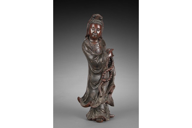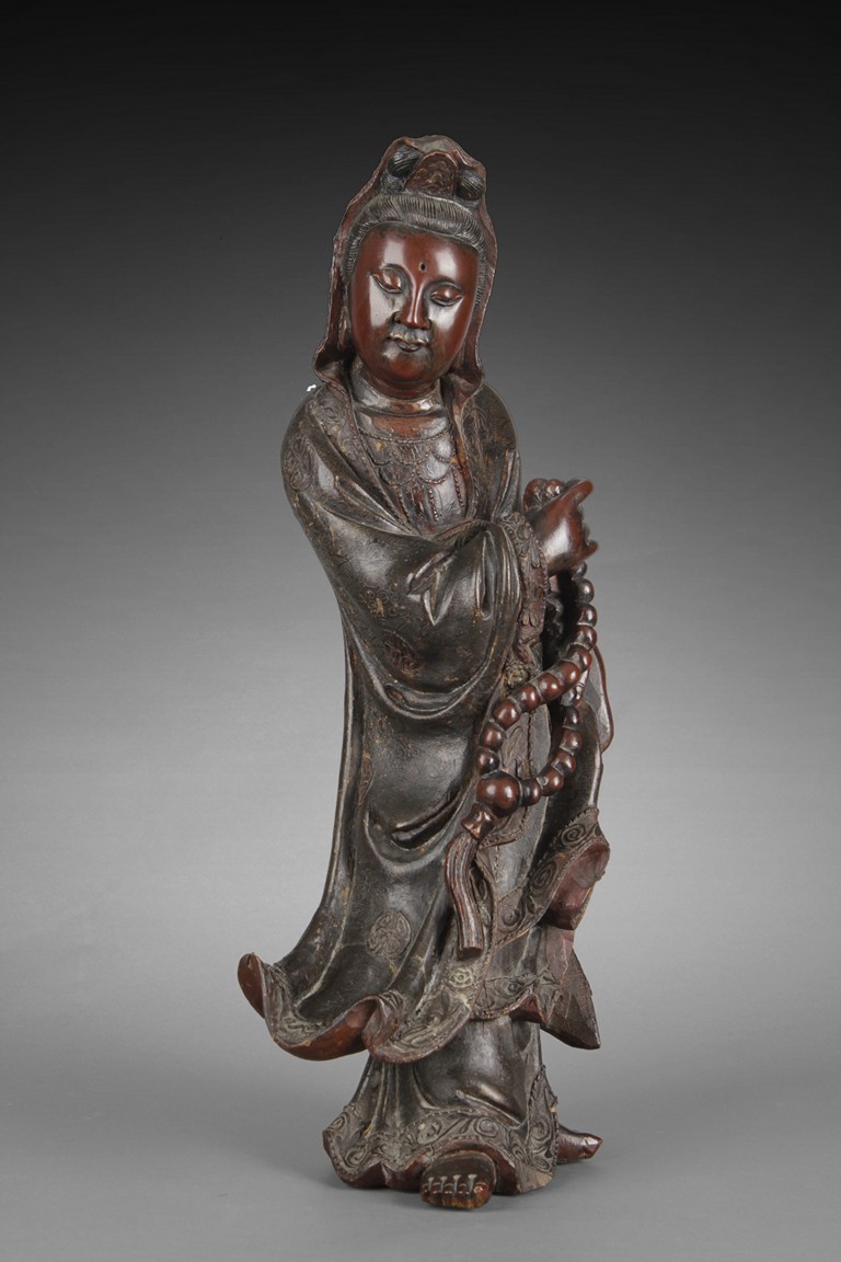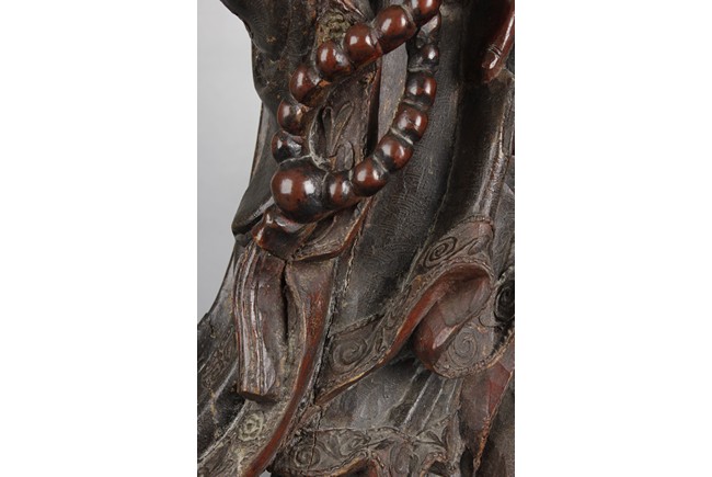 The figure modeled standing bare feet, wearing a long-sleeved robe with intricate patterns around the edges, falling in deep folds around the body and open at the chest to reveal an ornate necklace, one hand holding a large strand of prayer beads, the face shows a serene expression, the wood with natural color and grain. Age related damage and slight cracks. Qing Dynasty period.