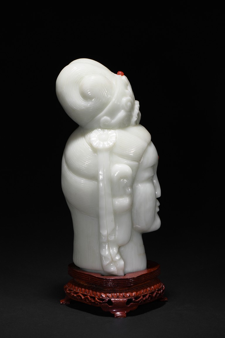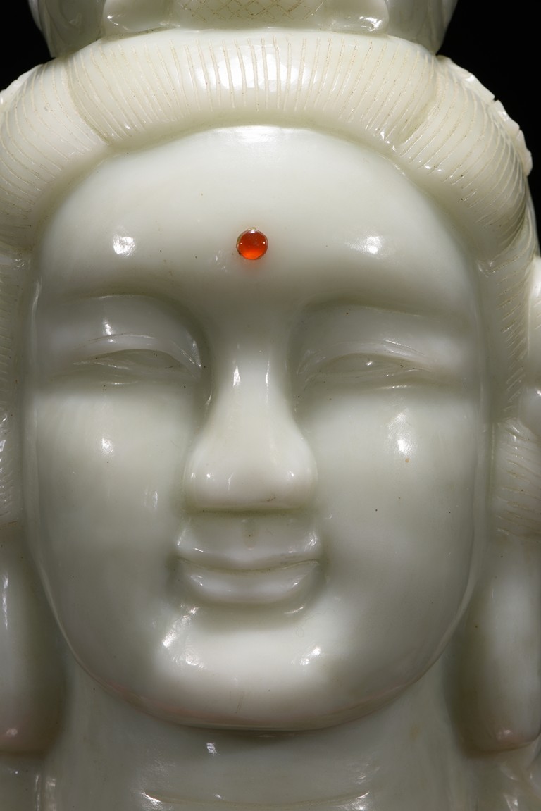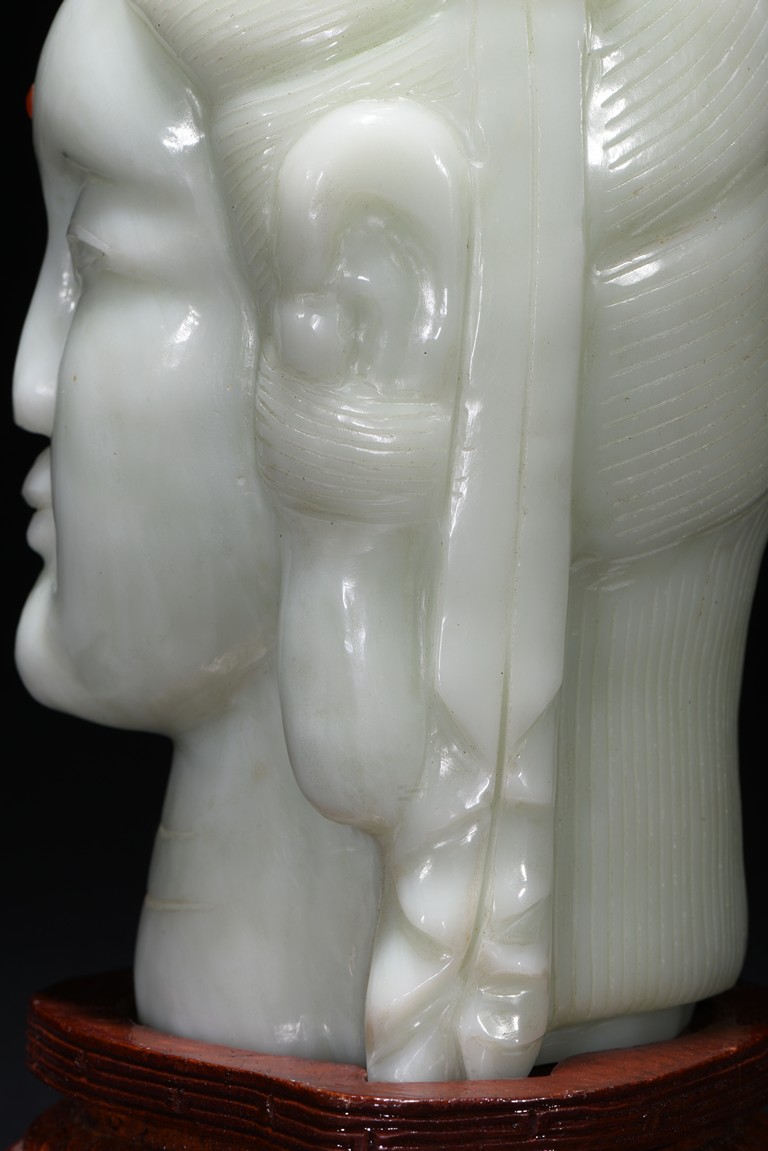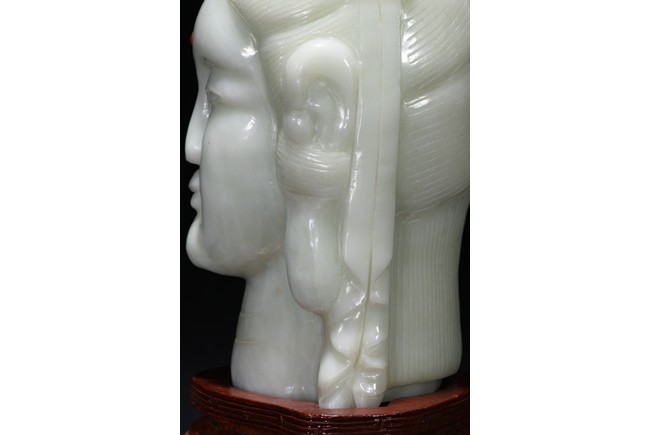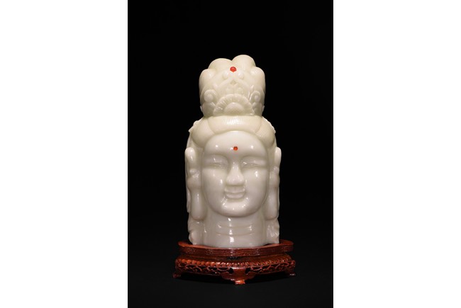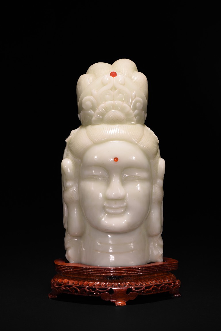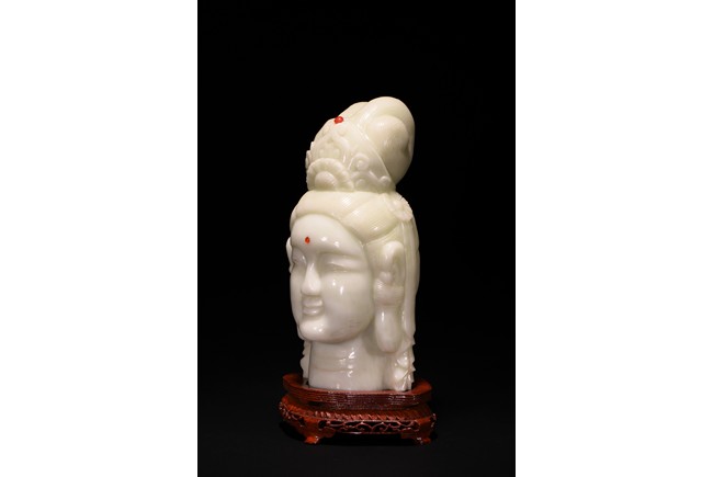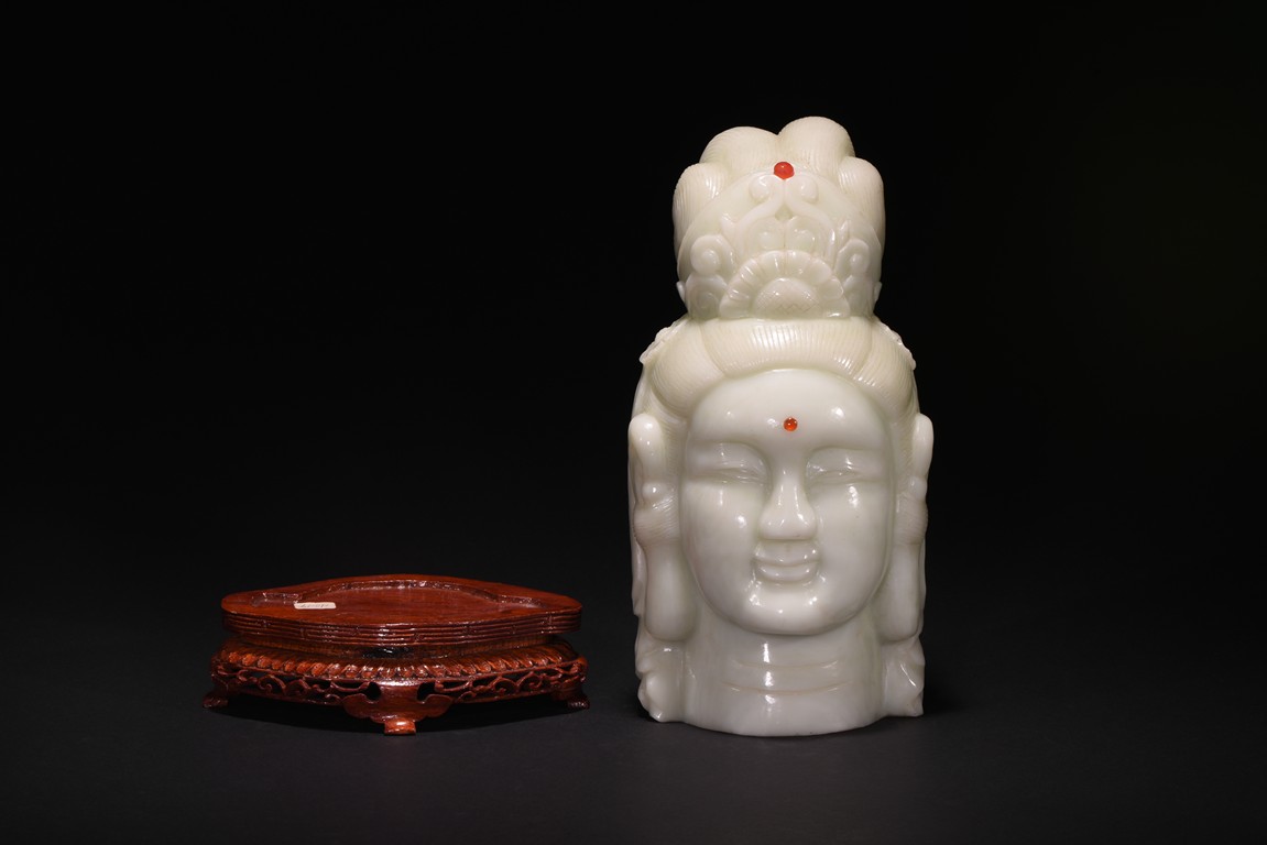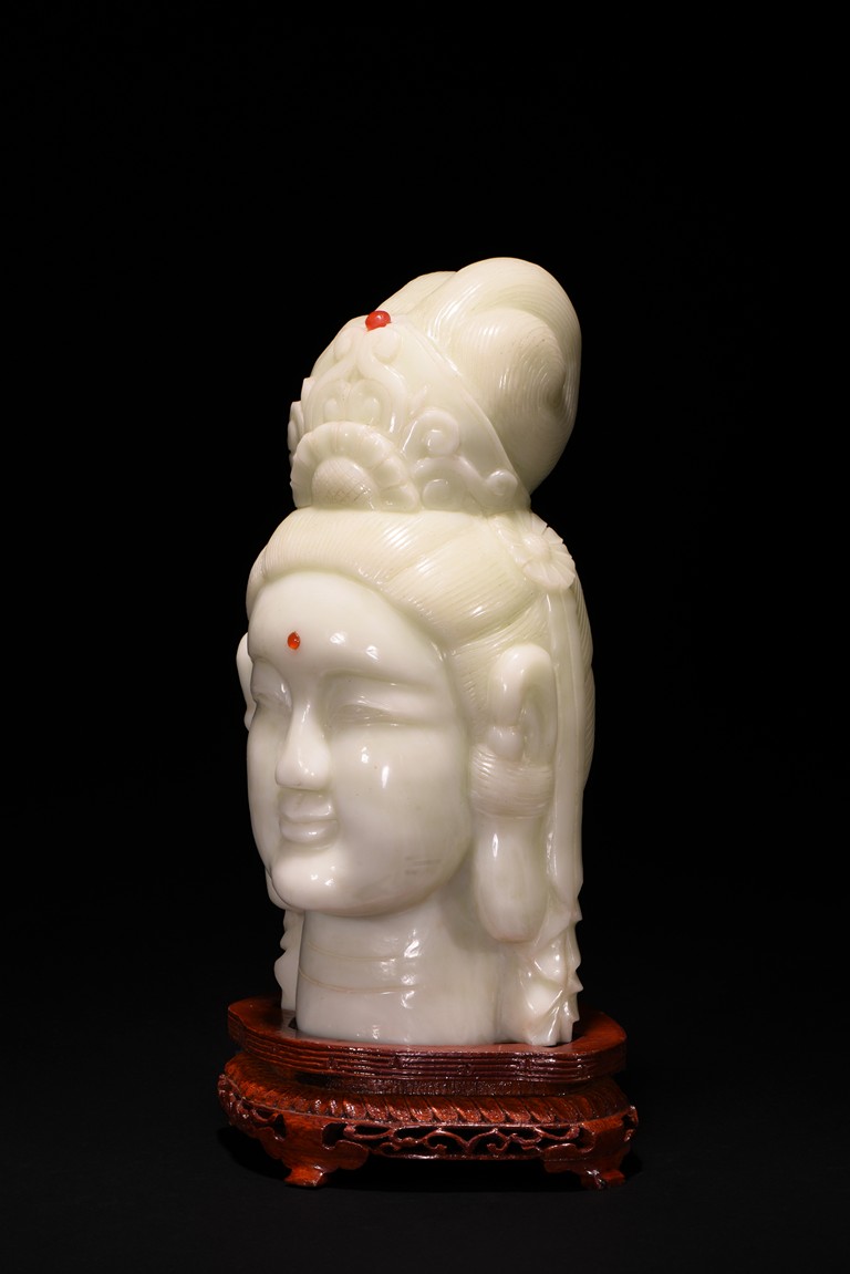 Cast in the round, the face with large smiling eyes and gentle smile wearing a contemplative expression, the forehead centred with a circular indentation that holding a red jewelled urna, the checks flanked by a pair of long pendulous ears, the well-articulated hair pulled up and back into a high chignon. The white jade head of guanyin fitted with a three short feet wood stand.