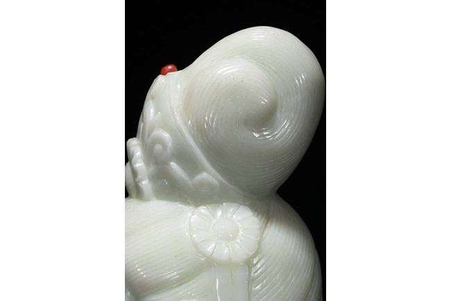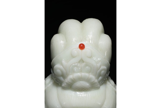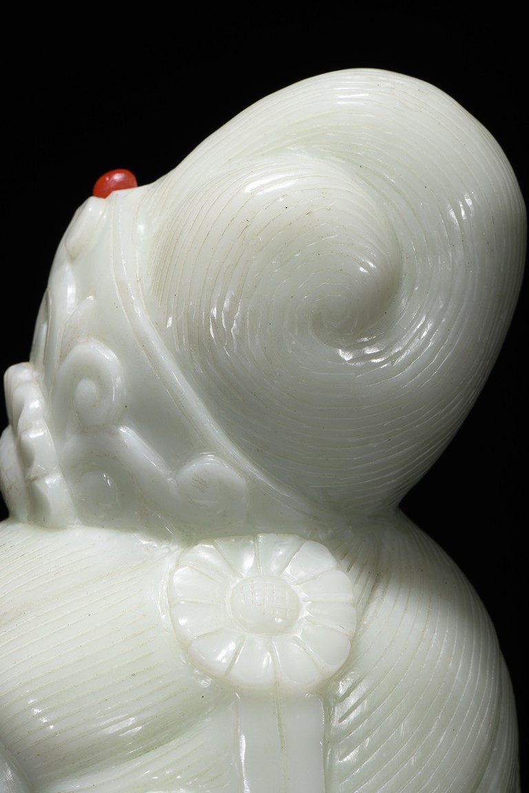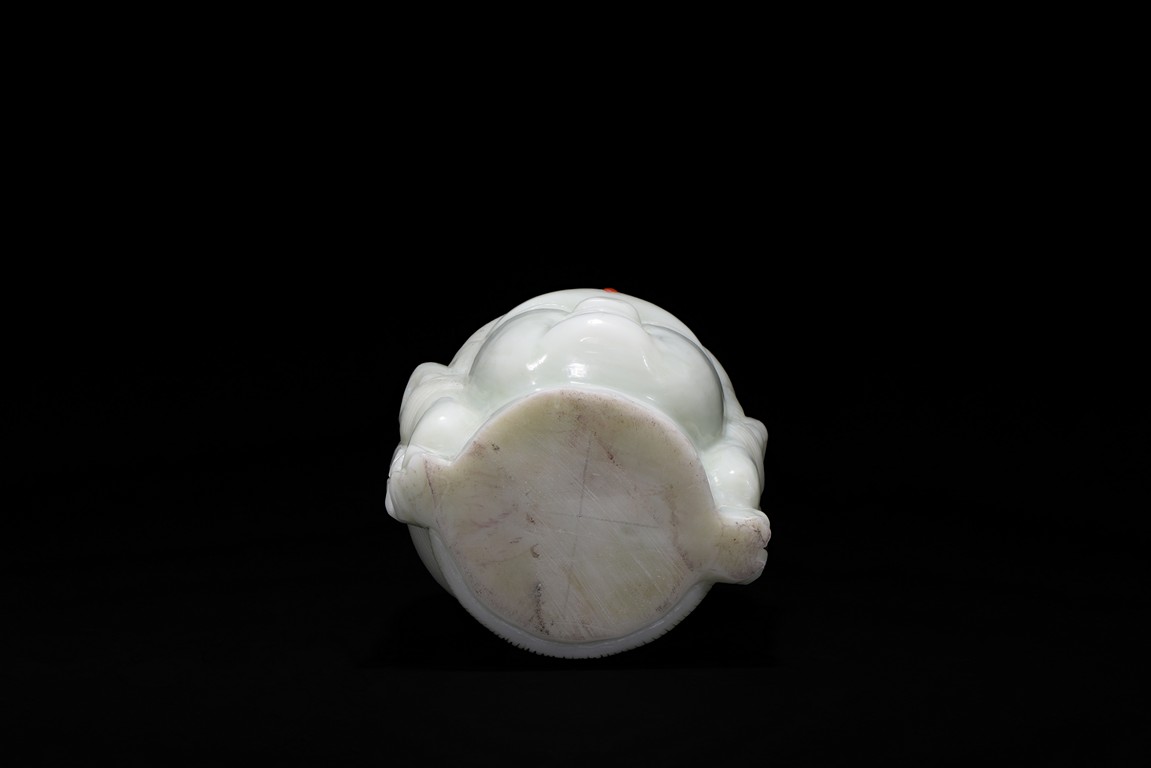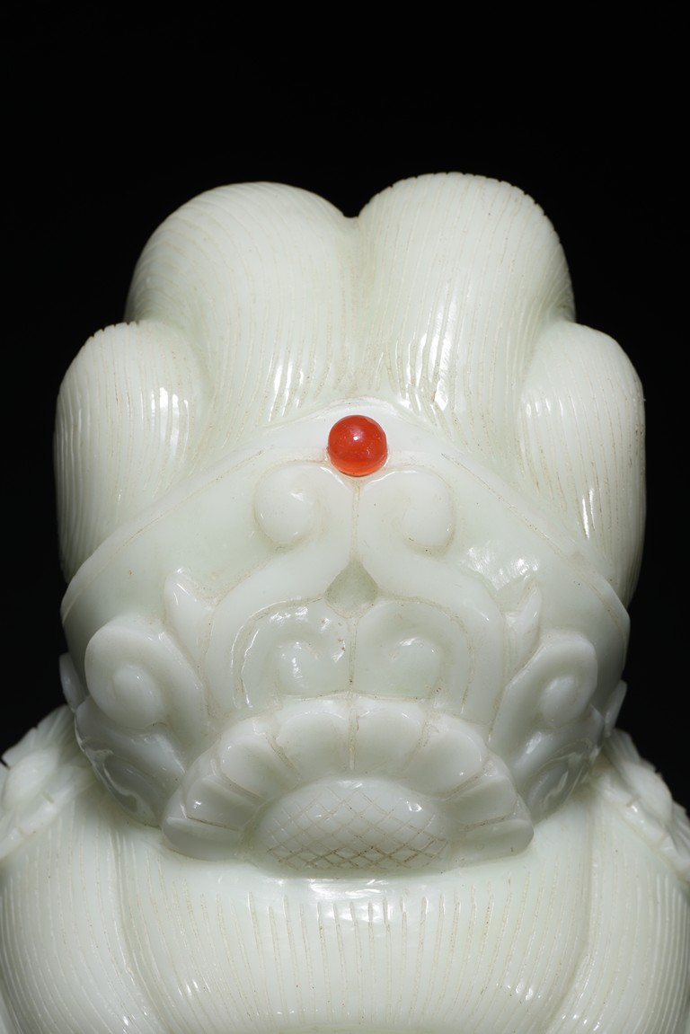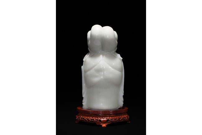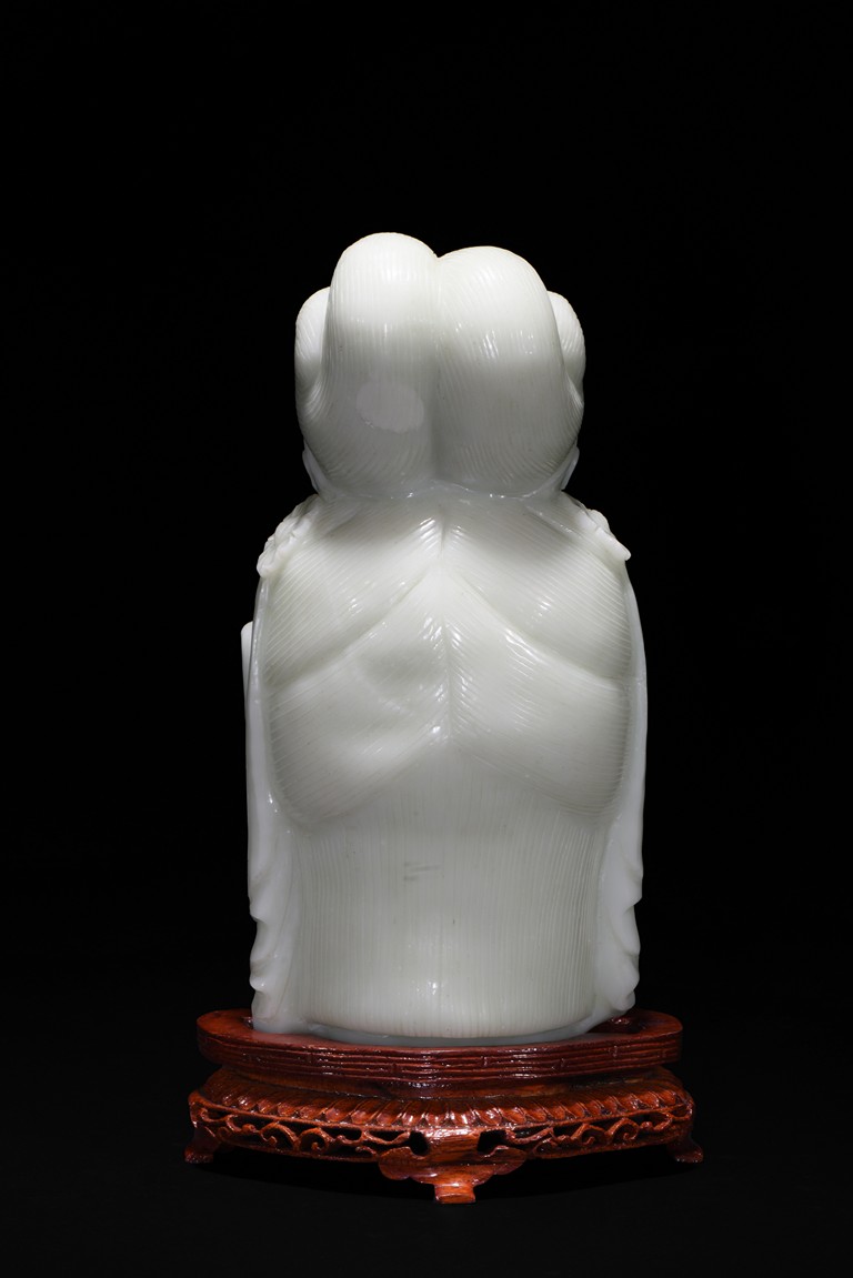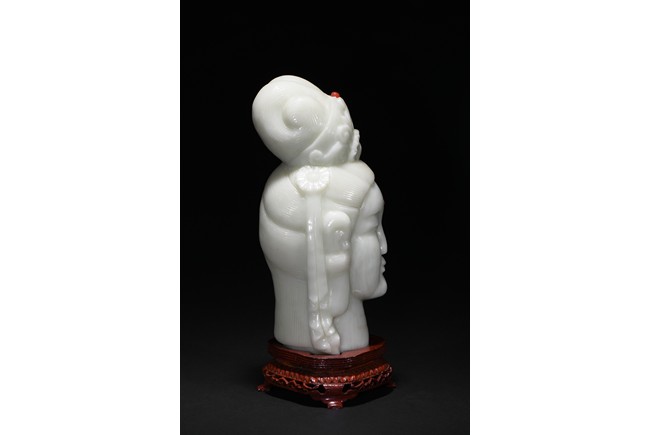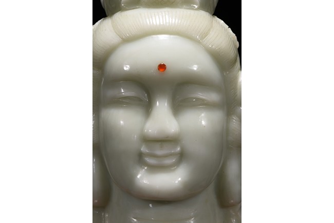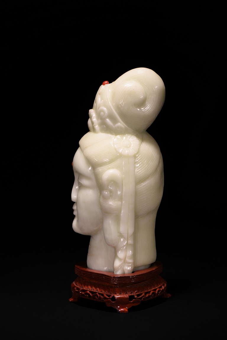 Cast in the round, the face with large smiling eyes and gentle smile wearing a contemplative expression, the forehead centred with a circular indentation that holding a red jewelled urna, the checks flanked by a pair of long pendulous ears, the well-articulated hair pulled up and back into a high chignon. The white jade head of guanyin fitted with a three short feet wood stand.