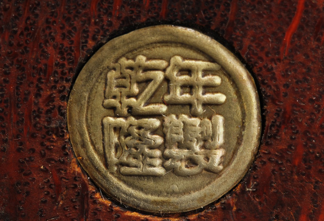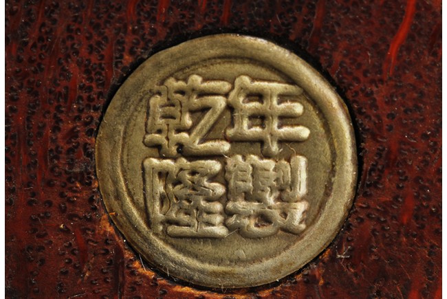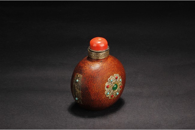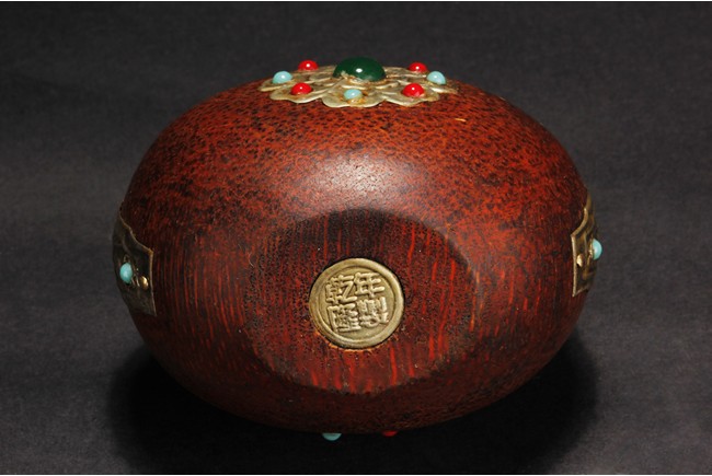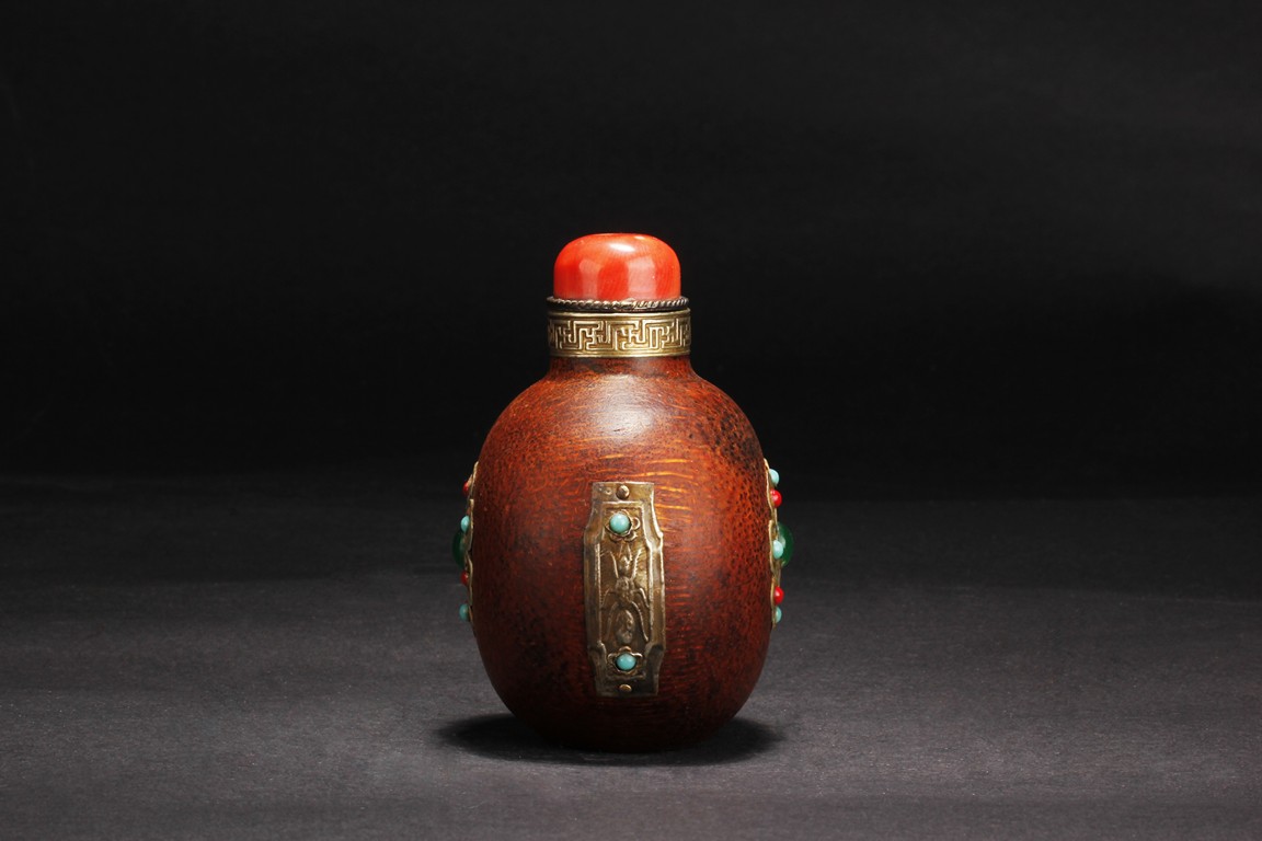 Of globular form with slightly flattened sides, the wood snuff bottle with grainy texture and dark brown color, decorated with silver, turquoise, and coral. Bottom bears four character 'QIANLONG' mark. 19th century.