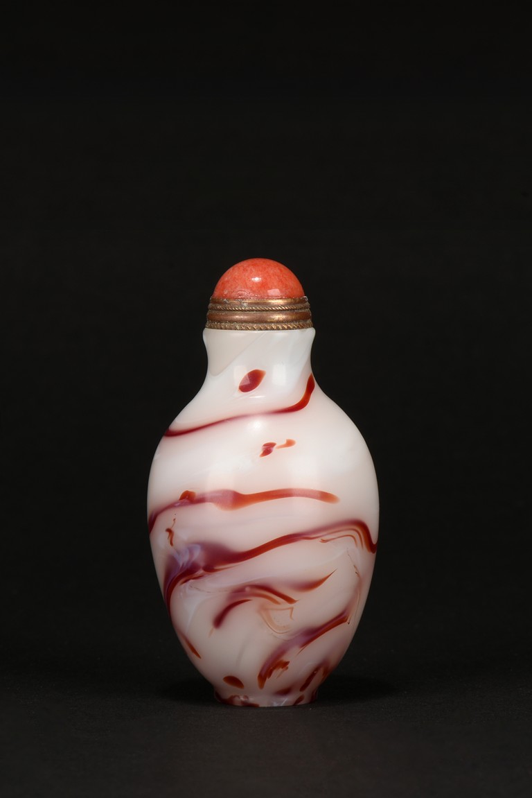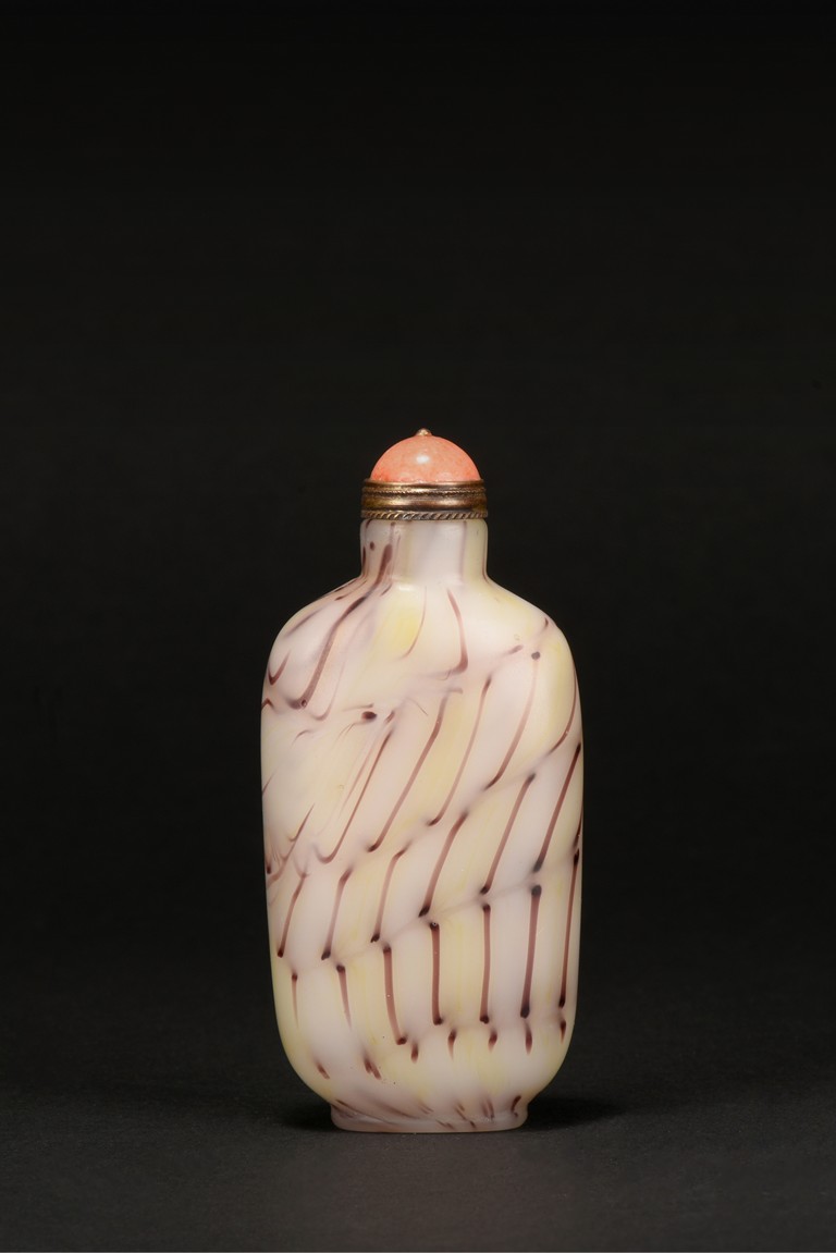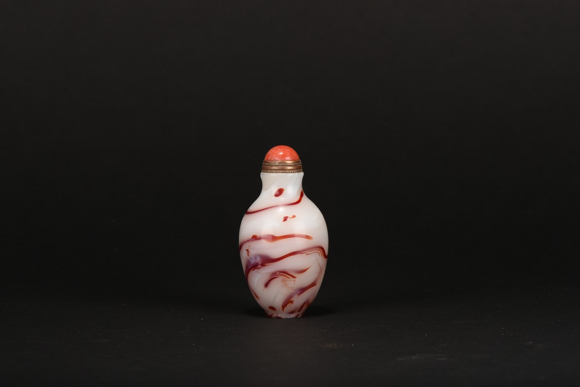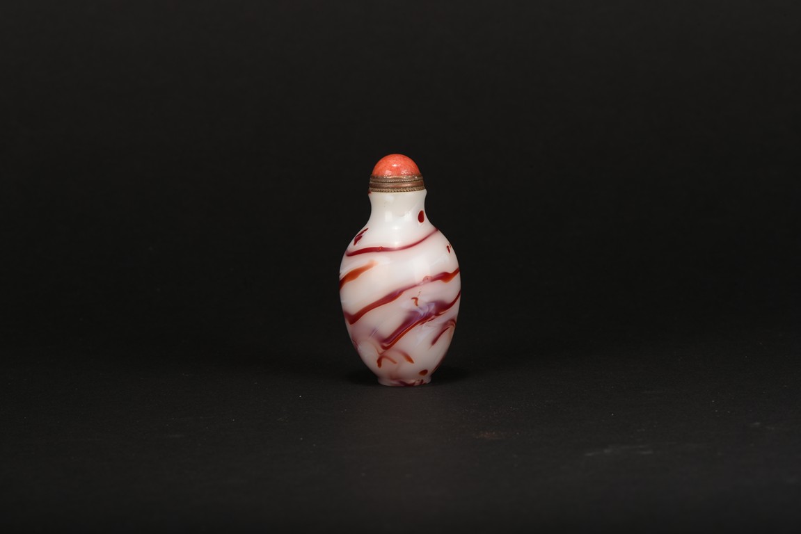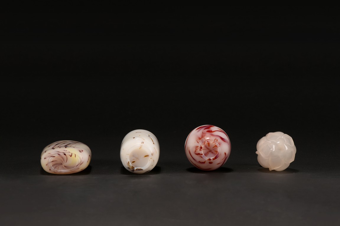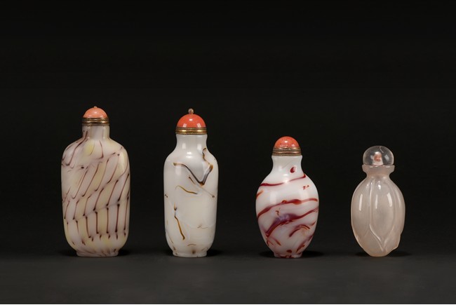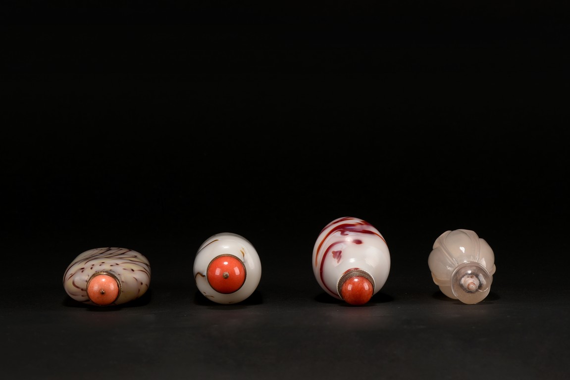 Composing of four glass snuff bottles, one is of oval form with translucent white tone; one is of rectangular form decorated with brown and yellow spirals reserved white tone; one is of cylindrical form with irregular spirals in white and brown covered overall; one is of ovoid form covered with red spiral grains over white agate.