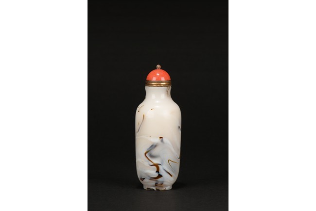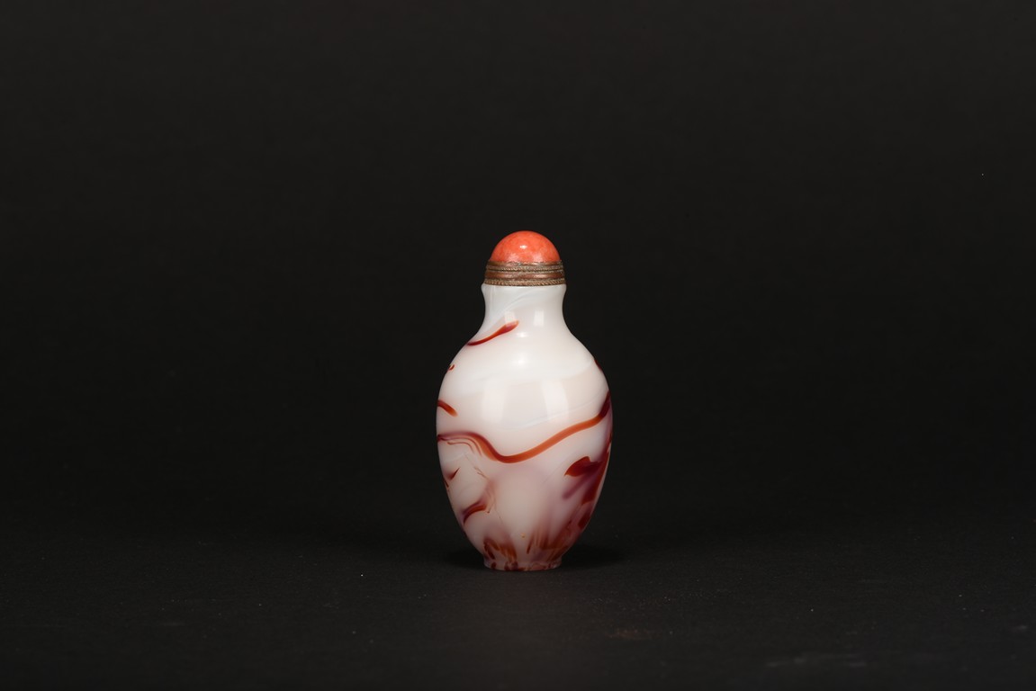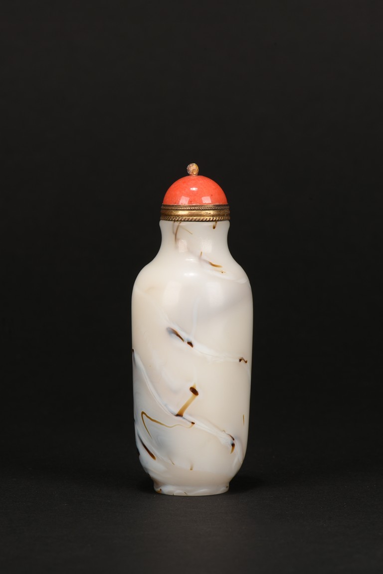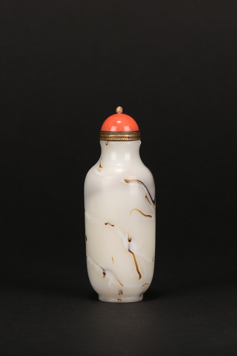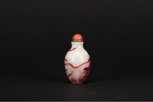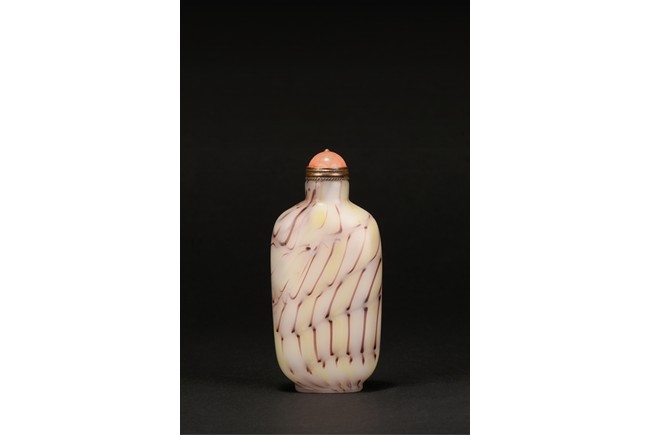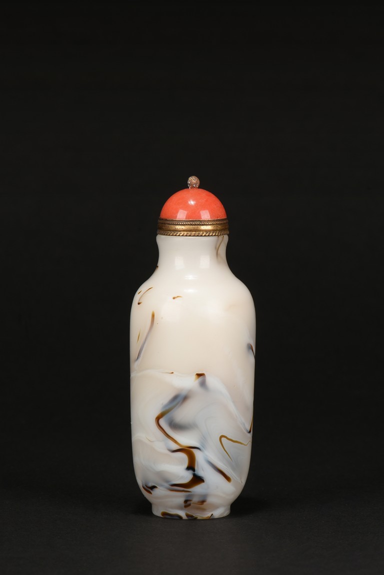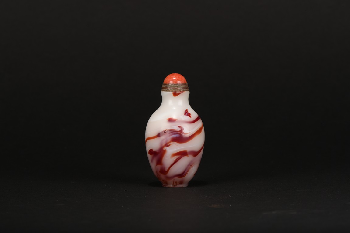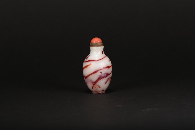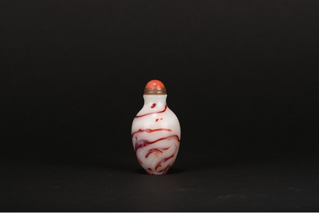 Composing of four glass snuff bottles, one is of oval form with translucent white tone; one is of rectangular form decorated with brown and yellow spirals reserved white tone; one is of cylindrical form with irregular spirals in white and brown covered overall; one is of ovoid form covered with red spiral grains over white agate.