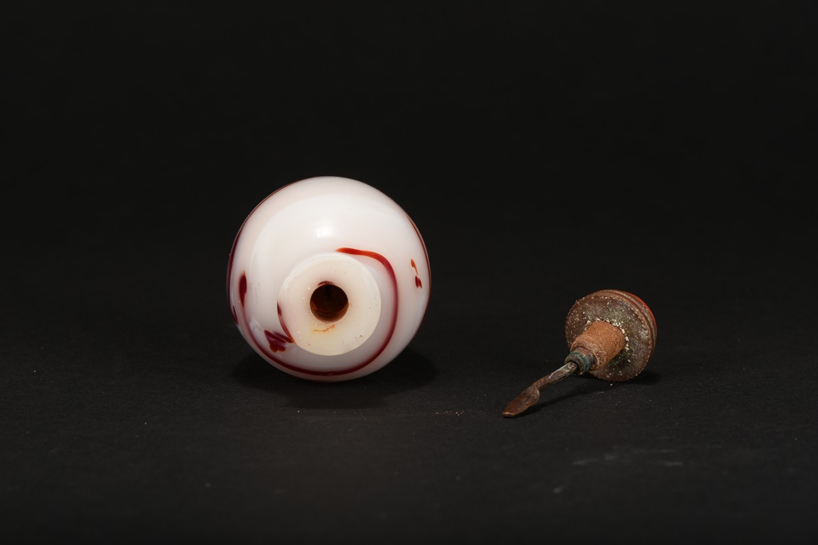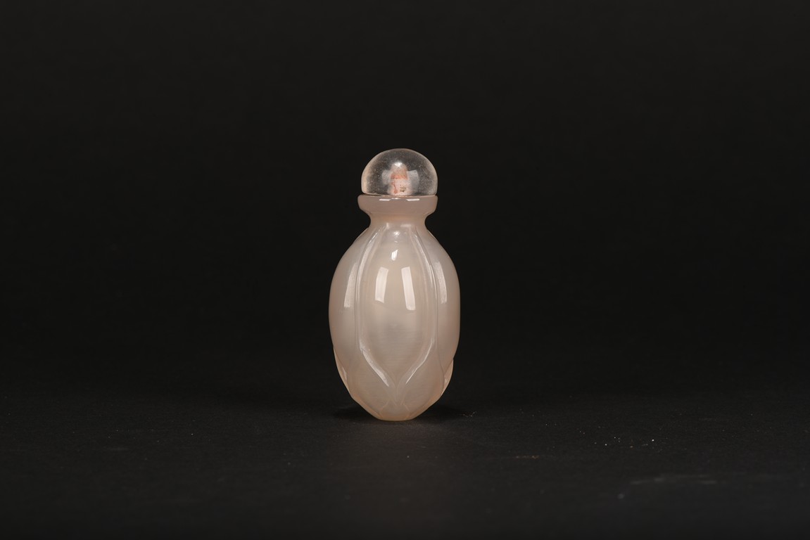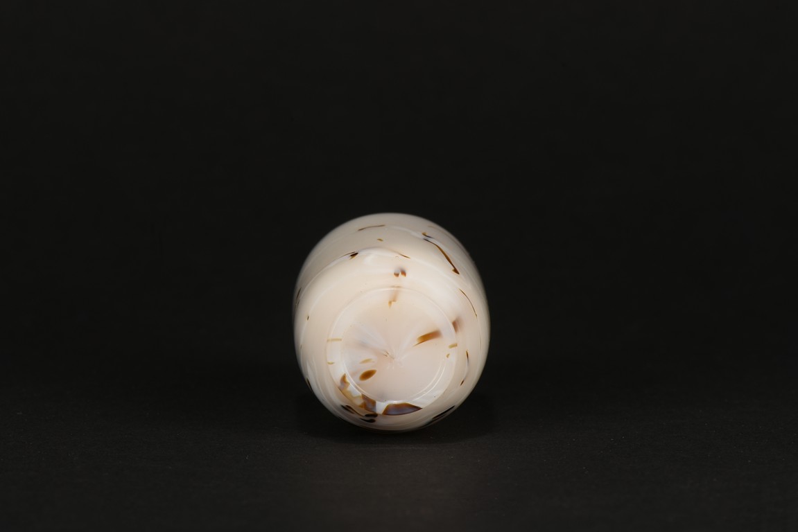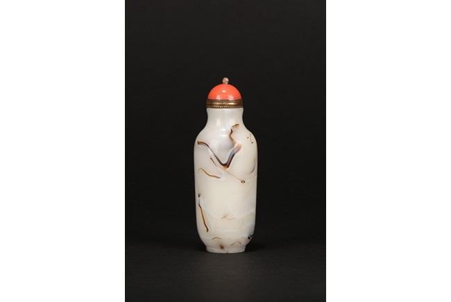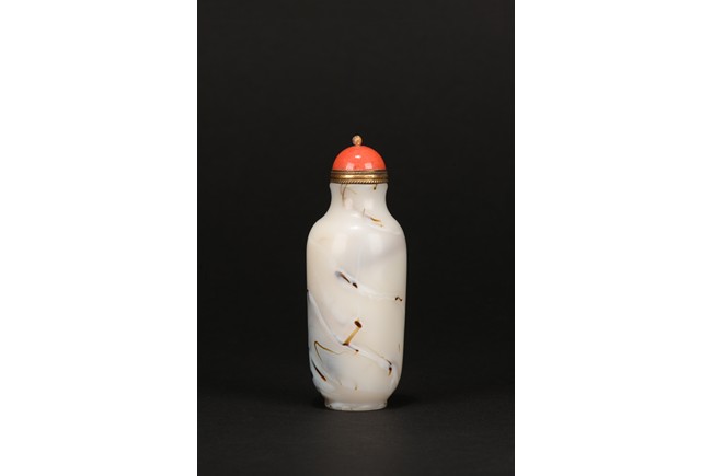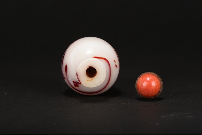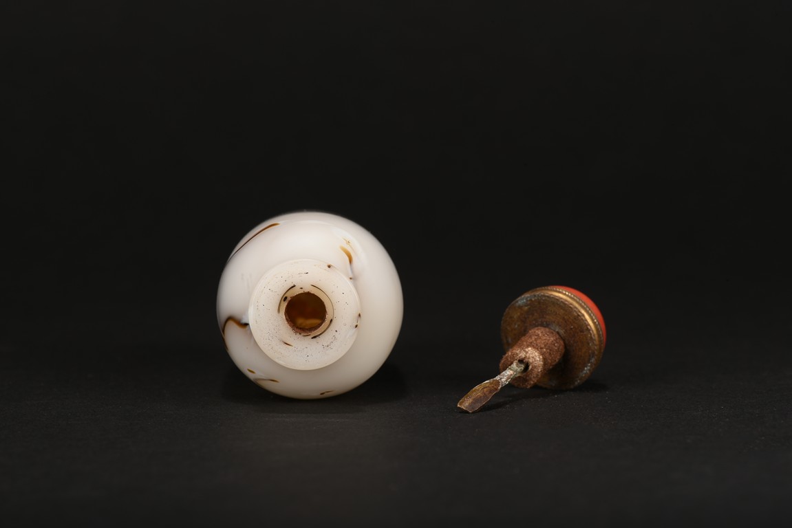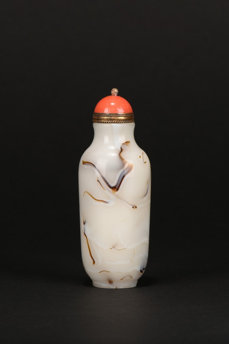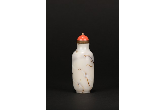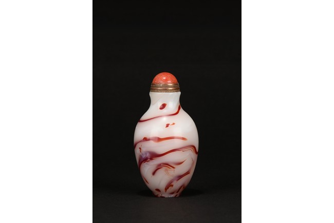 Composing of four glass snuff bottles, one is of oval form with translucent white tone; one is of rectangular form decorated with brown and yellow spirals reserved white tone; one is of cylindrical form with irregular spirals in white and brown covered overall; one is of ovoid form covered with red spiral grains over white agate.