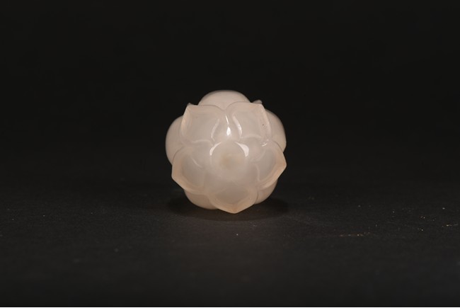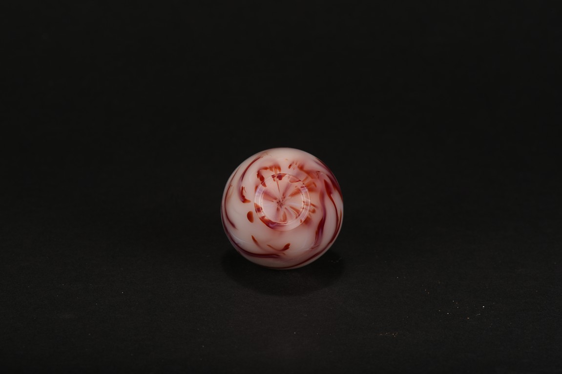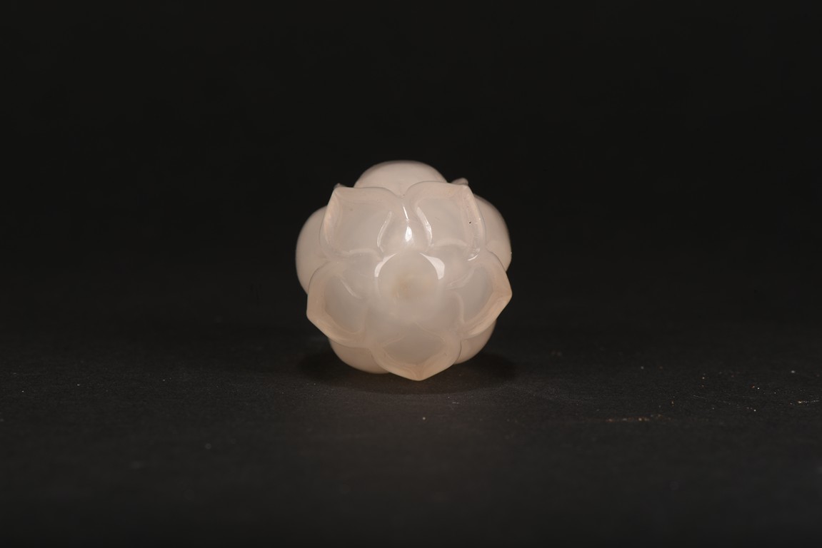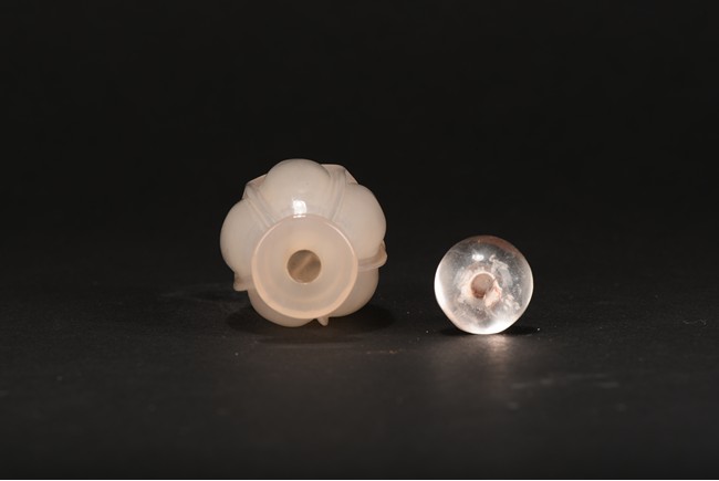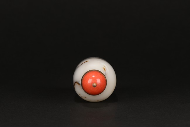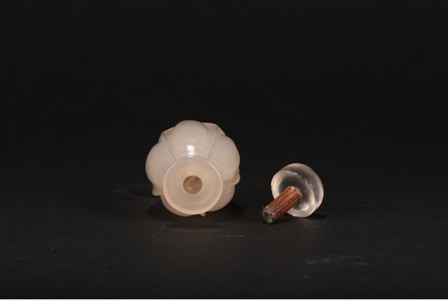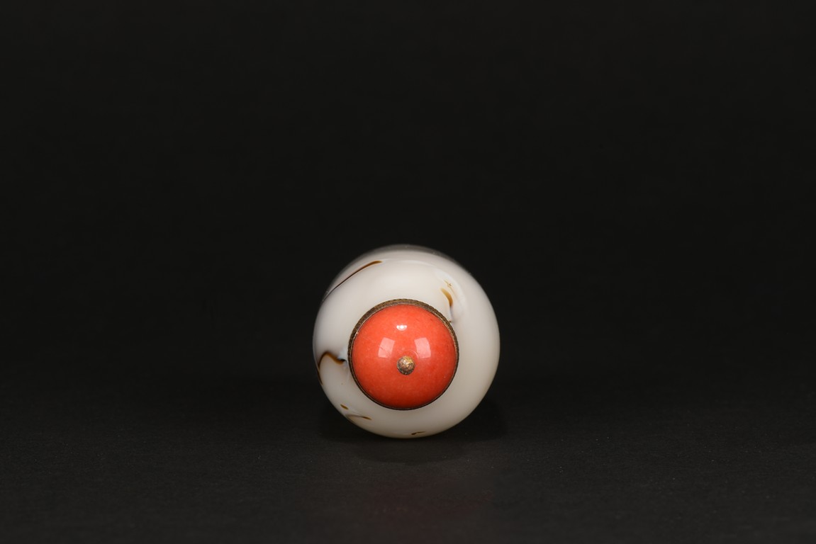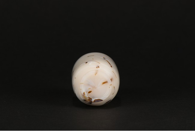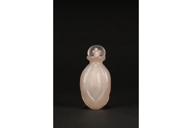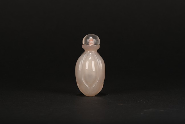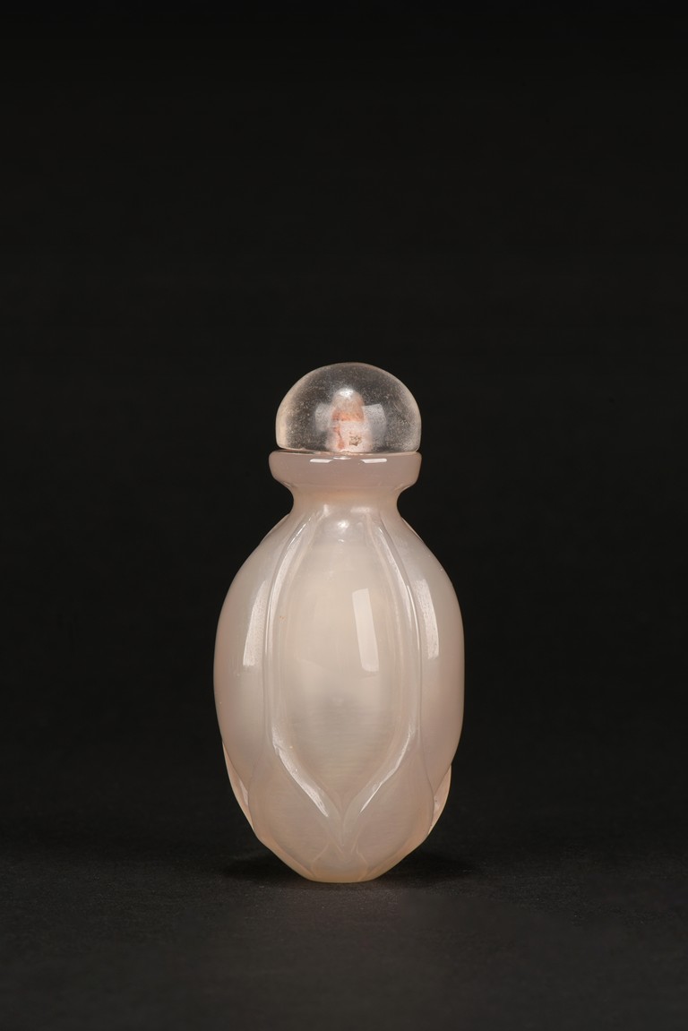 Composing of four glass snuff bottles, one is of oval form with translucent white tone; one is of rectangular form decorated with brown and yellow spirals reserved white tone; one is of cylindrical form with irregular spirals in white and brown covered overall; one is of ovoid form covered with red spiral grains over white agate.
