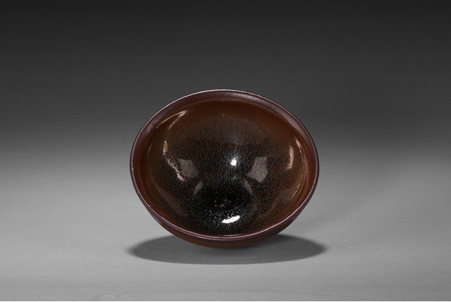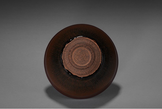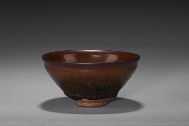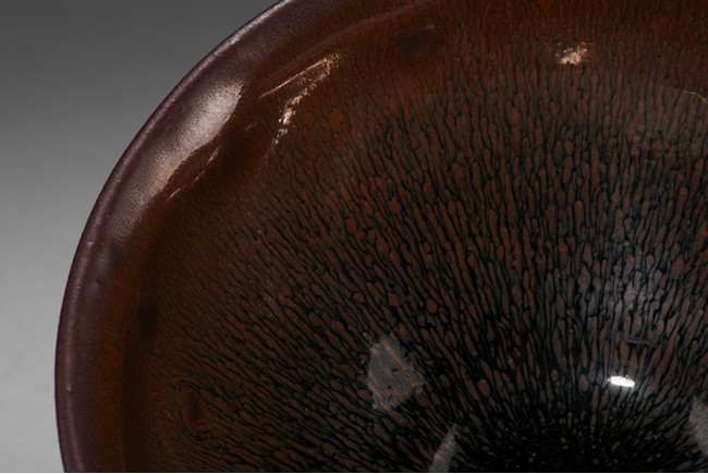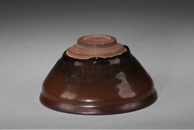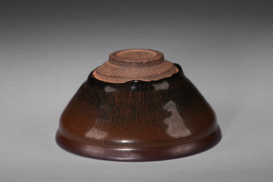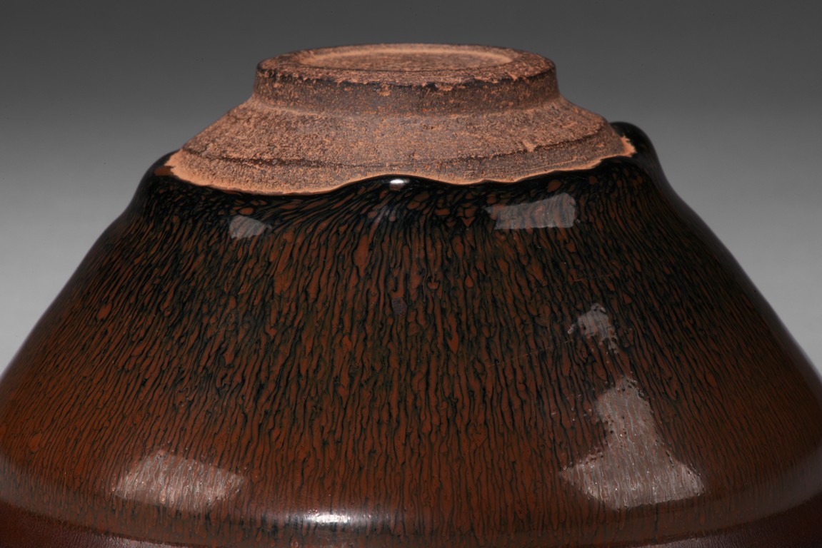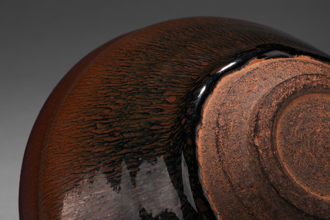 The deep rounded sides rising from a short straight foot to a lipped rim, covered overall in a black glaze with cascading reddish-brown streaks and falling short of the foot to reveal the purple-brown body.