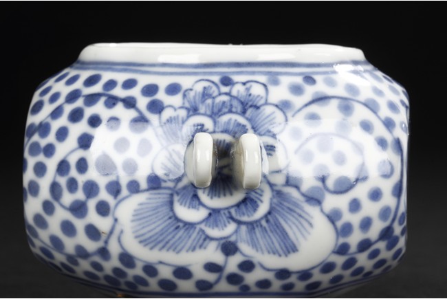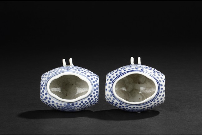 Each bird feeder is enamelled in blue and white with flowers reserved on blue dotted ground. Qing Dynasty period.